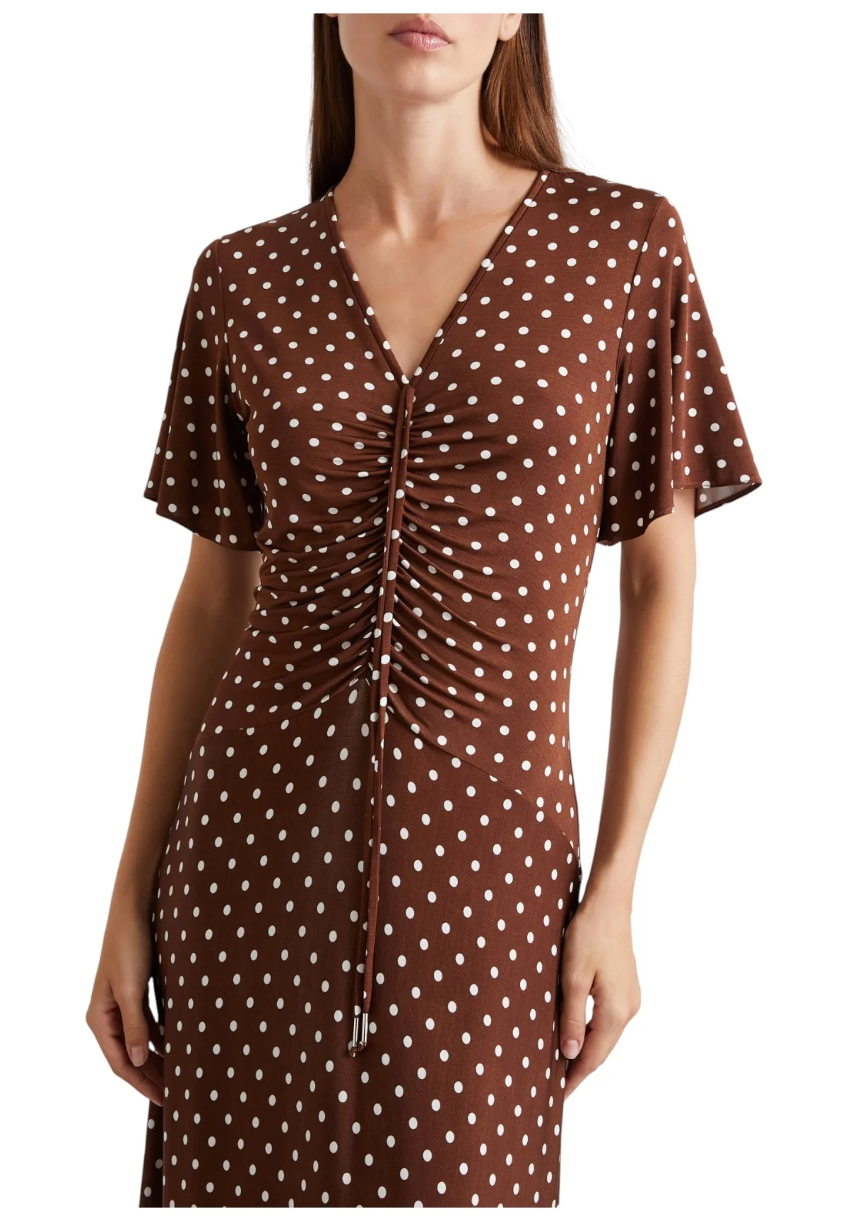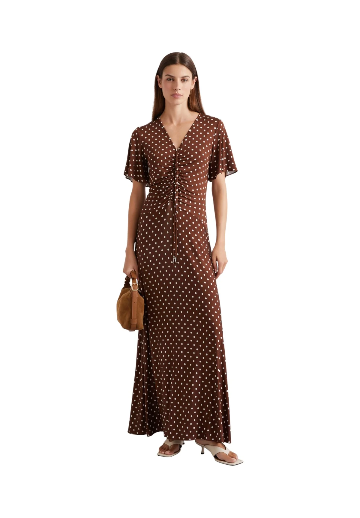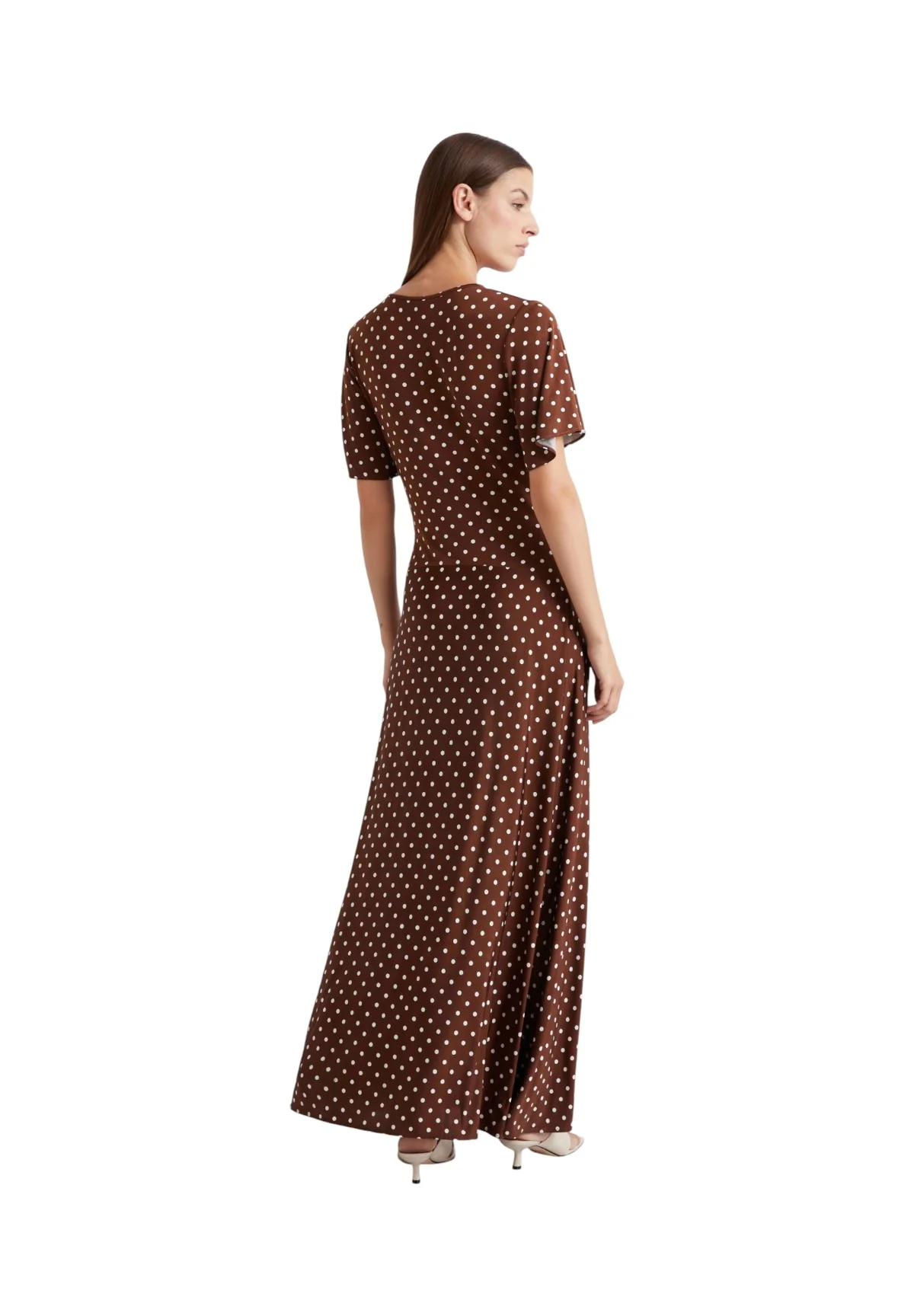 L’abito MLSTECA, di colore marrone, è un capo lungo in jersey che unisce stile e comfort. Questo abito, caratterizzato da una silhouette fit and flare, è arricchito da un motivo a pois giocoso che lo rende ideale per eventi informali, offrendo un tocco di eleganza leggera e moderna.