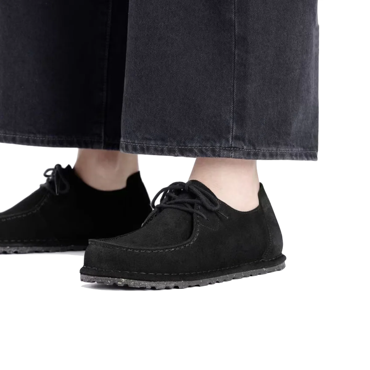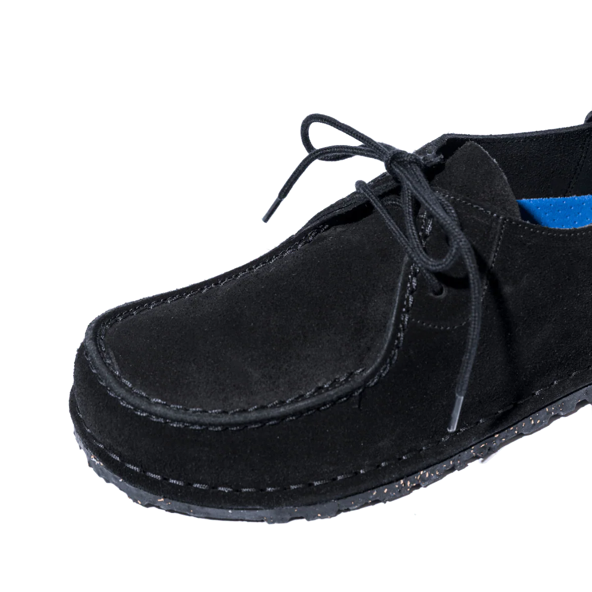 Scarpe allacciate comode, dalla forma del mocassino, con tomaia in pelle scamosciata nera. Plantare Deep Blue Birkenstock; anatomico ed estraibile. Suola in gomma caucciรน naturale, con dettagli in sughero. Linguetta morbida sul tallone, che permette di infilare e sfilare comodamente la scarpa