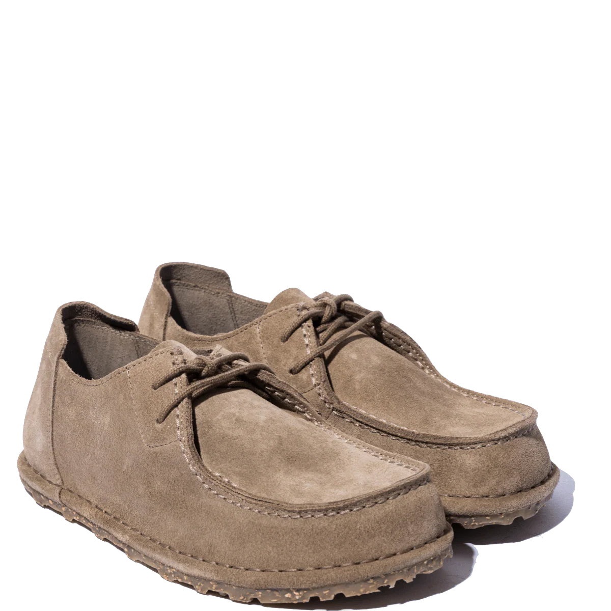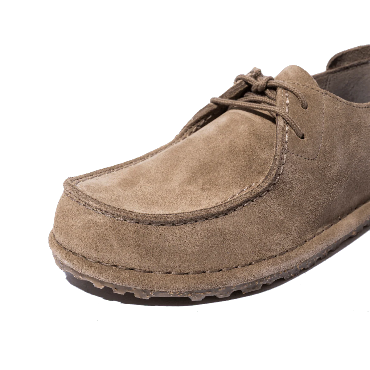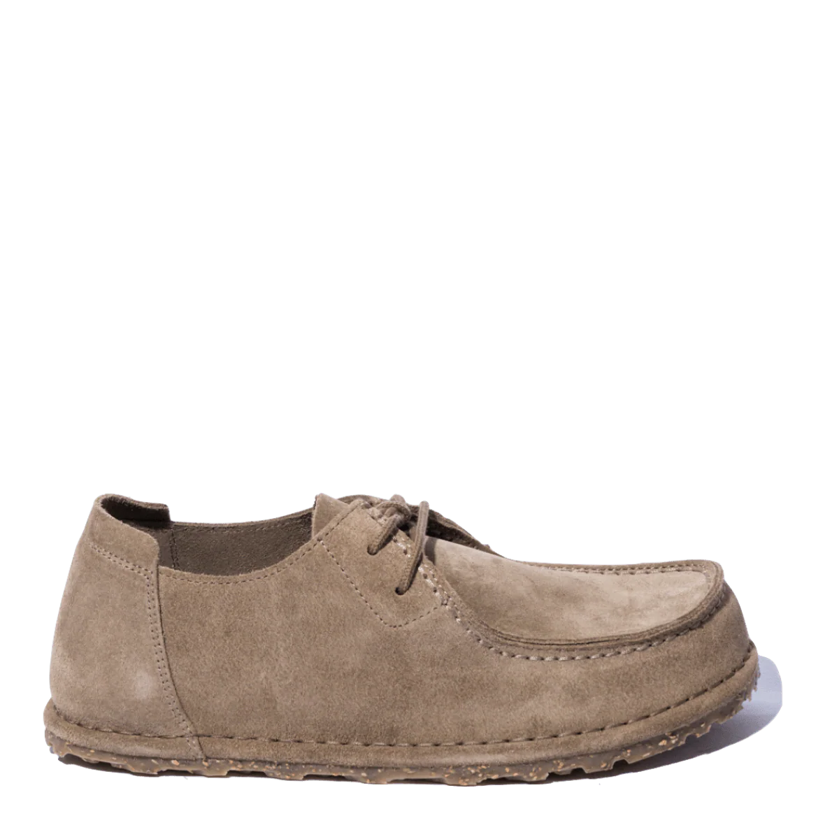 Scarpe allacciate comode, dalla forma del mocassino, con tomaia in pelle scamosciata color tortora. Plantare Deep Blue Birkenstock; anatomico ed estraibile. Suola in gomma caucciรน naturale, con dettagli in sughero. Linguetta morbida sul tallone, che permette di infilare e sfilare comodamente la scarpa