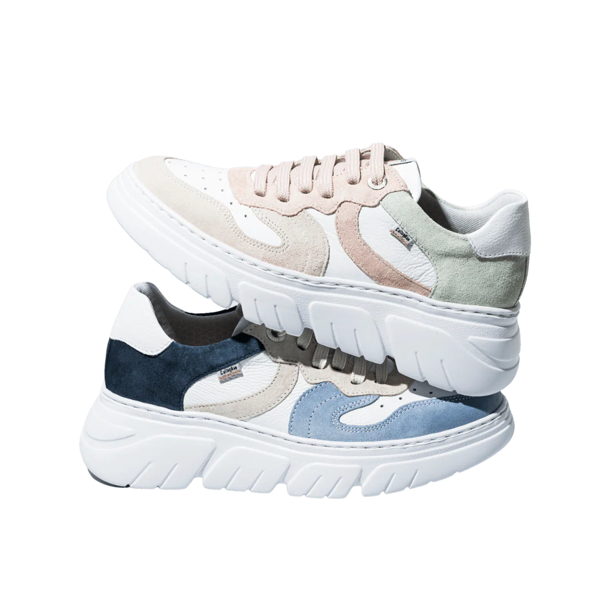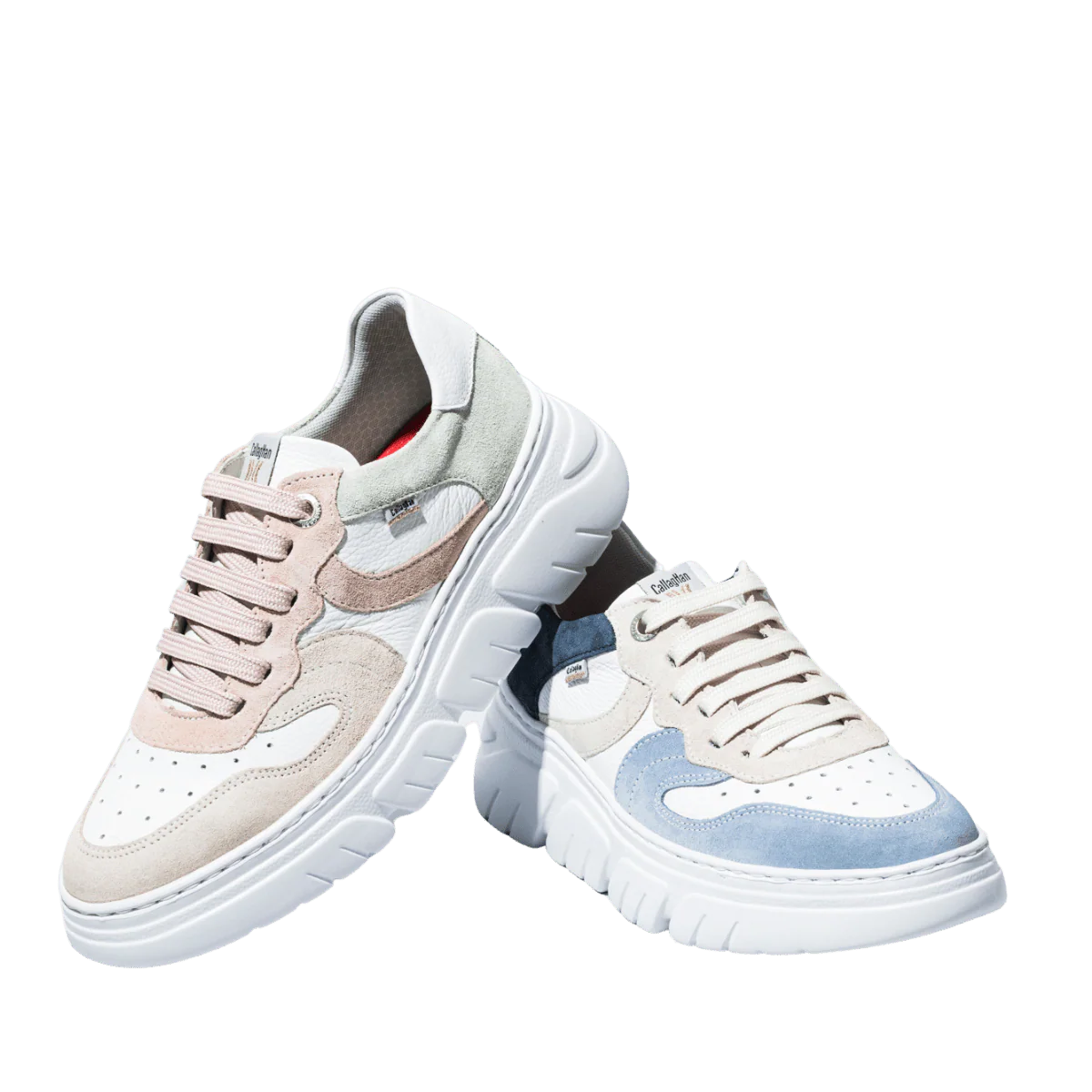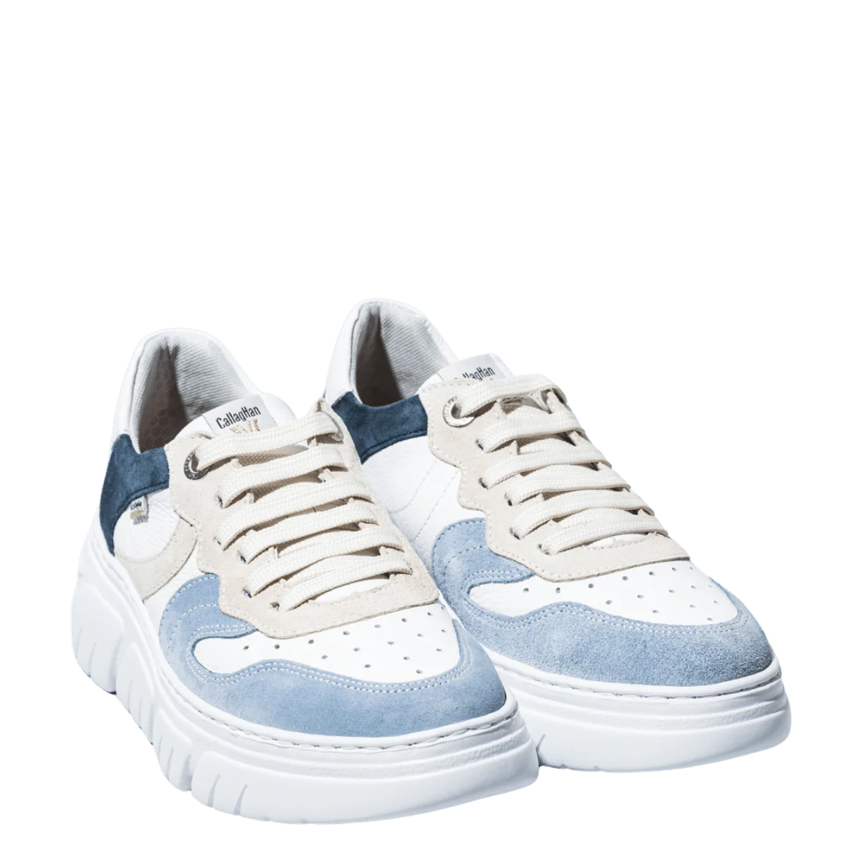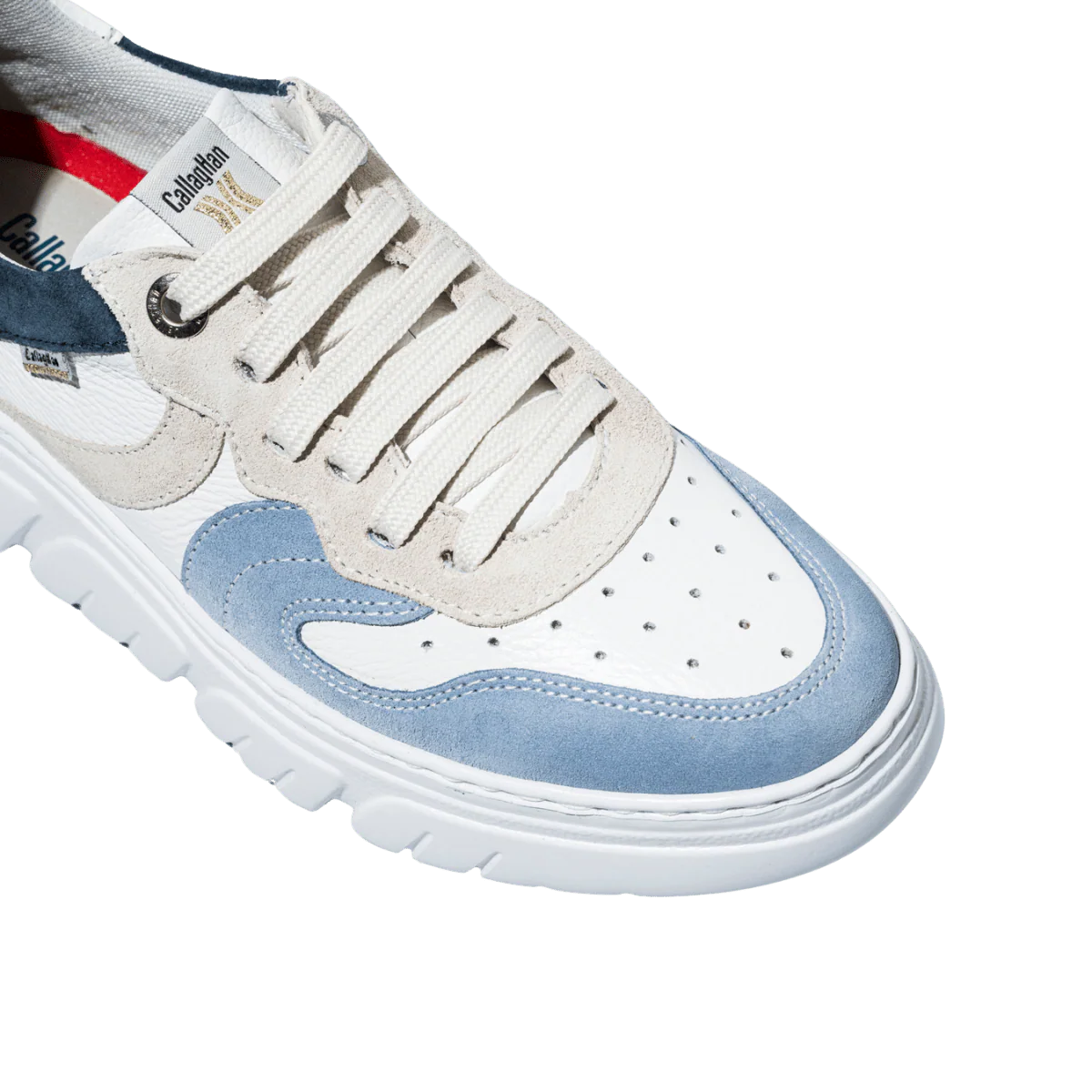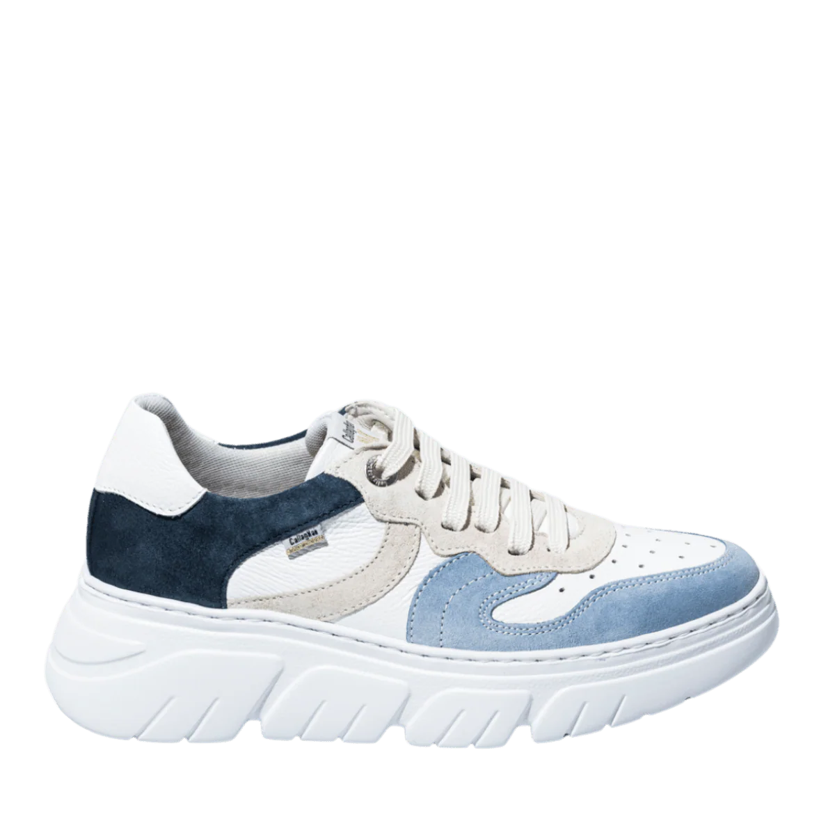 Scarpe allacciate che si adattano al piede e al suo aumento di larghezza quando si cammina (dai 5 mm agli 8 mm). Tomaia in pelle morbida bianca con inserti in pelle scamosciata beige, azzurro e blu: trattata con sistema impermeabilizzante. Fodera in tessuto traspirante; soletta ammortizzante ESTRAIBILE; suola in gomma con altezza del tacco di 5 cm