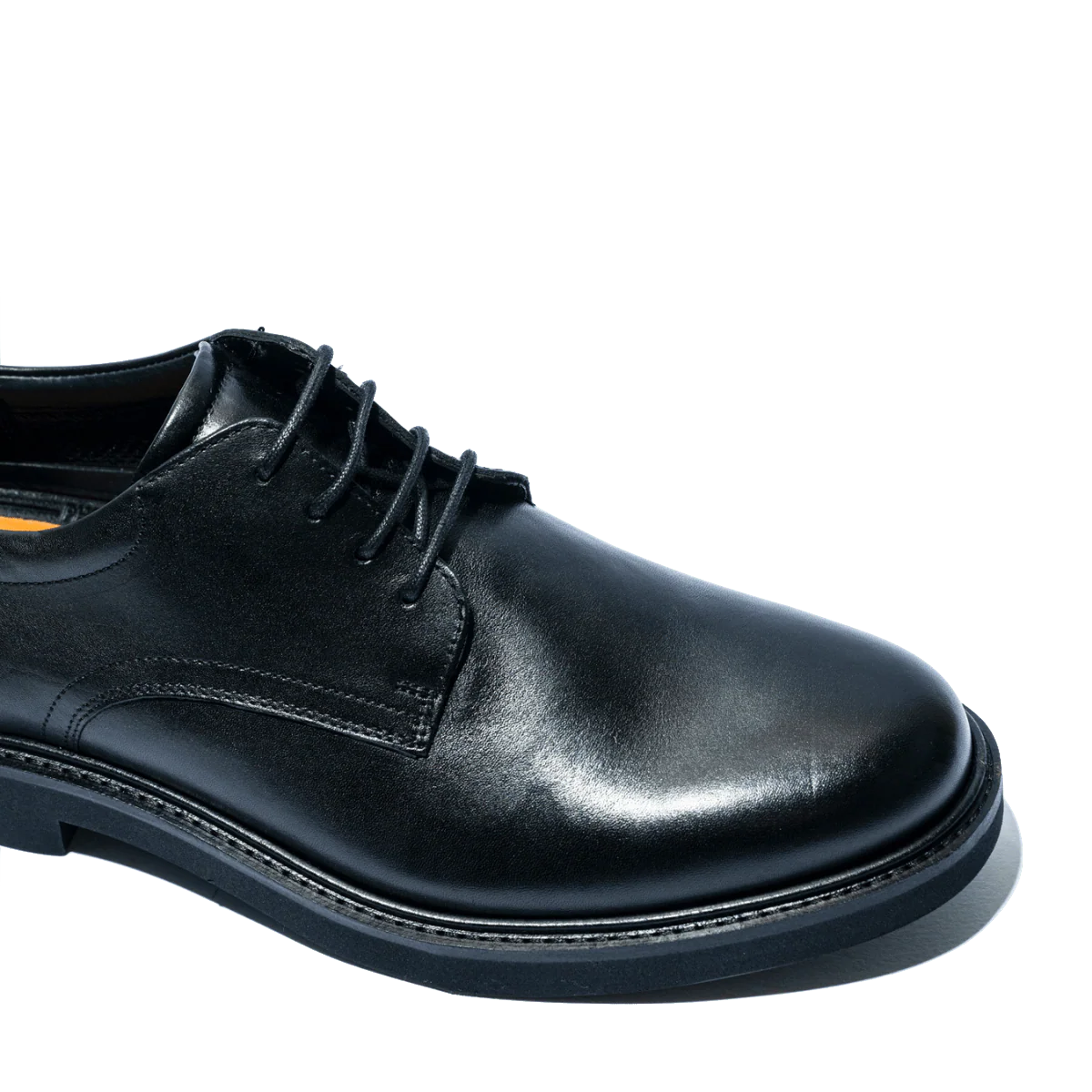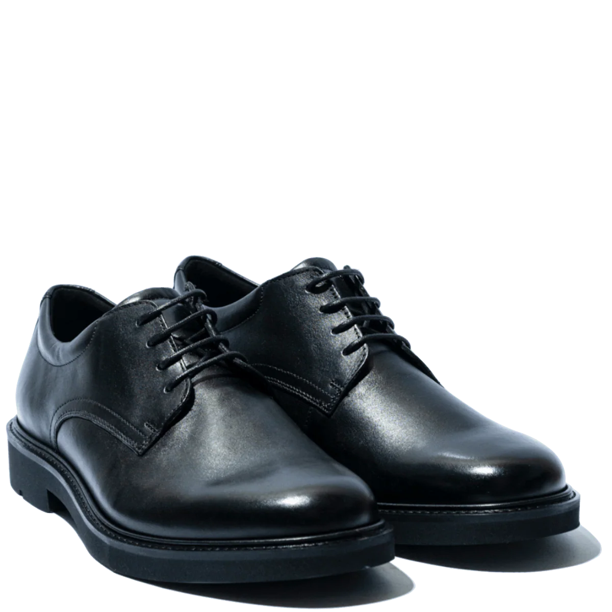 Scarpe classiche allacciate, modello derby, in pelle nera. Soletta confortevole, anatomica, estraibile; piรน soletta “dual fit” per una doppia calzata, piรน ampia o piรน aderente. Punta spaziosa, per l’inserimento di un plantare personale. Suola in gomma leggera e ultra flessibile, realizzata con la tecnologia Ecco Fluidform, che offre comfort e stabilitร alla camminata