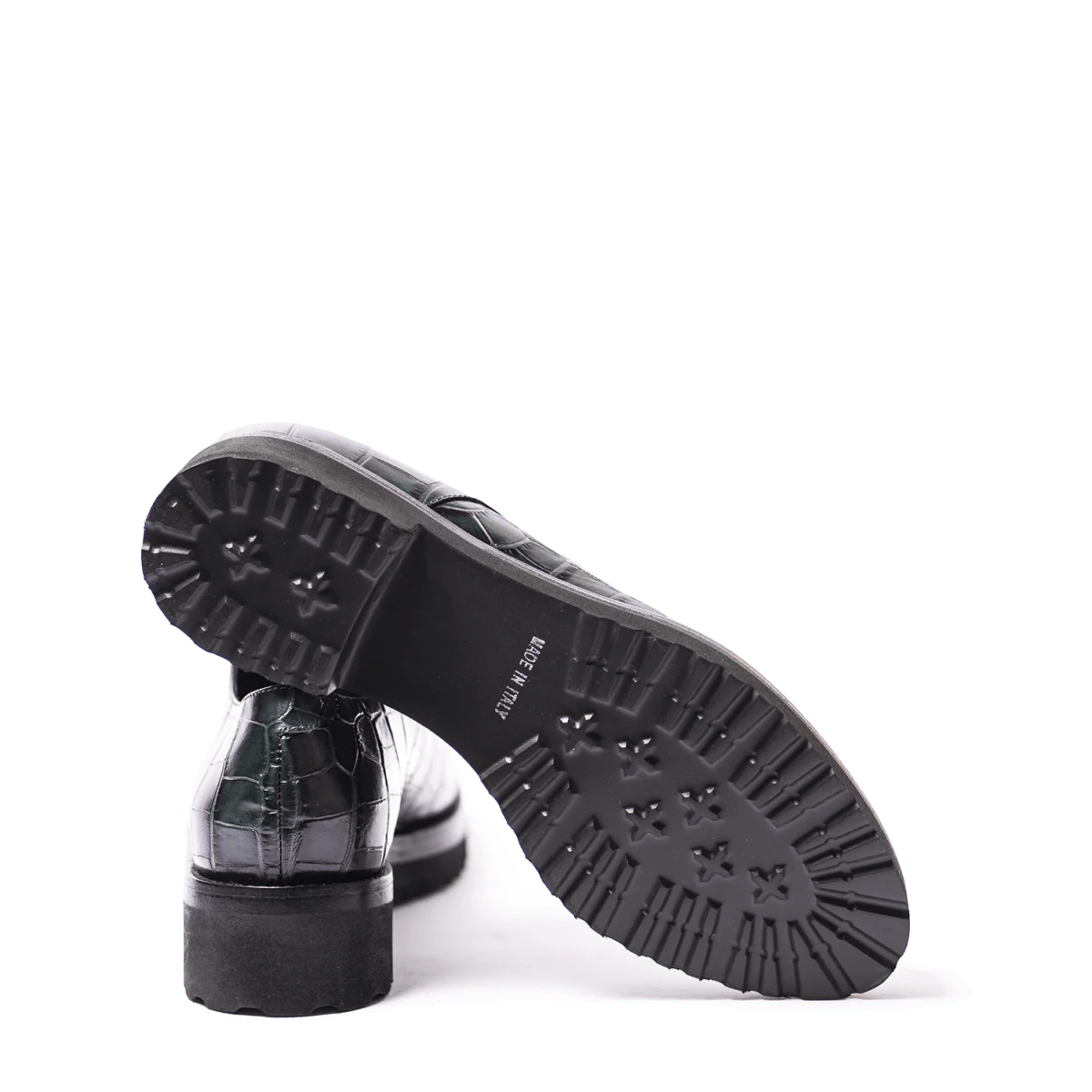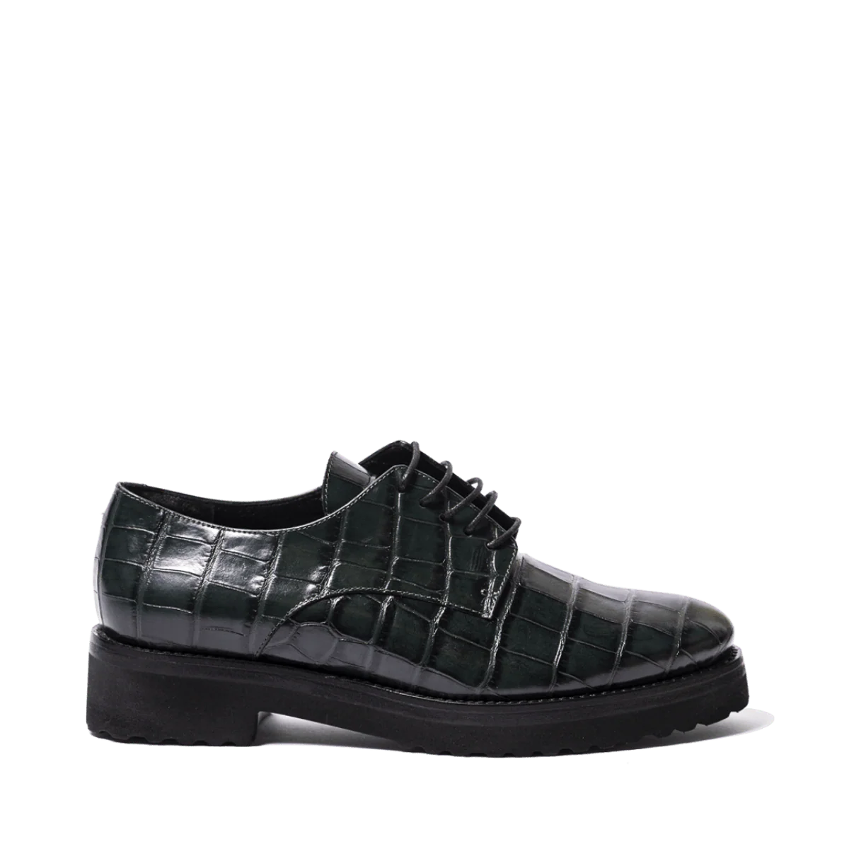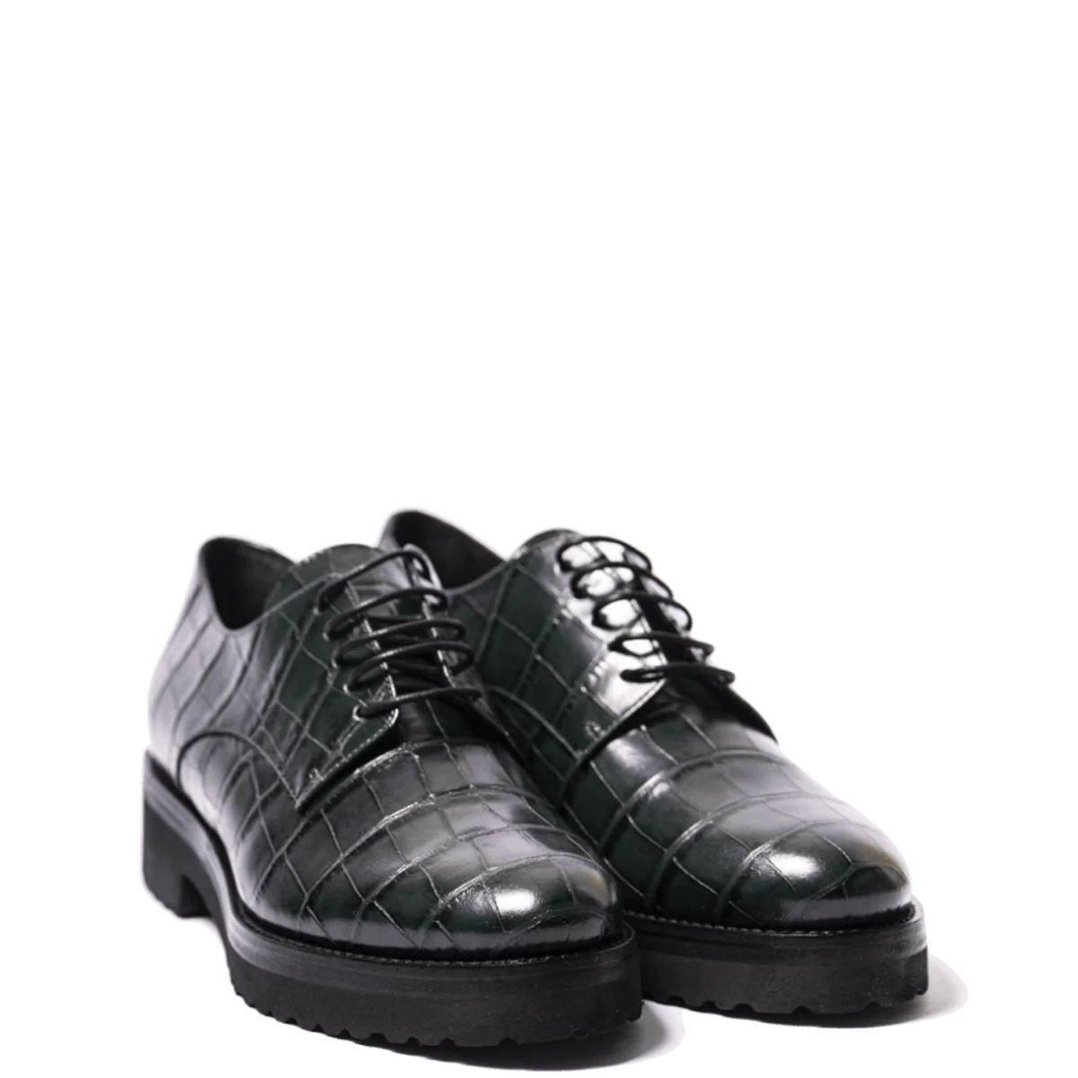Scarpe comode allacciate in pelle stampata coccodrillo, colore verde scuro. Completamente realizzate in Italia, utilizzando materiali di alta qualitร  provenienti dal distretto conciario della Toscana. Fondo in gomma Calzata: giusta