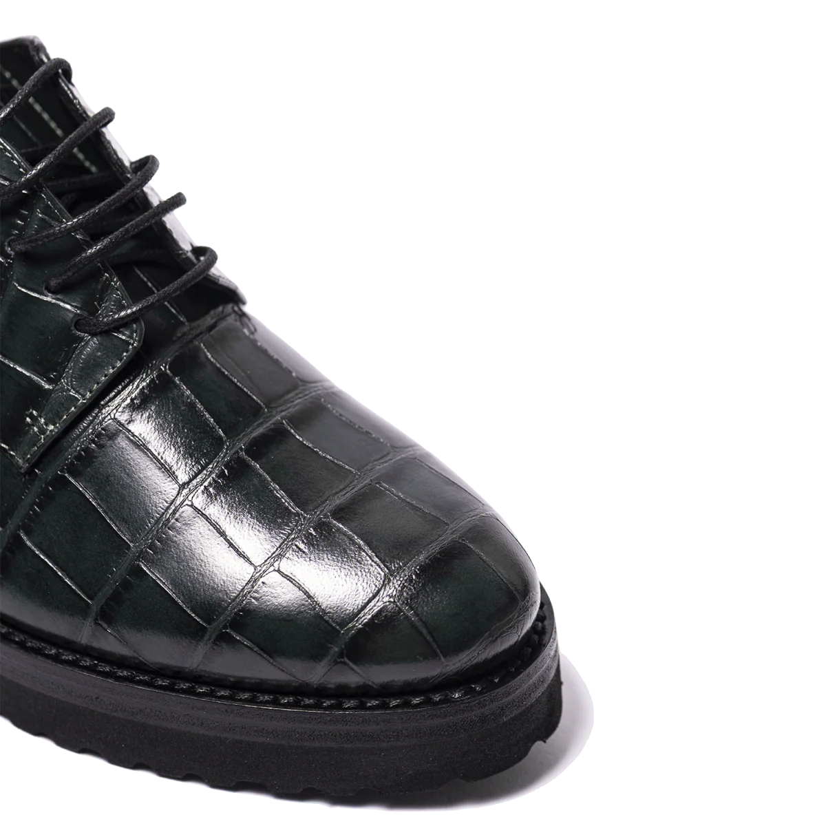 Scarpe comode allacciate in pelle stampata coccodrillo, colore verde scuro. Completamente realizzate in Italia, utilizzando materiali di alta qualitร  provenienti dal distretto conciario della Toscana. Fondo in gomma