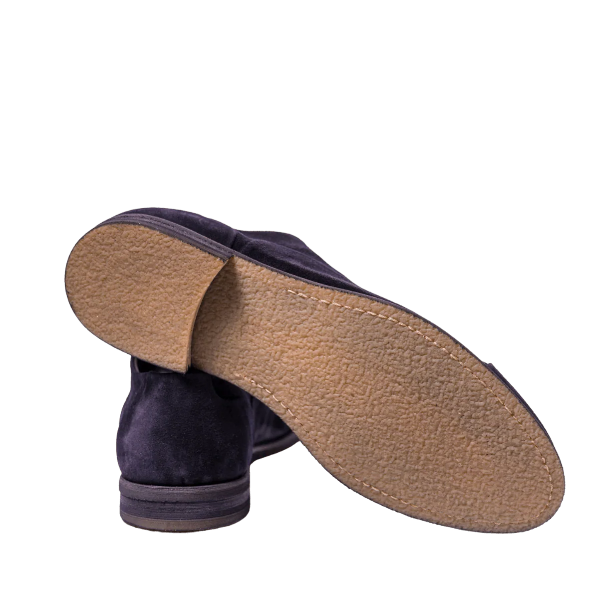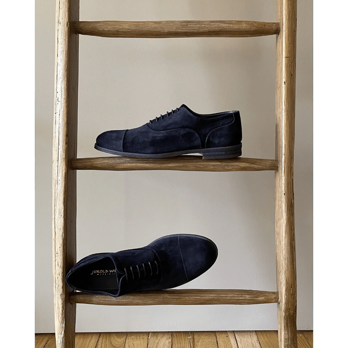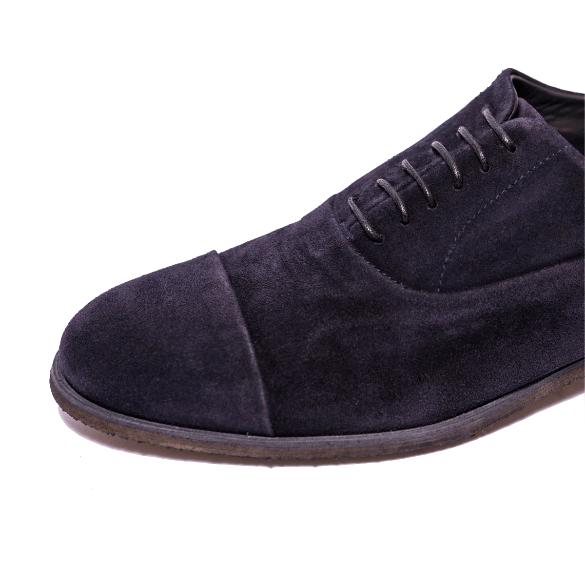 Scarpe classiche allacciate, modello francesina, in pelle scamosciata morbidissima, blu. Interno sfoderato. Realizzate secondo la tradizione manifatturiera artigianale, radicata nel territorio campano. Cuciture realizzate a mano. Fondo in gomma ultra leggera, cucito sul cuoio