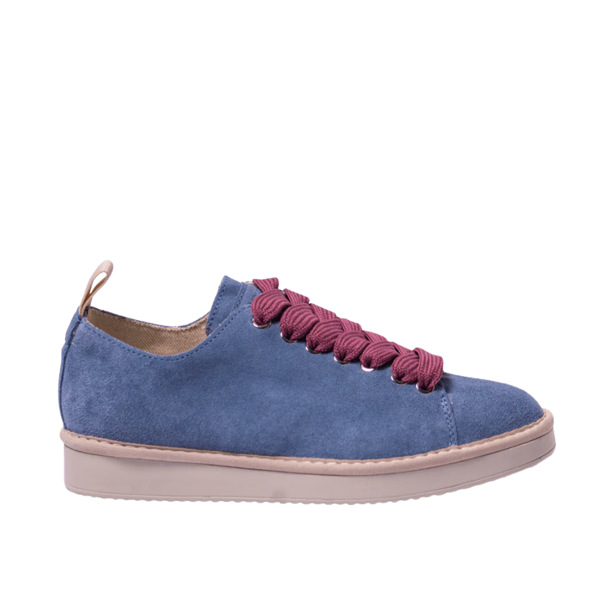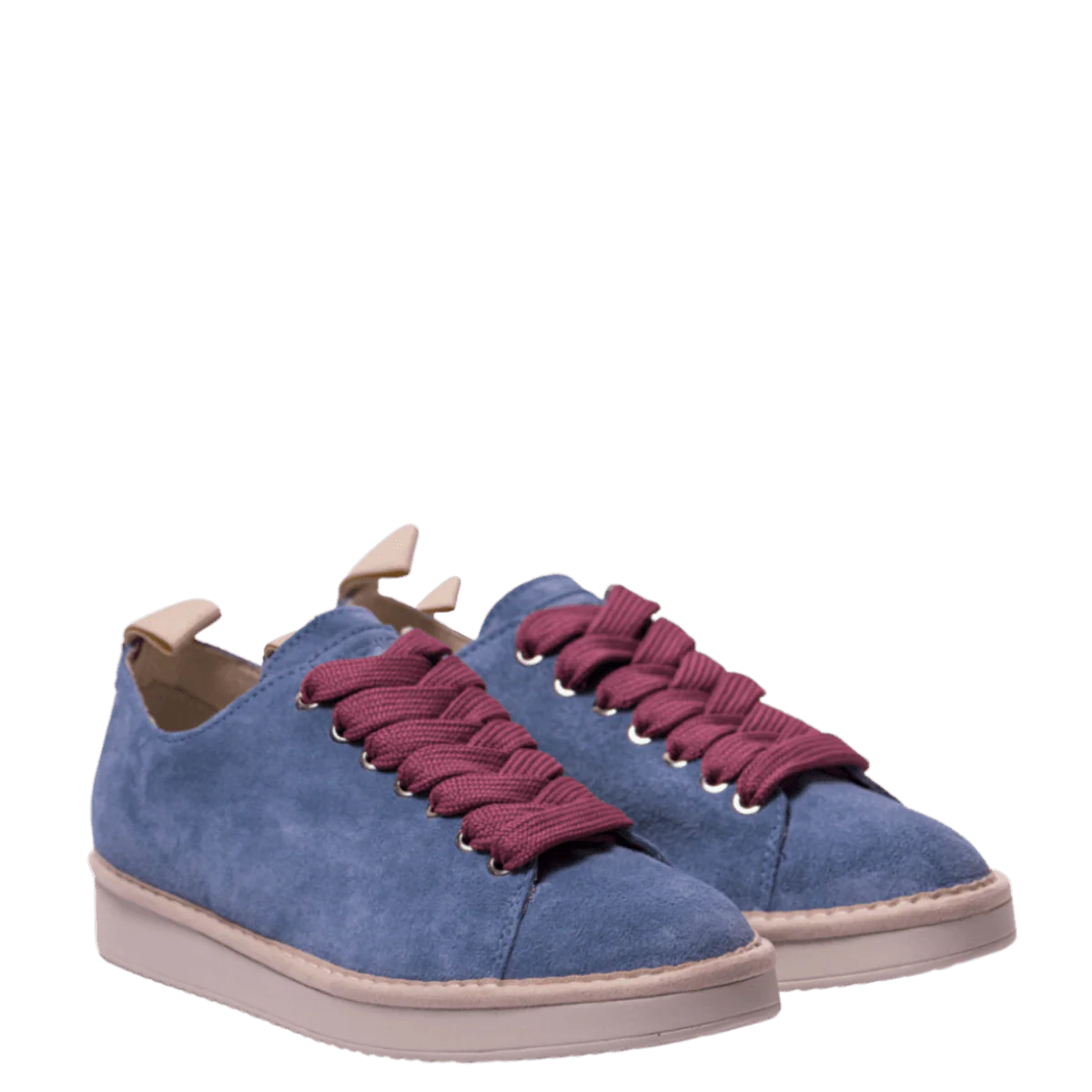Scarpe allacciate in camoscio sostenibile, dai colori del cielo, azzurro con lacci a contrasto, color lilla. Fondo in gomma Sono presenti all’interno della scatola i lacci neutri, in tinta con la suola Calzata: giusta
