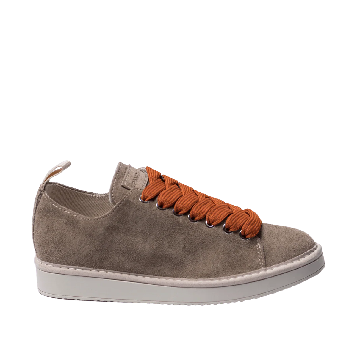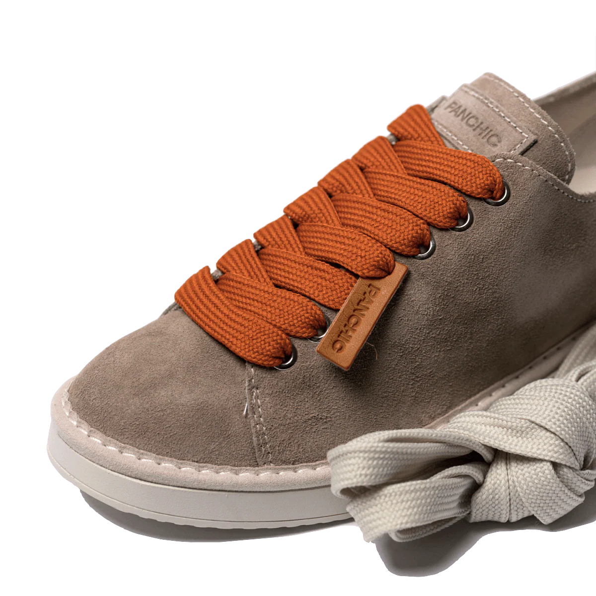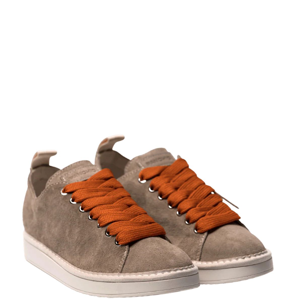 Scarpe allacciate, dai colori caldi della terra, in camoscio sostenibile beige con lacci a contrasto, arancioni. Fondo in gomma Sono presenti all’interno della scatola i lacci neutri, in tinta con la suola Calzata: giusta