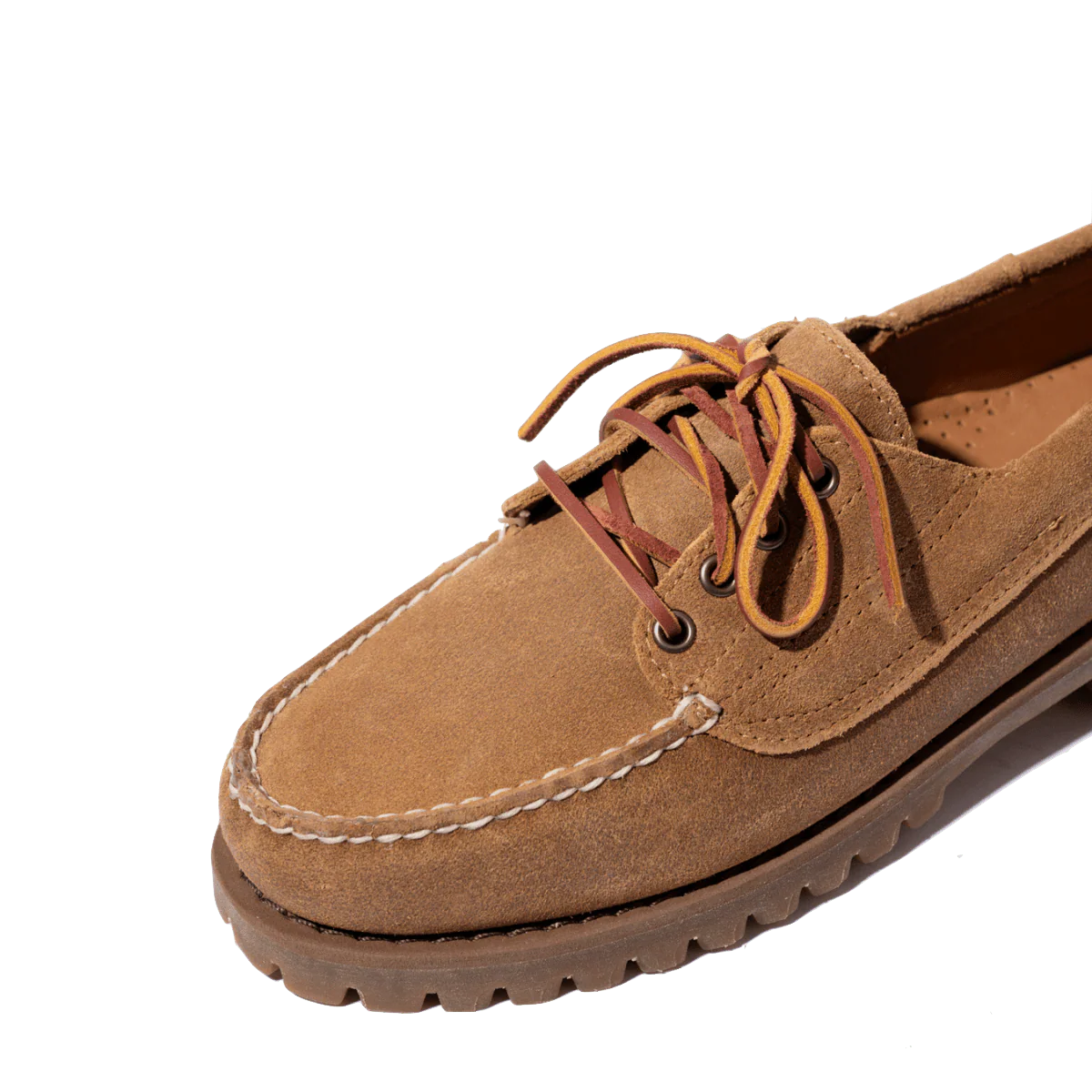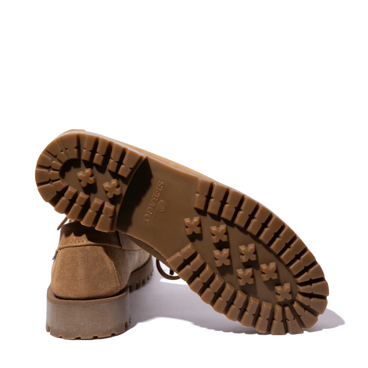 Scarpe allacciate del marchio italiano Sebago, con tomaia in pelle scamosciata, molto robusta, beige. Il nome della scarpa รจ preso dalla parola “serpente” nella lingua dei nativi americani Algonquin, una tribรน che viveva nei territori del Nord America a cui il serpente era sacro. Suola in gomma carro armato, per una massima aderenza ma anche flessibilitร . Lacci in cuoio. La lavorazione รจ artigianale, con cuciture fatte a mano.