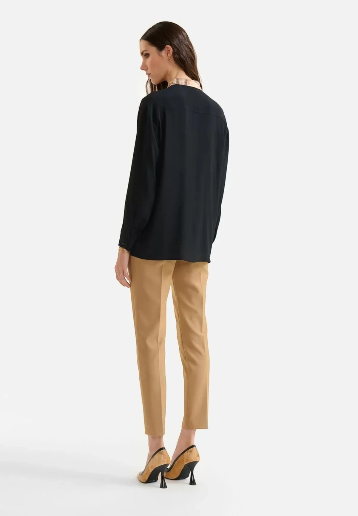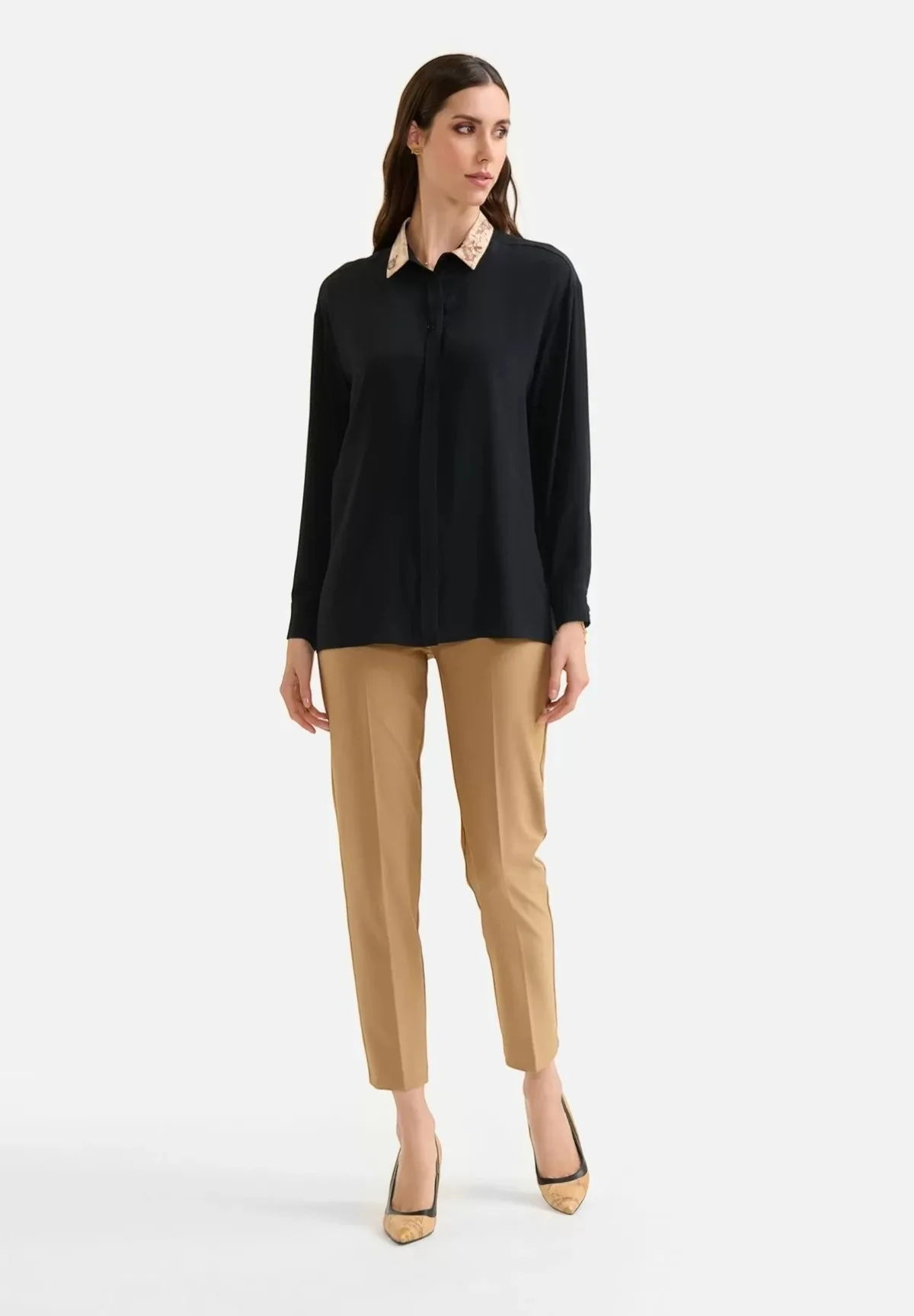 La camicia a maniche lunghe nera Alviero Martini 1a Classe si presta ad abbinamenti versatili: indossala con un paio di pantaloni eleganti color cioccolato per un look da ufficio impeccabile, oppure abbinala a una gonna lunga per serate speciali. Completa il tuo outfit con accessori minimalisti per un effetto chic o con gioielli piรน importanti per un’iniezione di glamour.