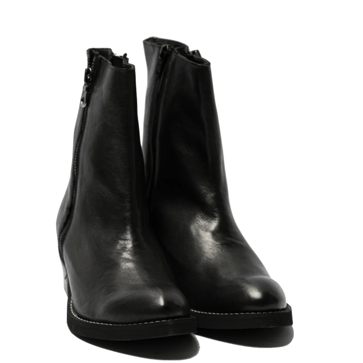 Stivaletti, dallo stile dei Camperos, realizzati nelle Marche dai piรน eccellenti artigiani, impiegando pellami di elevata qualitร , solamente di origine italiana. Tomaia in pelle morbida nera, con cerniera sul lato interno che facilita l’ingresso del piede e cerniera ornamentale sul lato esterno. Altezza sopra la caviglia. Fondo in gomma, con tacco squadrato di 4.3 cm