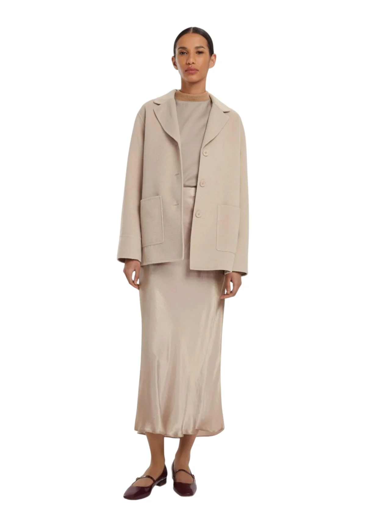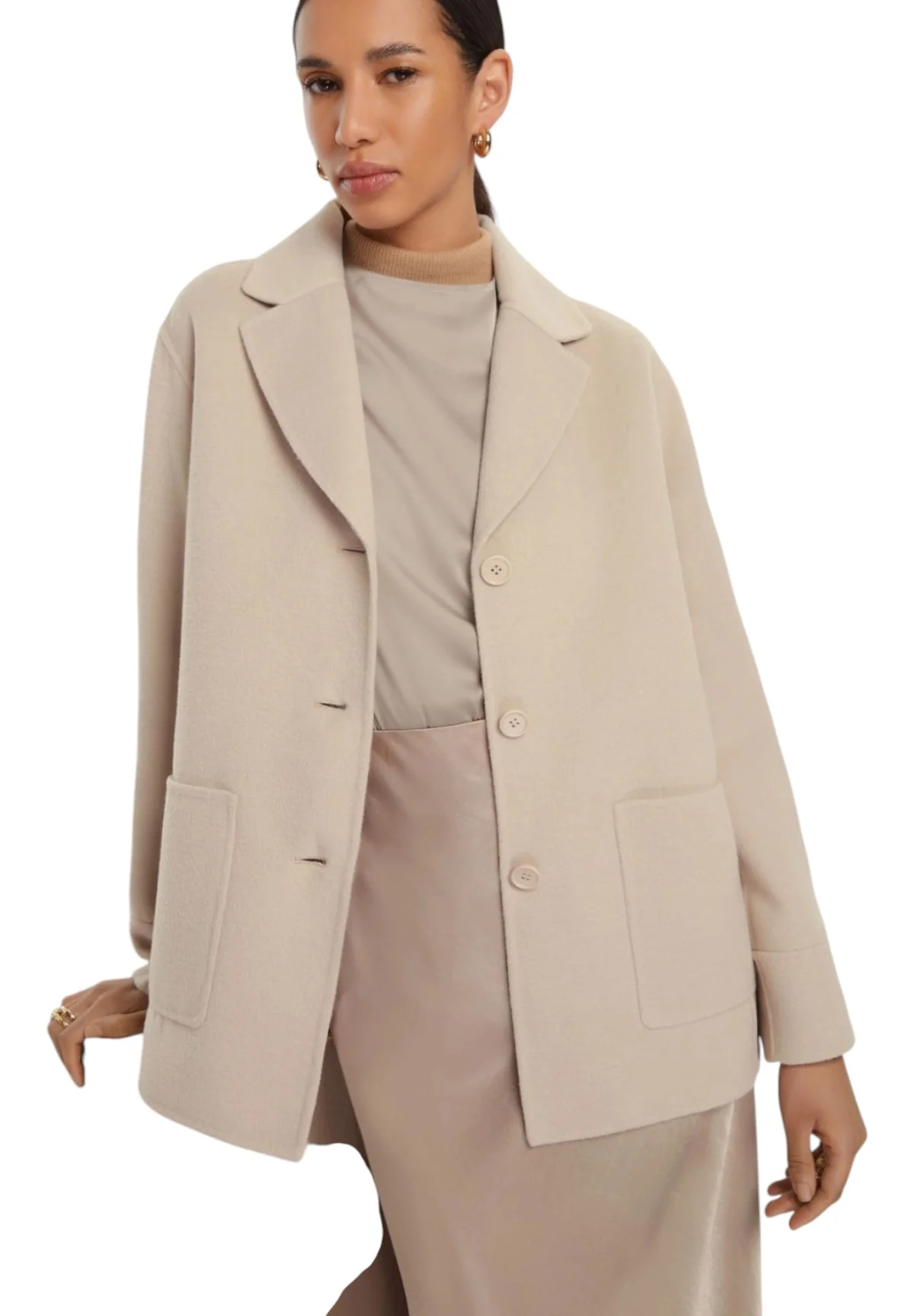 Per un look completo e ricercato, abbina il tuo Cappotto Emme Marella Beige Donna con pantaloni in tinta unita e una blusa color pastello. Completa l’outfit con stivaletti alla caviglia in pelle e una borsa a tracolla con dettagli metallici. Questo cappotto si integra perfettamente anche su un abito elegante per le serate speciali, offrendo sempre un tocco di classe.
