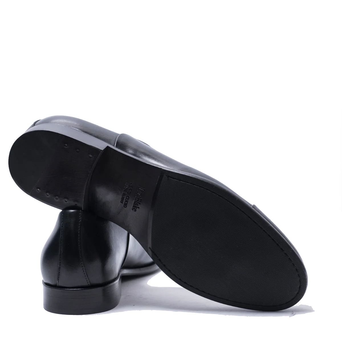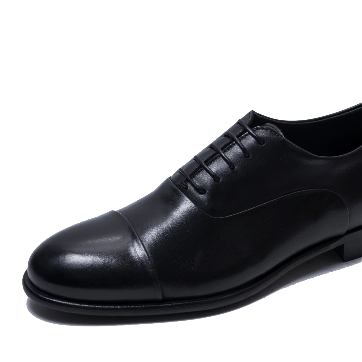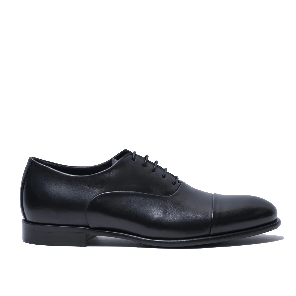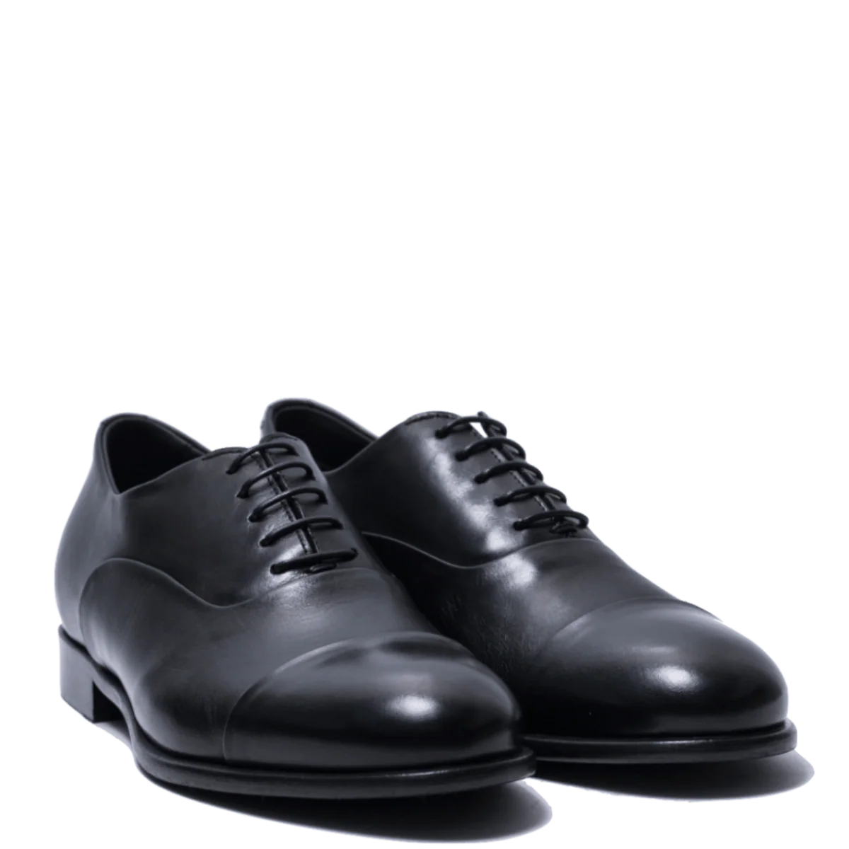 Scarpe classiche allacciate, modello francesina, in pelle nera. Tomaia morbida senza cuciture a vista: dettaglio che rende le calzature ancora piรน eleganti, particolarmente indicate nelle cerimonie. Interno foderato in pelle. Realizzate secondo la tradizione manifatturiera artigianale, radicata nel territorio campano. Cuciture realizzate a mano. Fondo in cuoio, con mezza gomma sottile.
