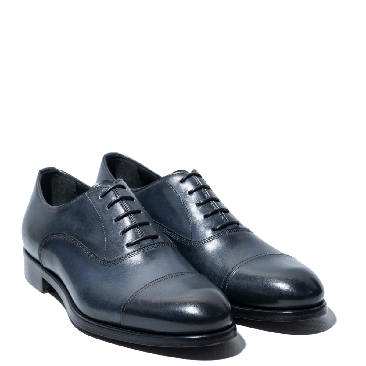 Scarpe classiche allacciate, modello francesina, in pelle blu; interno foderato in pelle, fondo in cuoio. Realizzate secondo la tradizione manifatturiera artigianale, radicata nel territorio campano. Cuciture realizzate a mano, con lavorazione Blake