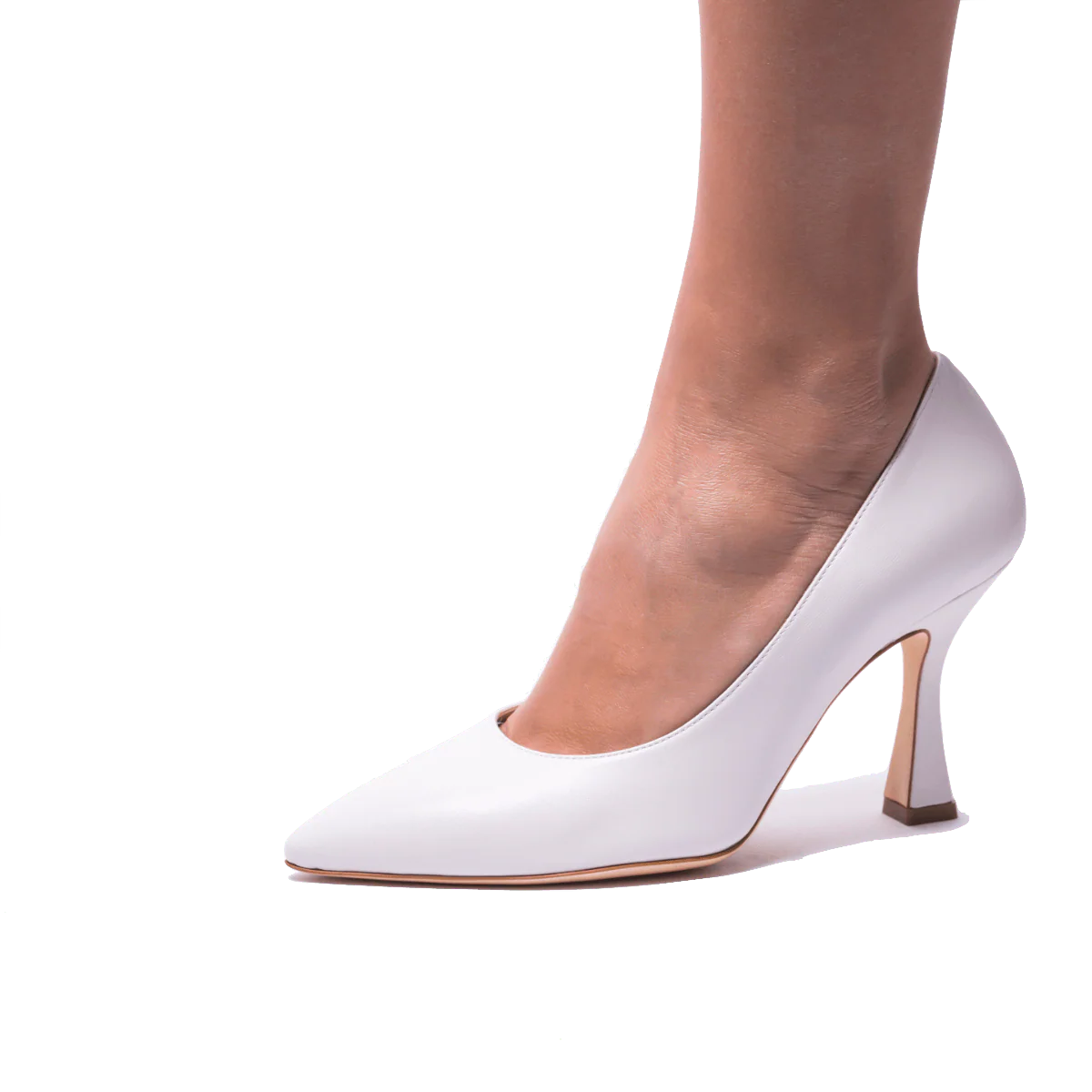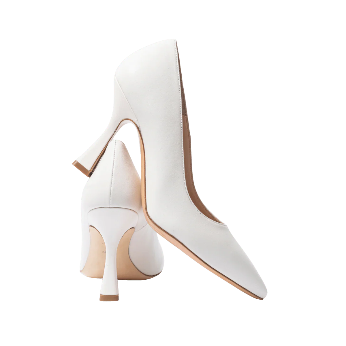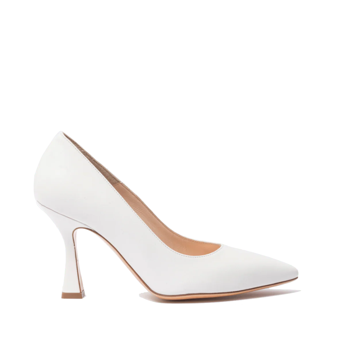 Décolleté realizzati in Italia dallo storico calzaturificio napoletano Melluso. Tomaia in pelle morbida bianca. Fodera in pelle; fondo in cuoio. Tacco a rocchetto, che da stabilità, di altezza 9 cm e larghezza 2 cm