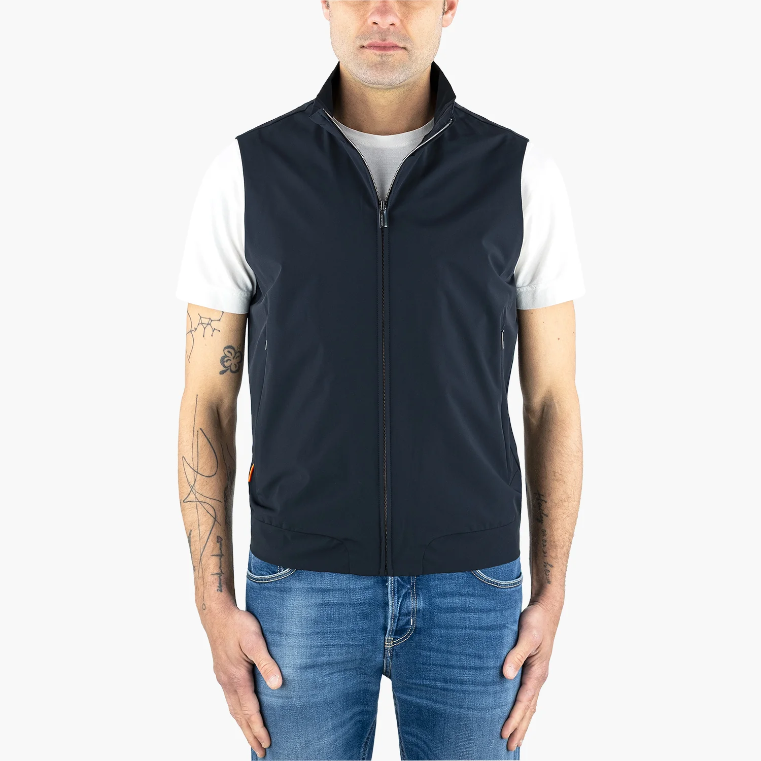 Gilet RRD Summer Cult Gilè Jkt 25008 Col. 60 Blue Black. Lo smanicato leggero ed essenziale presenta una costruzione raffinata, che gli consente di aderire al corpo con naturalezza. La purezza del design è enfatizzata dall’esterno in tessuto a membrana elasticizzato, impermeabile e traspirante. Il colletto verticale è chiuso dalla zip integrale, affiancata dalle ampie e comode tasche laterali a zip invisibile. L’interno presenta un pratico taschino chiuso a zip, ravvivato dall’emblematico doppio filetto arancio fluo e dalla tag a cuore “Made with love, designed in Tuscany”.