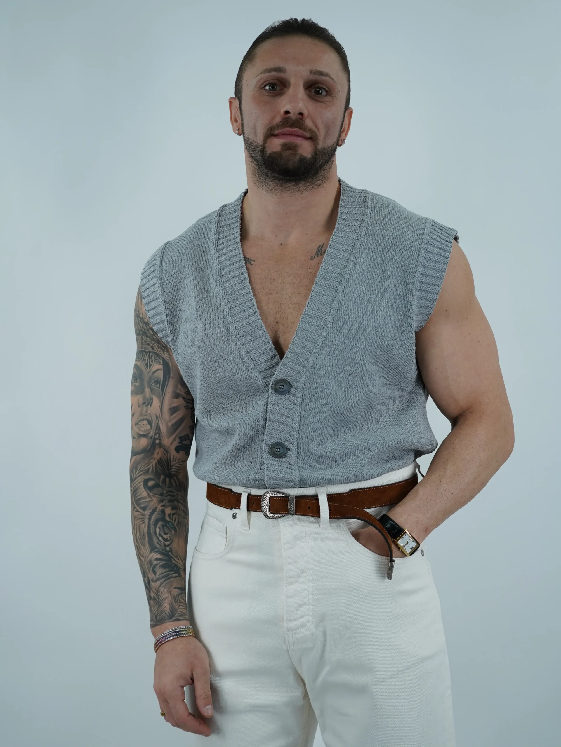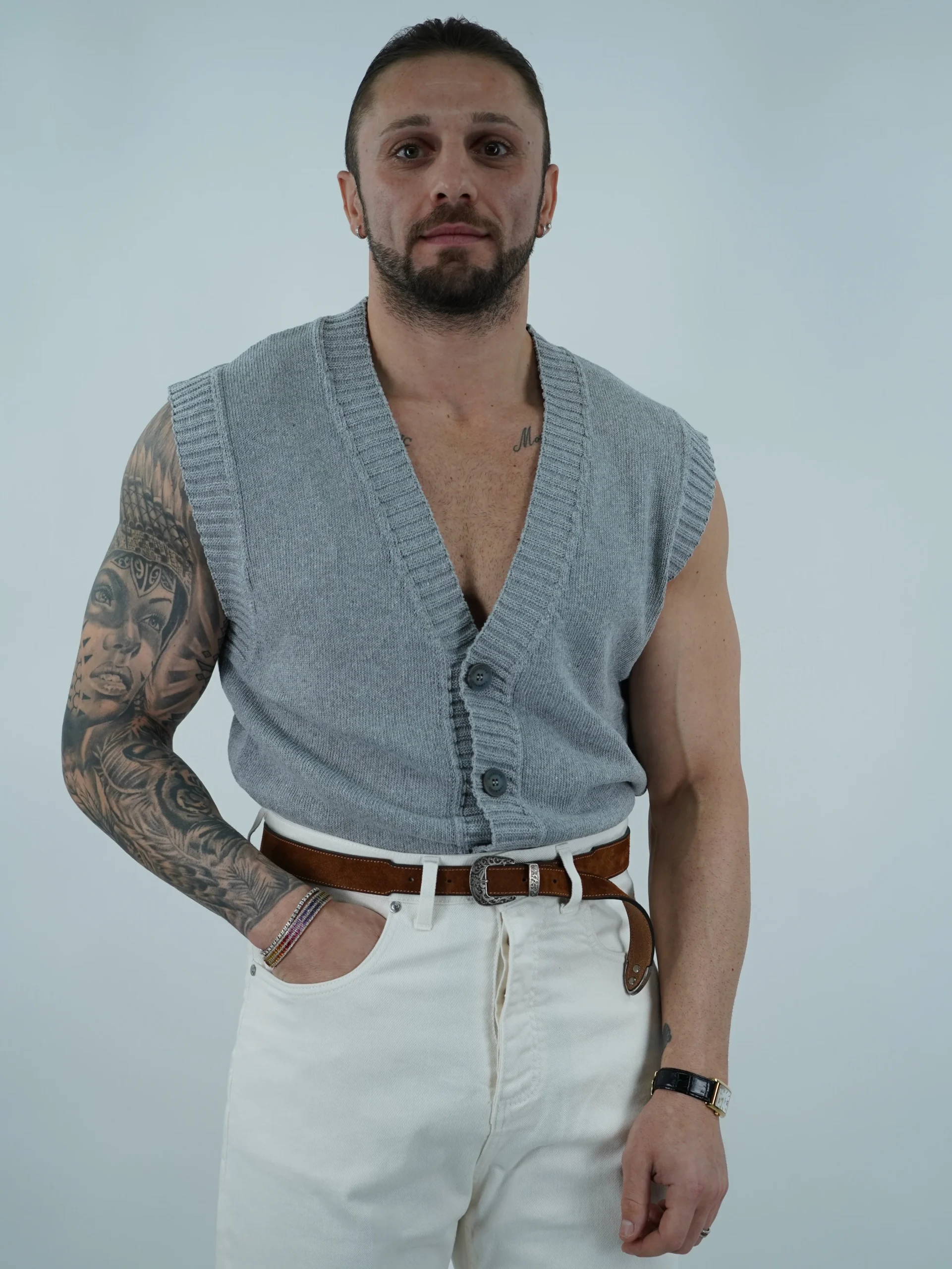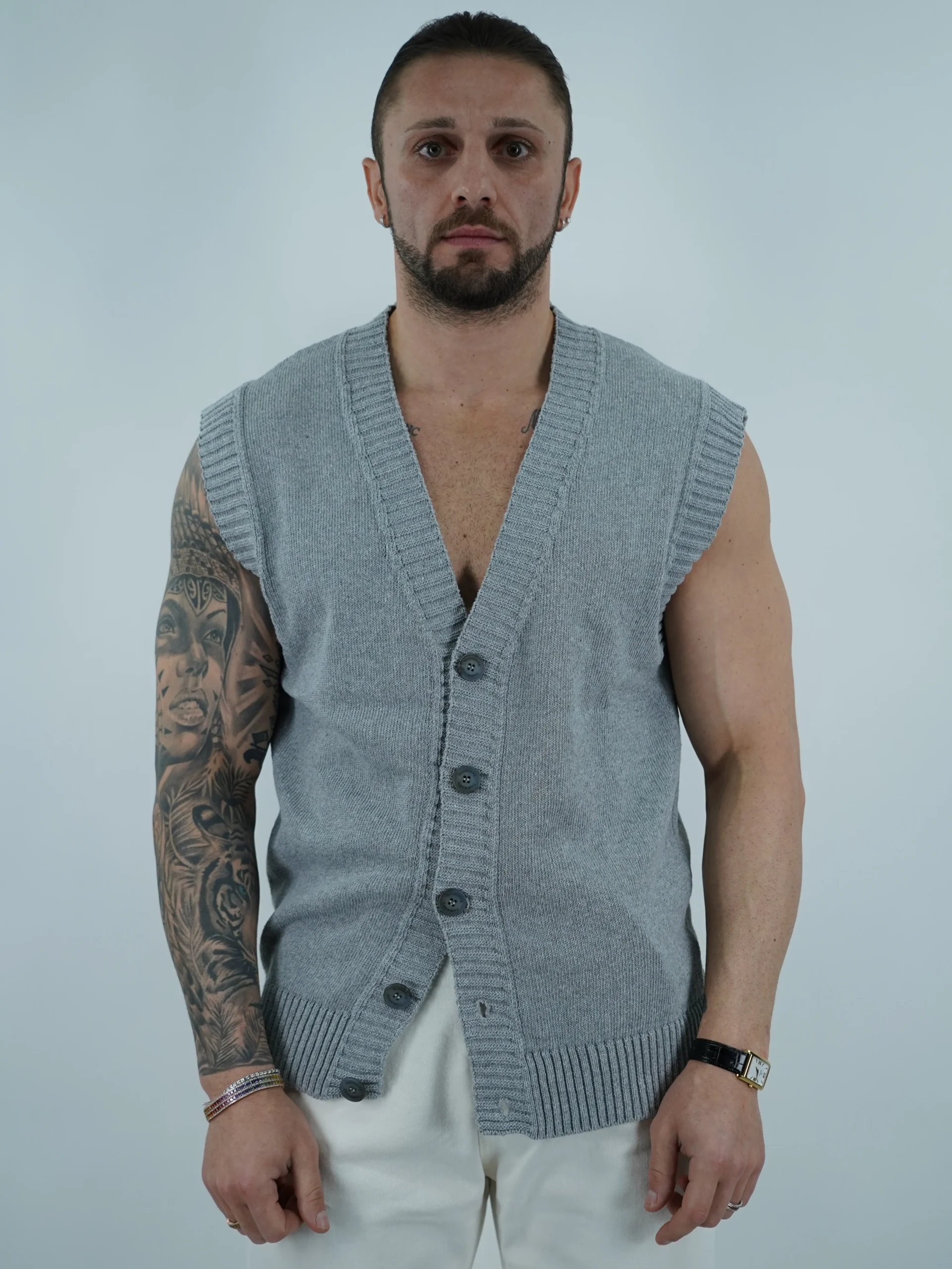 Gilet in cotone smacchinato. Vestibilità morbida. Il modello in foto è alto 180cm per 85kg indossa la Taglia L.