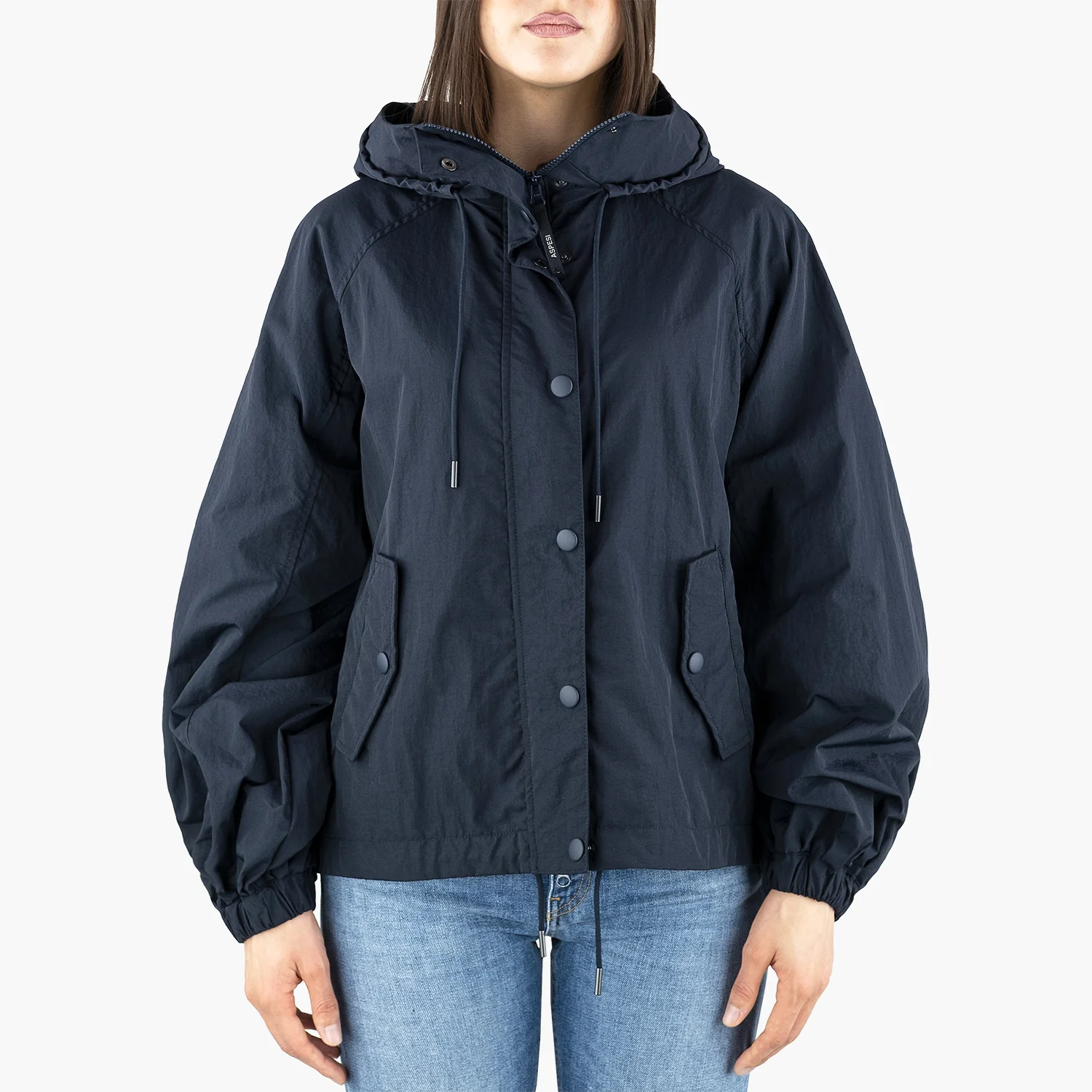 Giubbino ASPESI Lea N501 P051 in Micro Twill di Nylon Blu Navy. Giubbotto in micro twill di nylon idrorepellente dotato di cappuccio fisso regolabile tramite coulisse completata da finalini metallici logati ASPESI. Presenta una chiusura frontale con zip e bottoni a pressione nascosti, tasche con patta e bottone a pressione e ampie maniche con fondo arricciato.