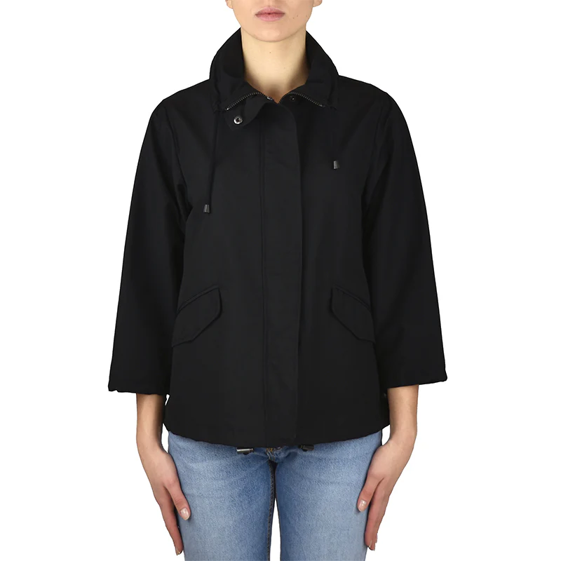 Giubbino ASPESI Salvia Collo in Piedi con lacci in corda nero. Modello svasato con piegone sul retro. Due tasche oblique sul davanti. Chiusura centrale con zip e patta antivento.