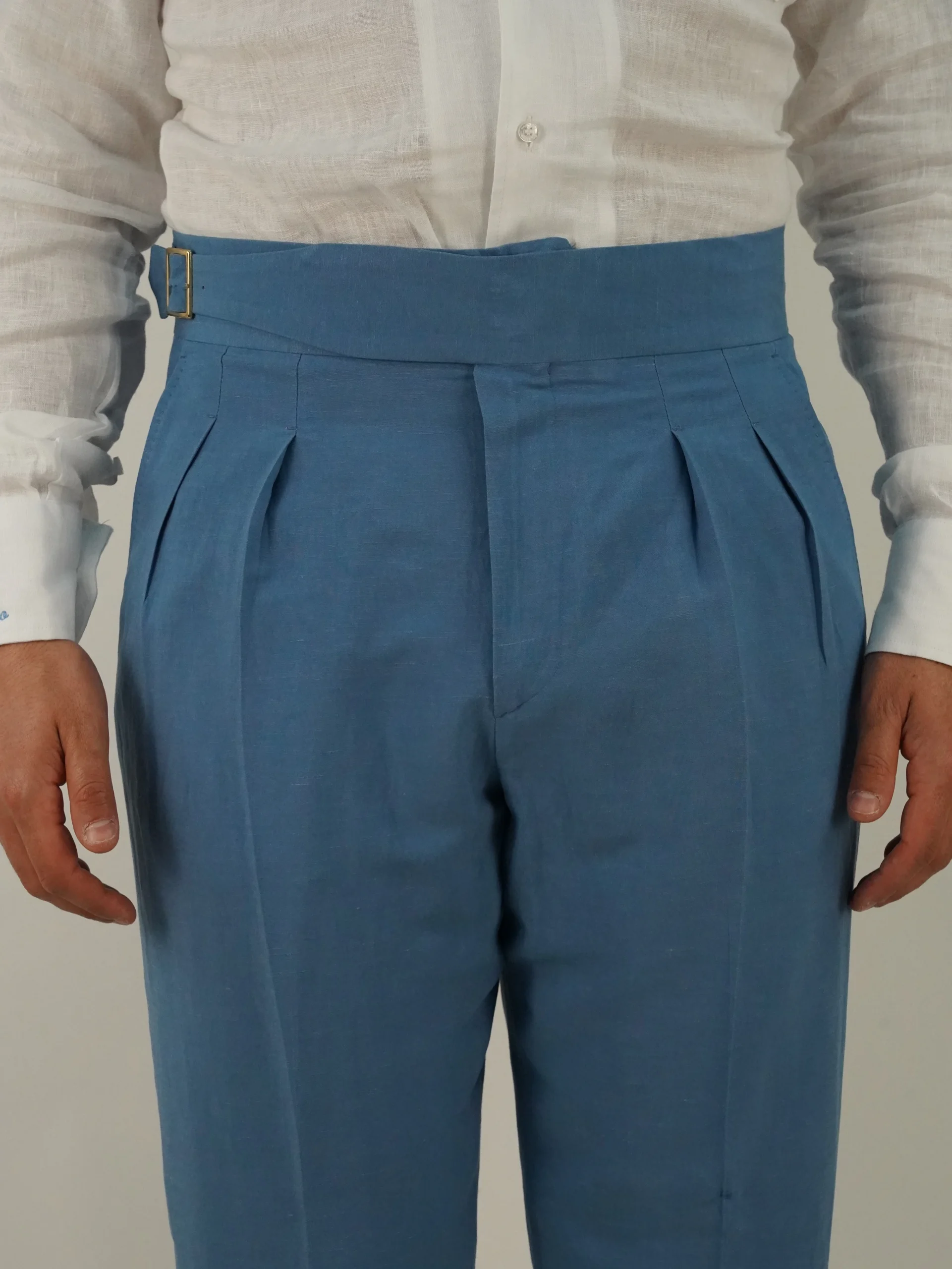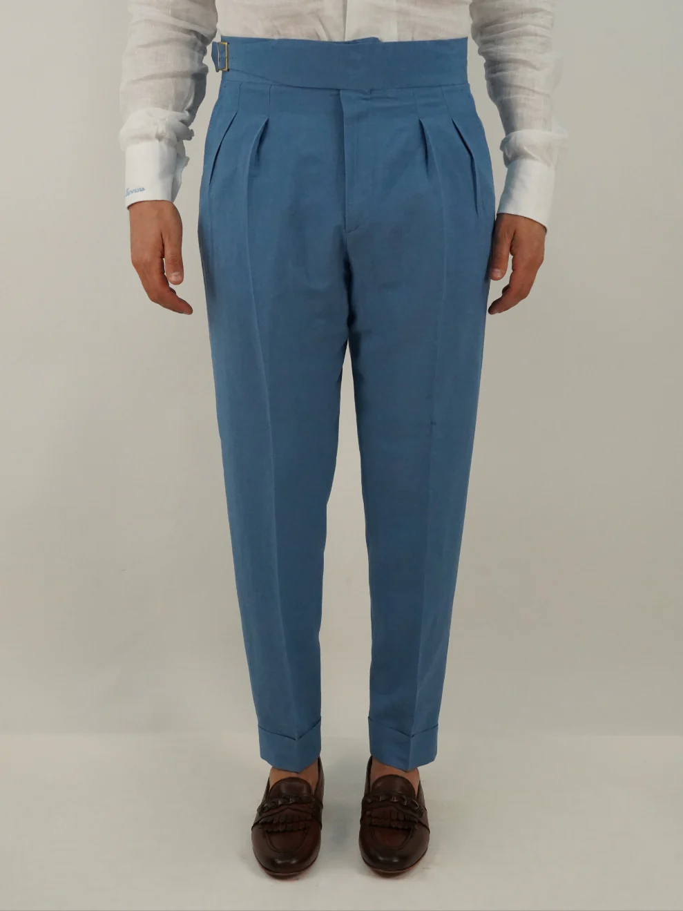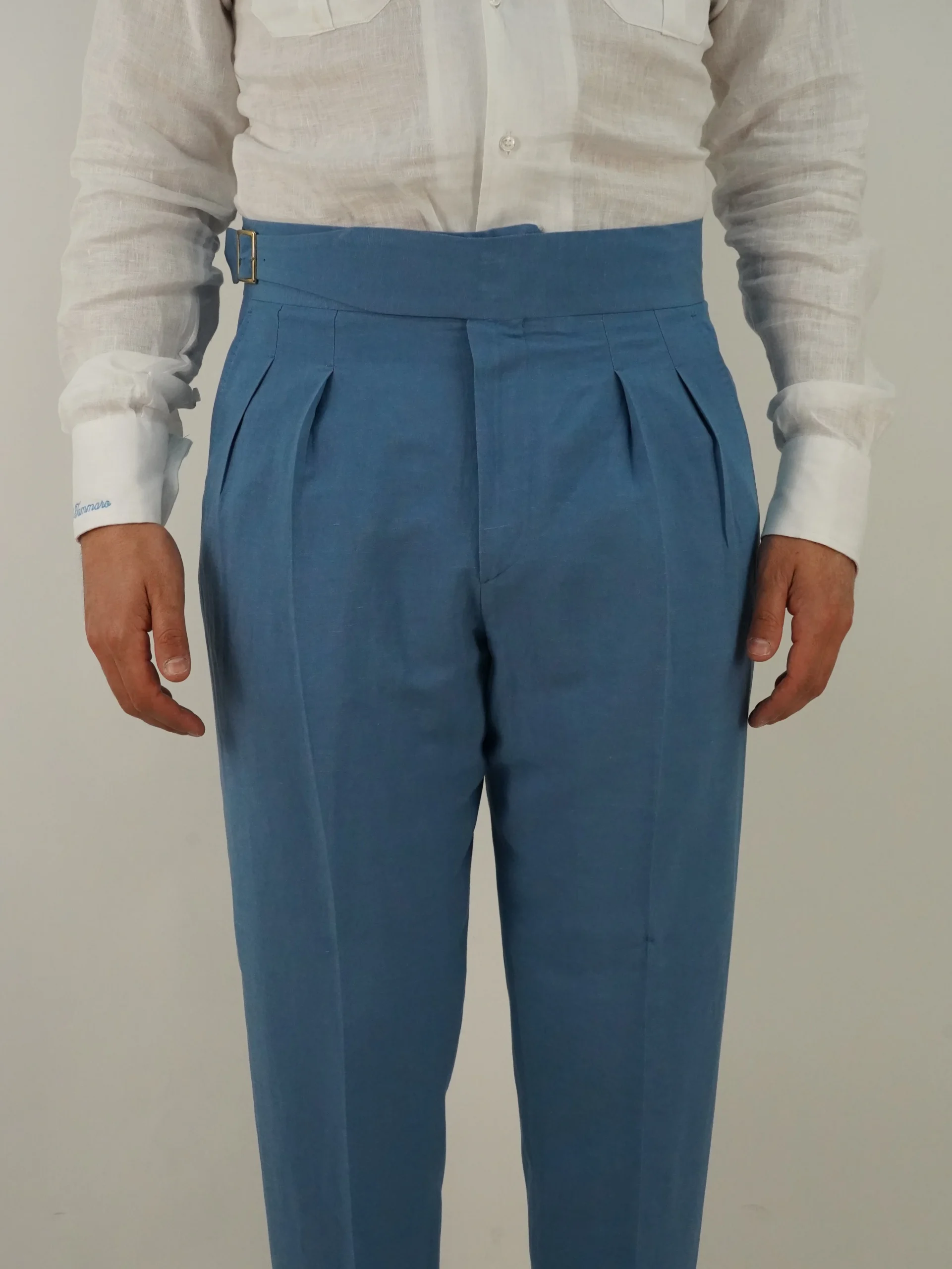 Gurkha in lino azzurro con fibbia laterale regolabile