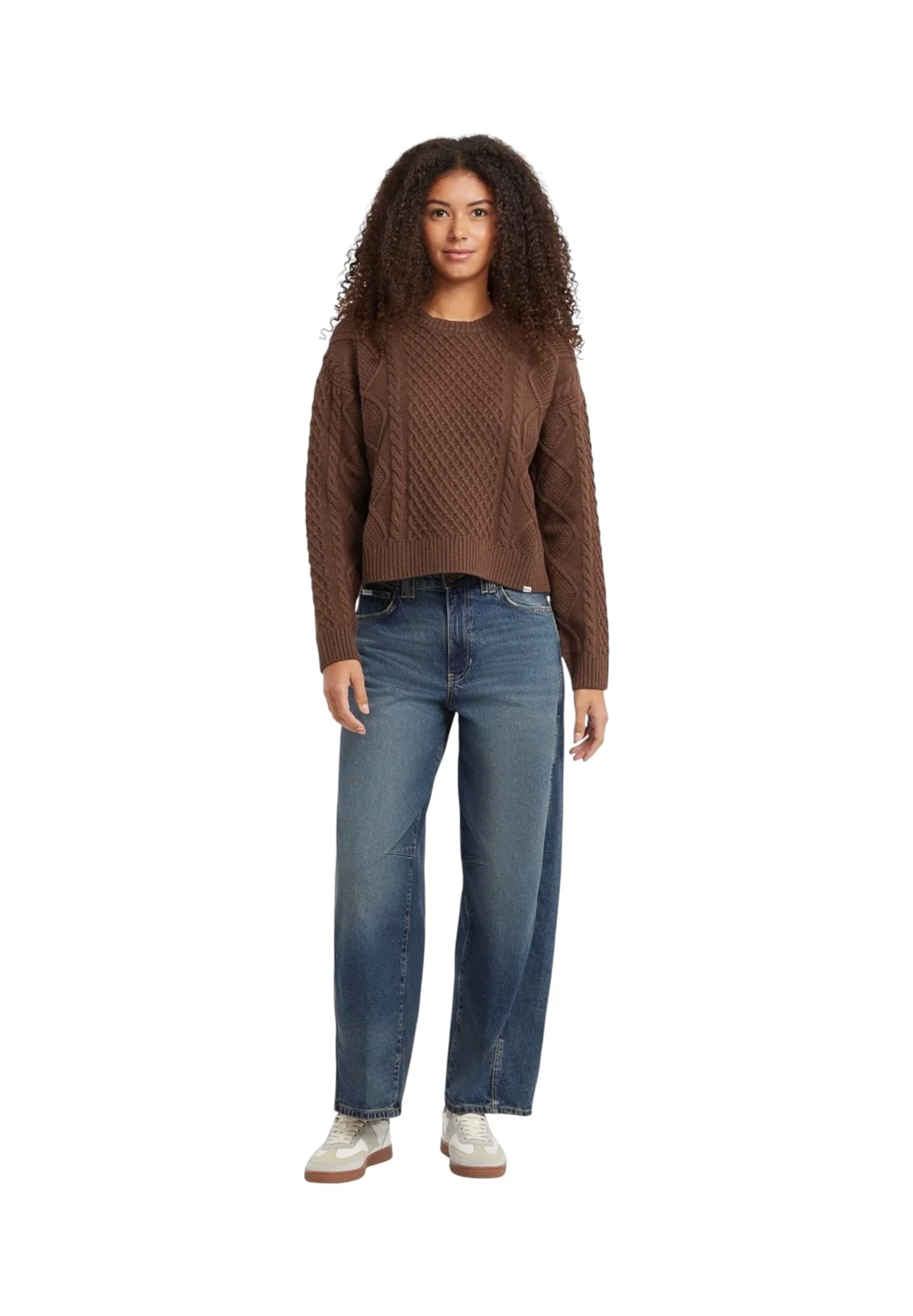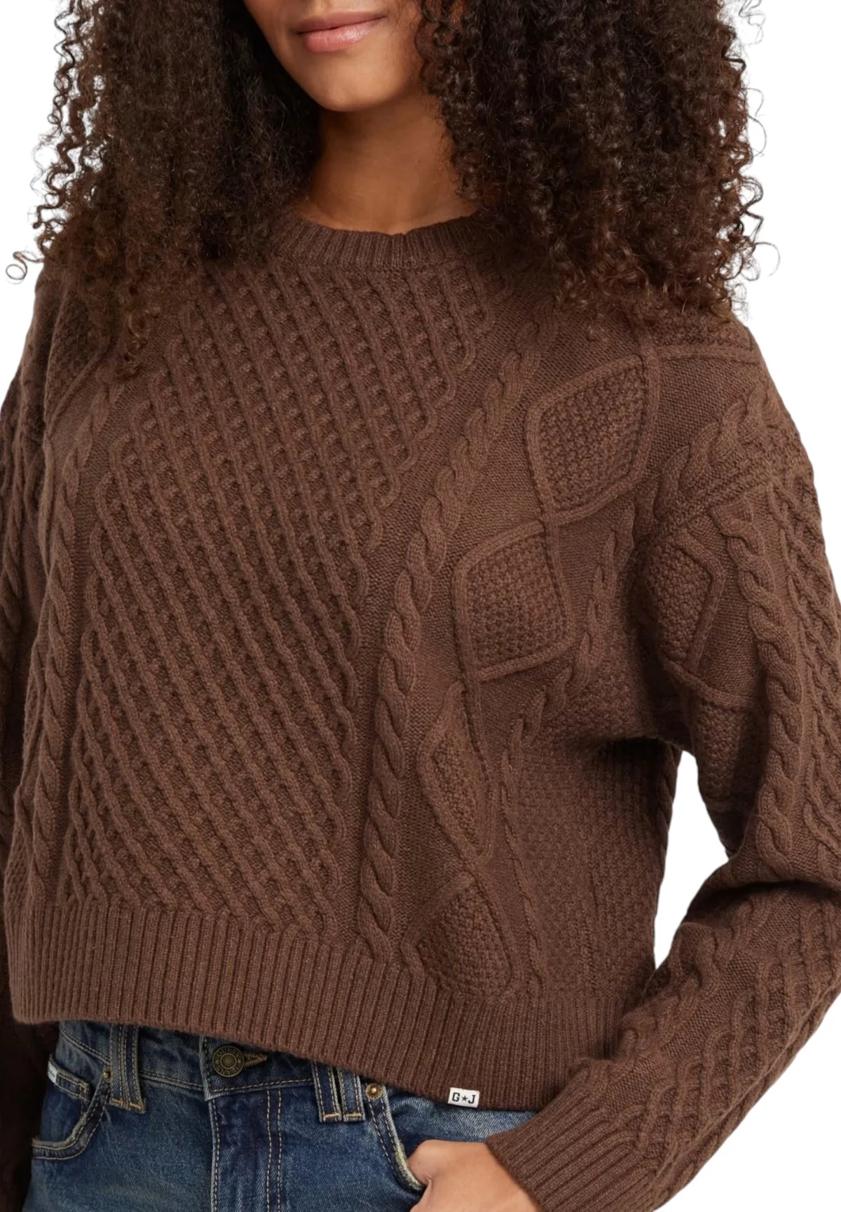 Scopri il fascino del Maglione Girocollo Donna Guess Jeans Rich Brown, un capo essenziale per il tuo guardaroba autunnale. Questo maglione marrone si contraddistingue per il suo design a trecce, unito alla qualità intrinseca del brand Guess Jeans, famoso per i suoi dettagli di stile e materiali pregiati.