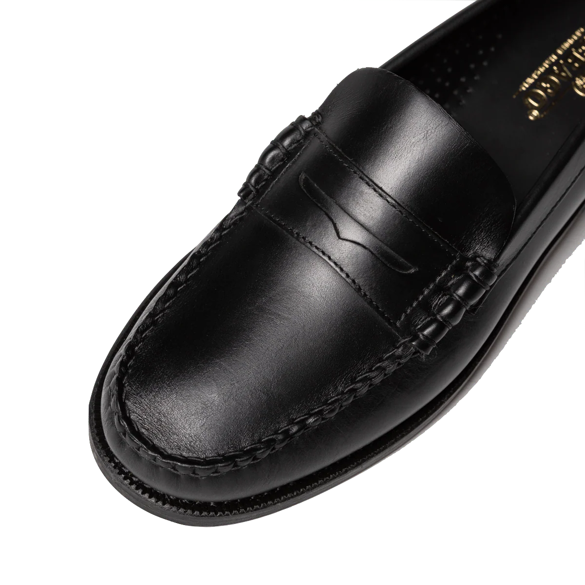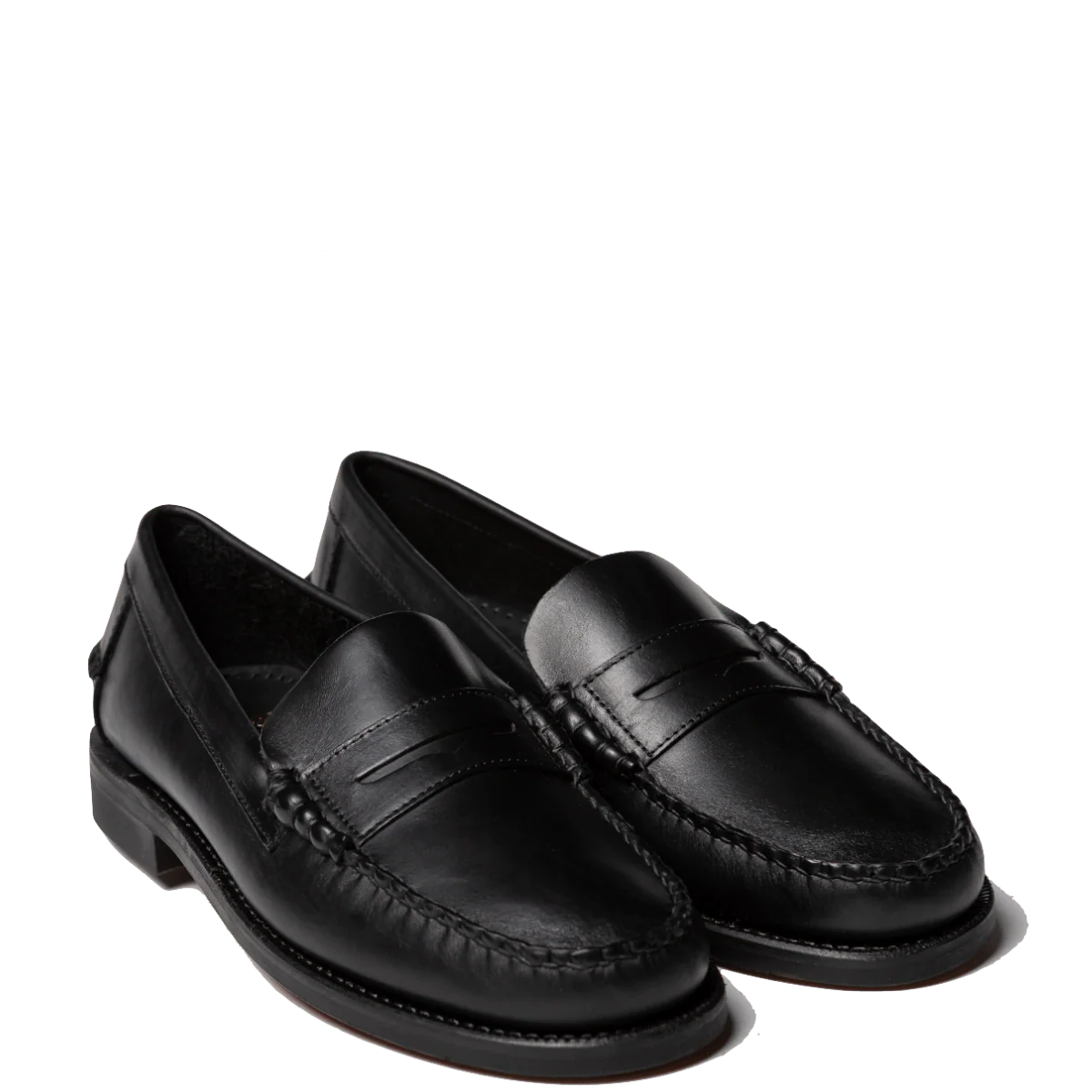 Mocassini classici, quattro stagioni, in morbida pelle oliata, robusta e impermeabile, nera. Cuciture realizzate a mano. Interno sfoderato, soletta in pelle; fondo in cuoio trattato, per resistenza e impermeabilitร , e tacco in gomma