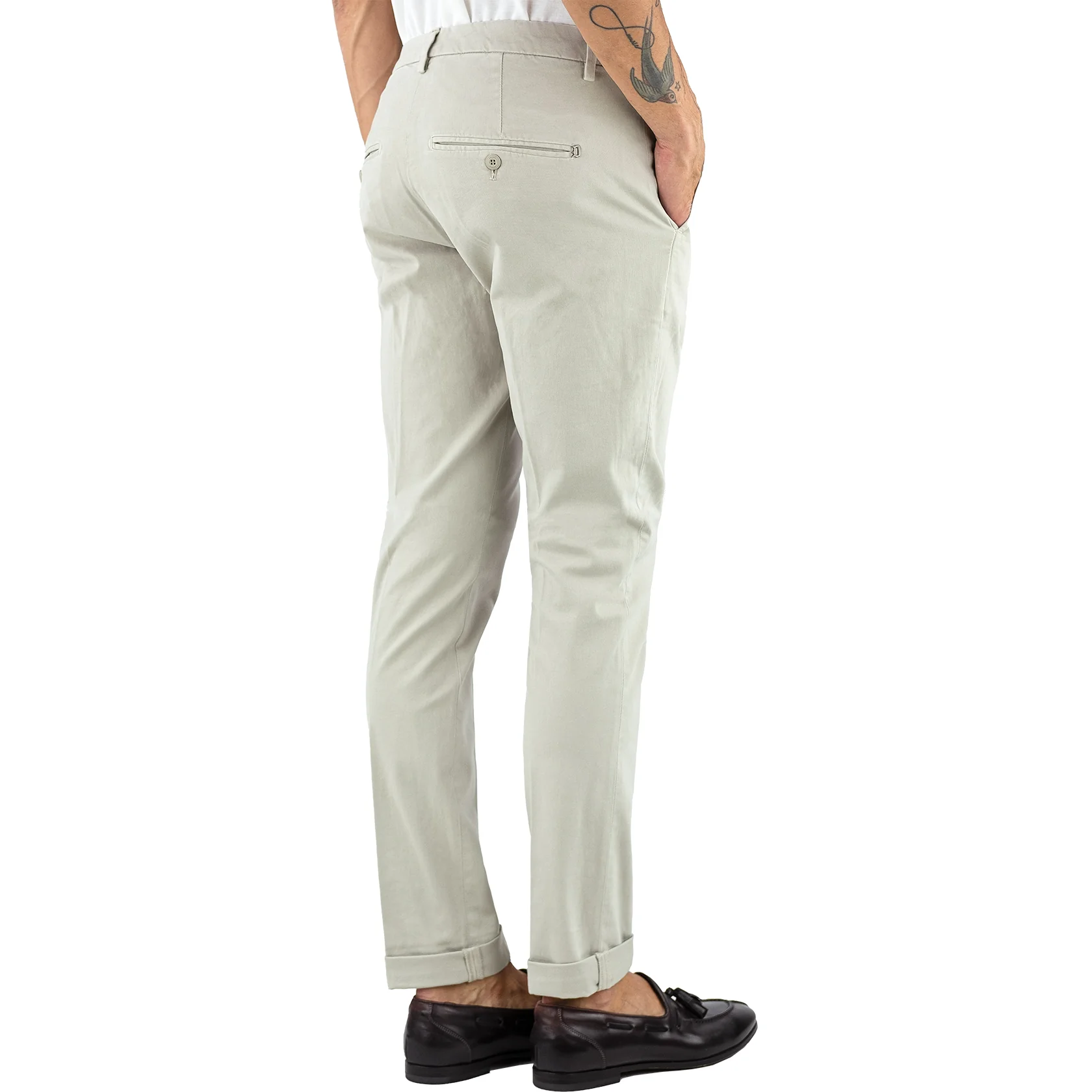 Pantalone DONDUP Gaubert UP235 GSE043U in Gabardina di Cotone Stretch Col. 010 Gesso. Pantalone realizzato in morbida gabardina di cotone stretch dalla mano molto confortevole. Tasche oblique sui fianchi e a filetto sul retro. Personalizzati con l’iconico logo D metallico e chiusi con bottone a pressione e zip coperta. Vestibilità slim.