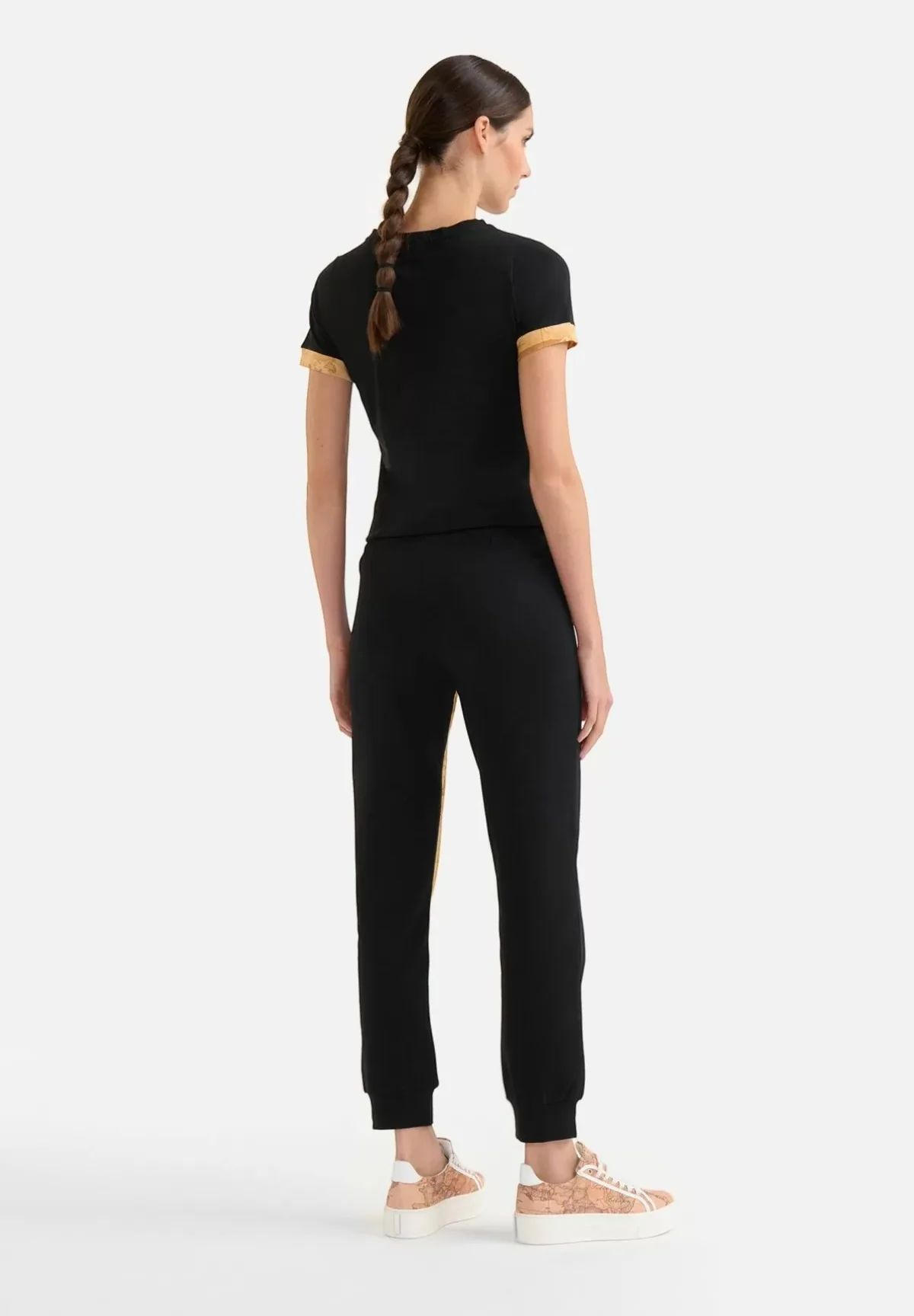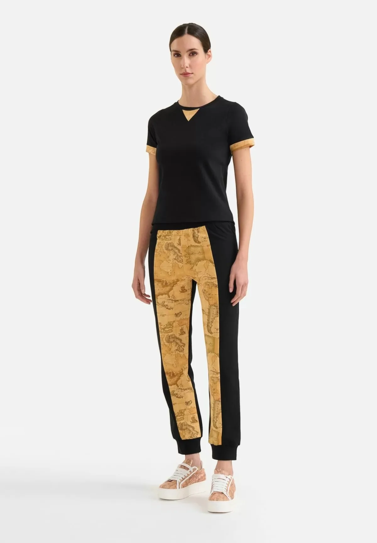 Scopri l’ultima proposta della collezione Pantaloni Tuta di Alviero Martini 1a Classe nel raffinato colore nero. Questi pantaloni da donna uniscono il comfort alla moda grazie alla felpa garzata stretch, arricchiti da un dettaglio esclusivo che non passa inosservato: l’intarsio Geo Classic.