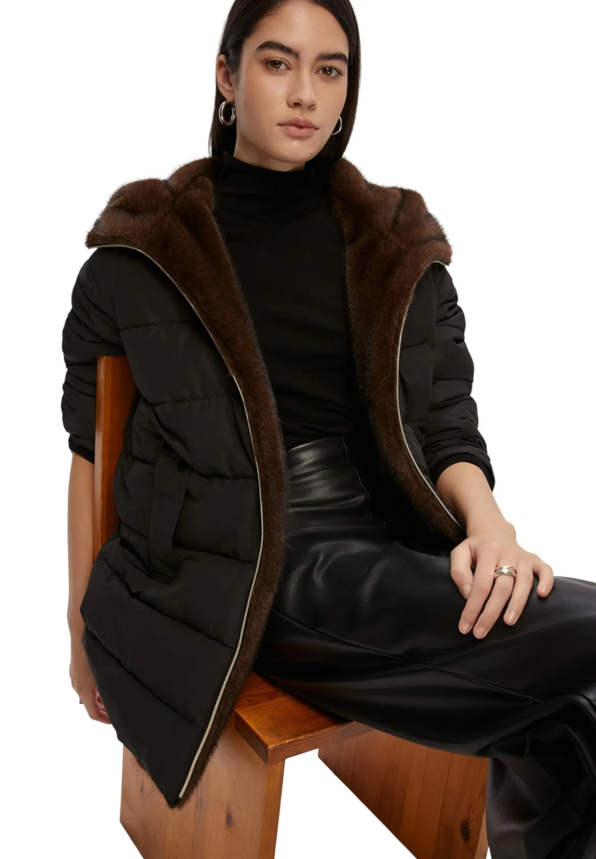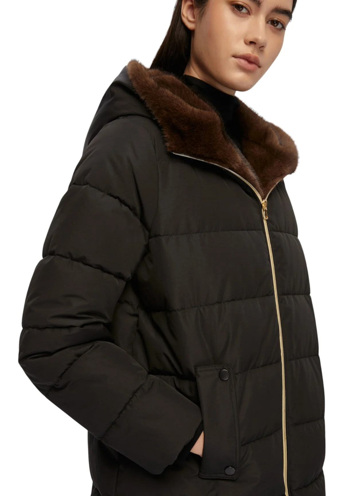 - Collo alto dotato di cappuccio con dettagli in tessuto morbido
