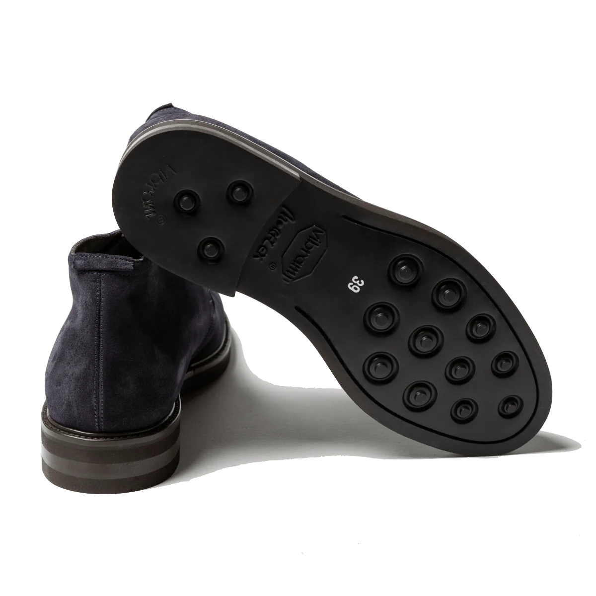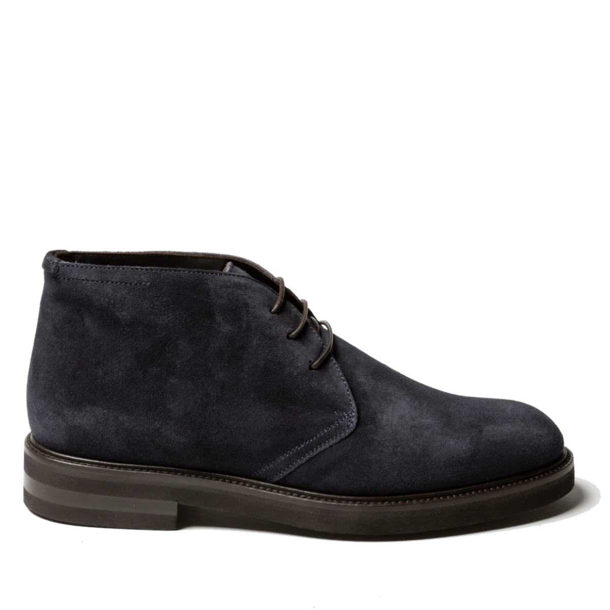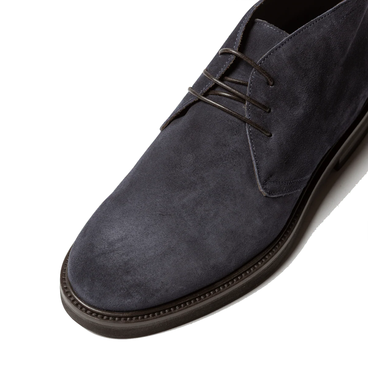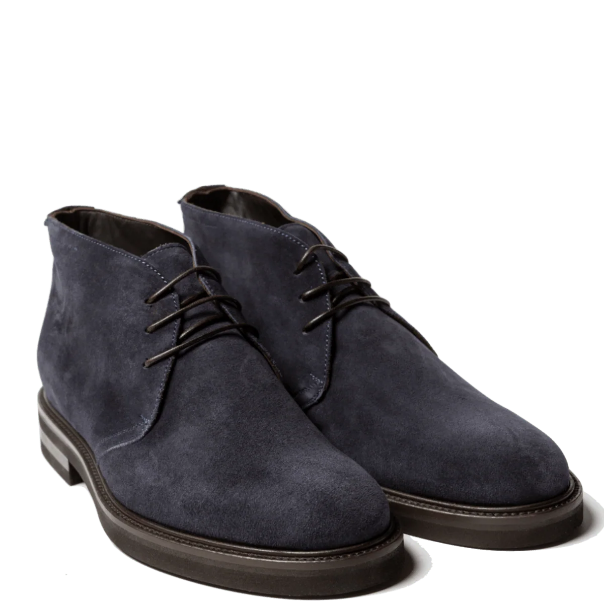 Polacchini in pelle scamosciata robusta blu e fondo in gomma, “Vibram Gumlite”, montato su base in cuoio. Realizzati secondo la tradizione manifatturiera artigianale, radicata nel territorio campano