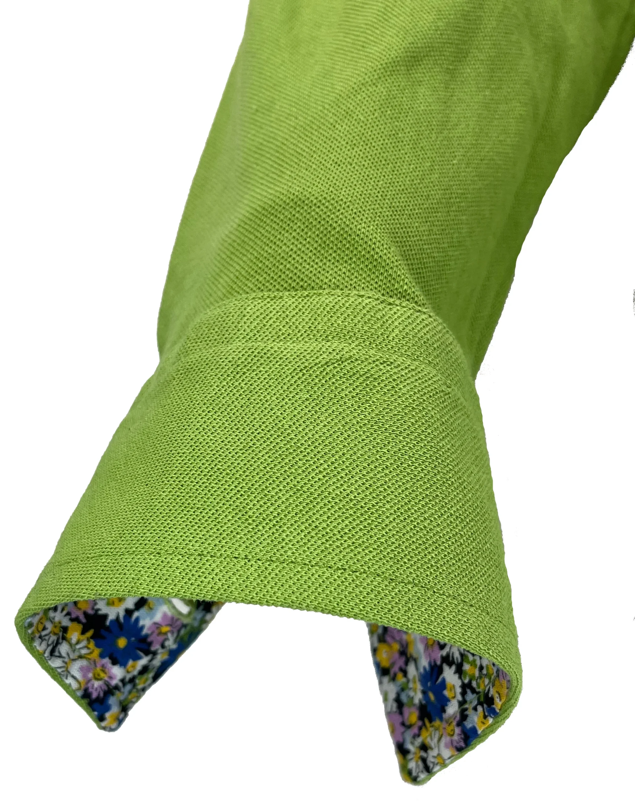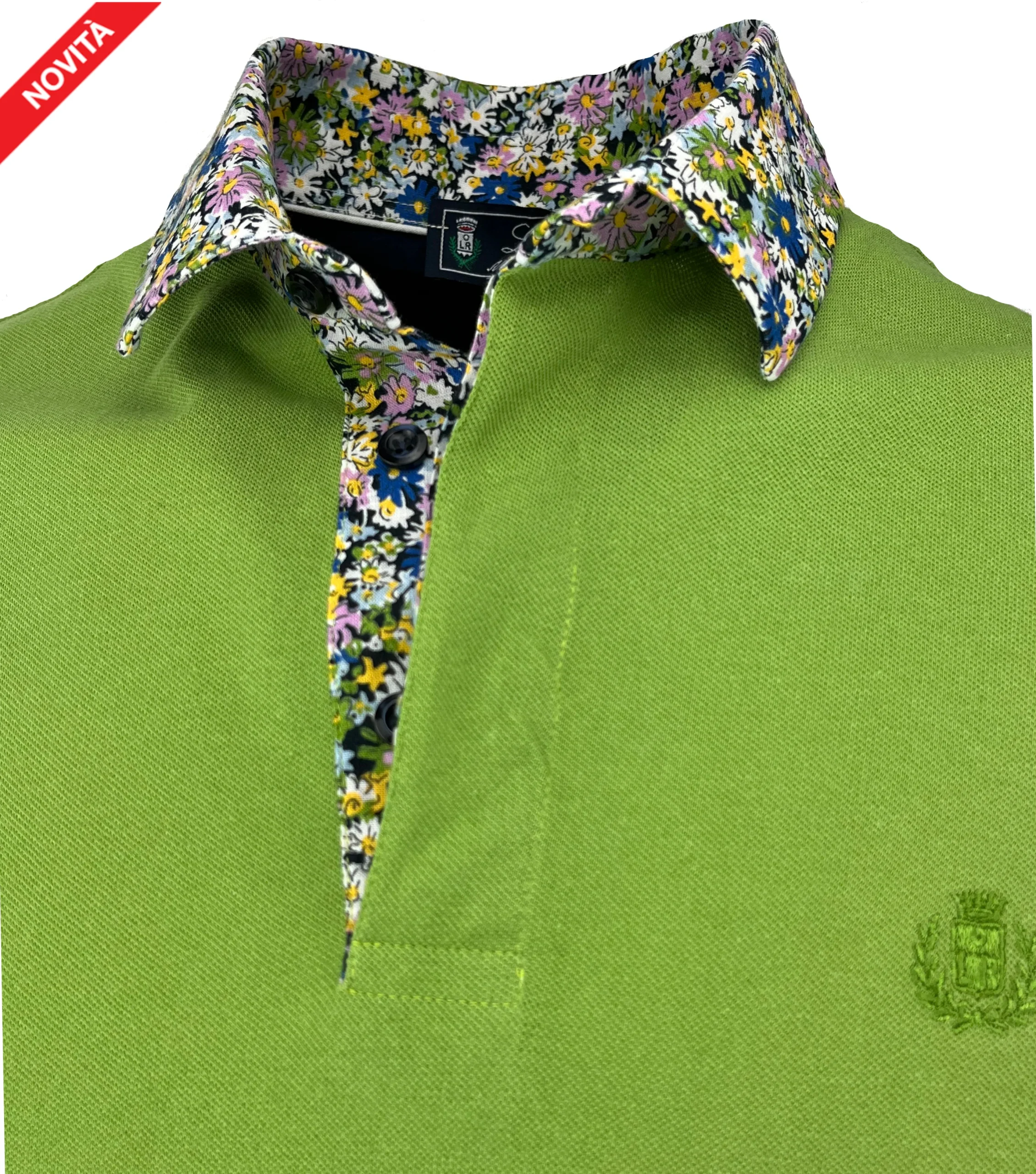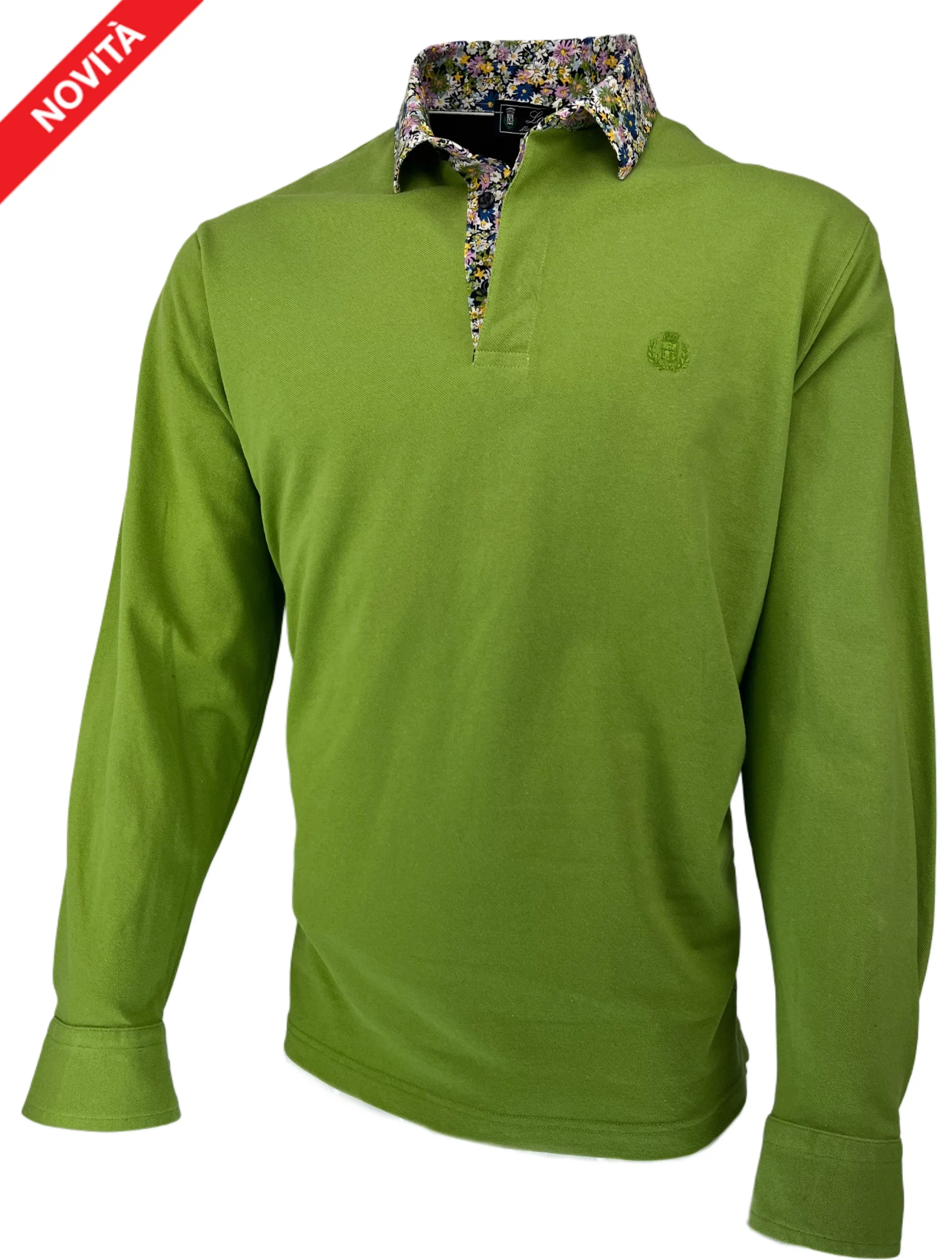 POLO Uomo Piquet Manica Lunga Verde Brillante Collo Fantasia Fiori