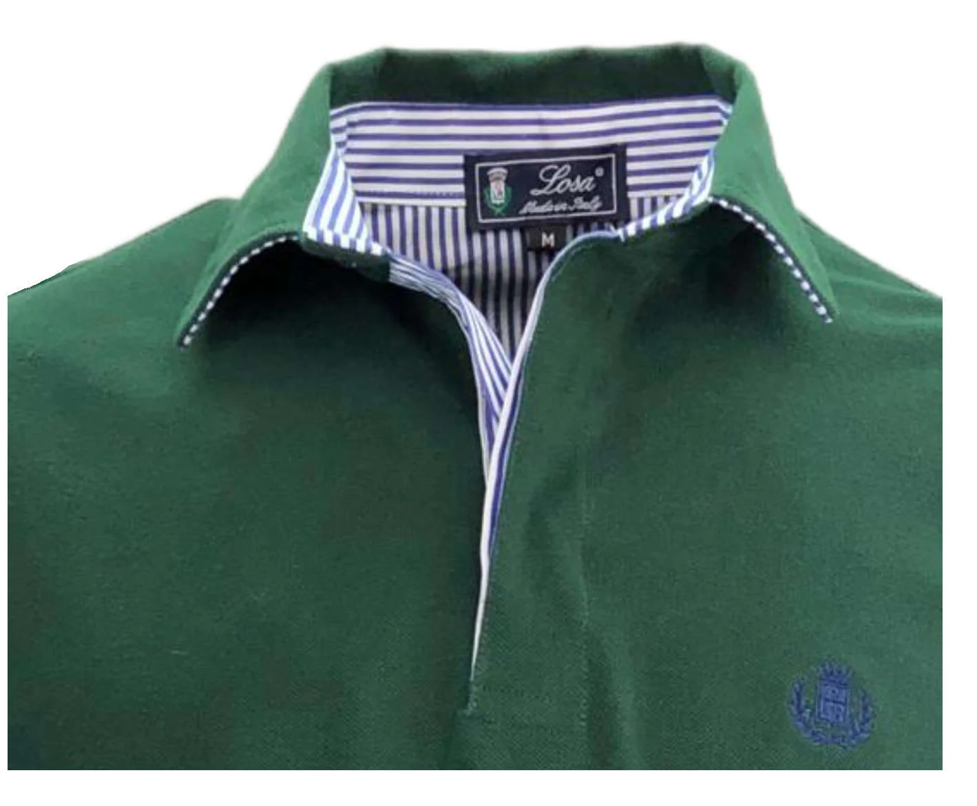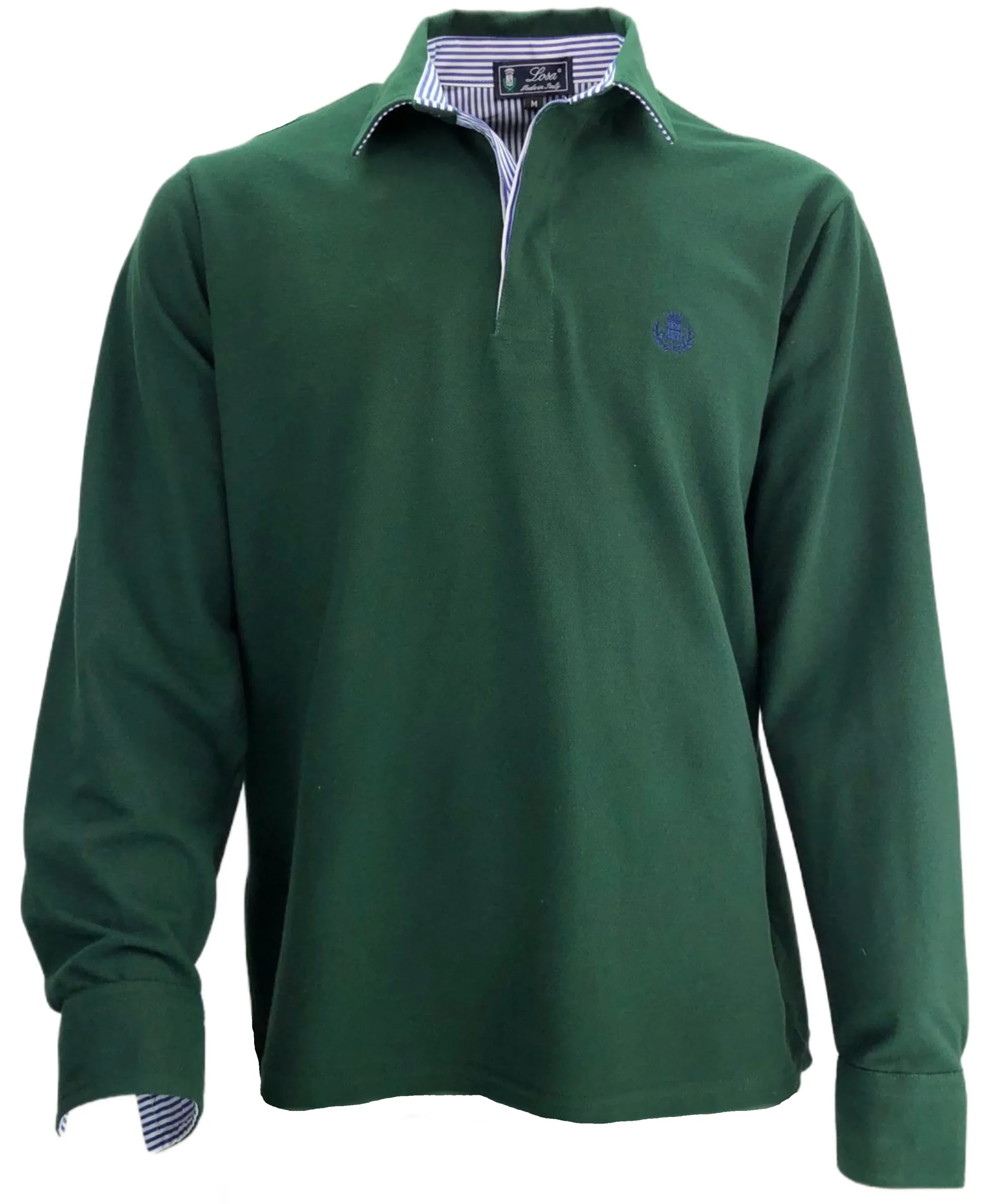 Polo uomo a manica lunga Realizzata in tessuto Piquet 100% cotone con collo e in tinta e sottcolletto stile camicia in tessuto popeline Rigato Bianco e Blu Rifinito con lunetta sulla parte posteriore. Tagliata, cucita e confezionata interamente in Italia. Vestibilità comoda. Guida alle taglie Istruzioni Lavaggio