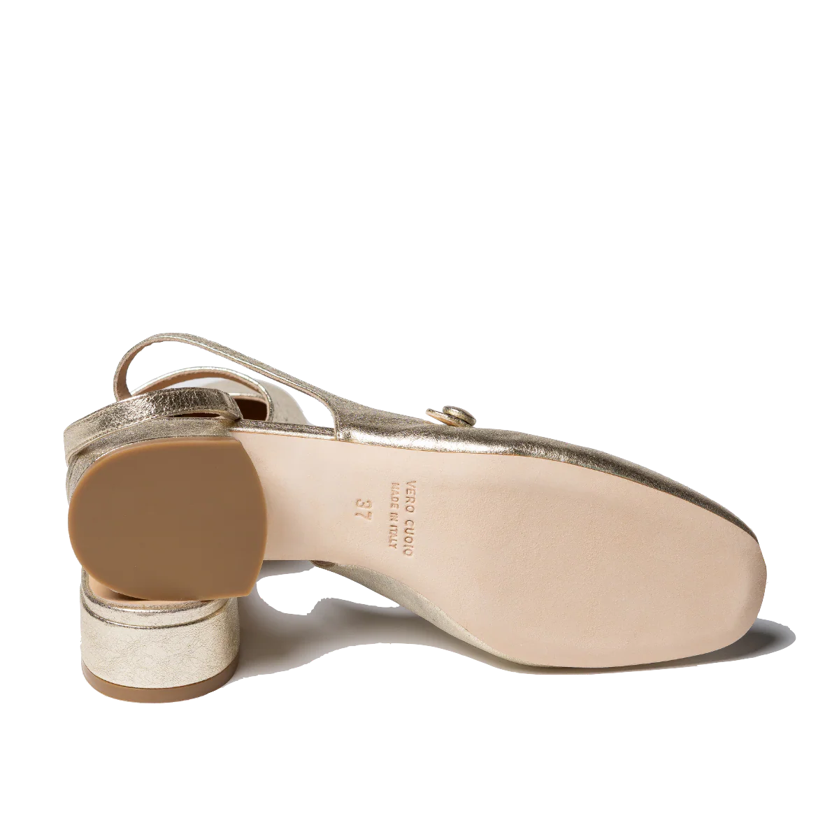 Modello Mary Jane, con il cinturino sul collo del piede, aperto sul retro: come una slingback. Realizzati artigianalmente dallo storico calzaturificio veneto. Tomaia in nappa morbida laminata color platino. Cinturini elasticizzati, sul collo del piede e sul retro. Fodera pelle. Fondo in cuoio, con tacco basso, di altezza 3 cm