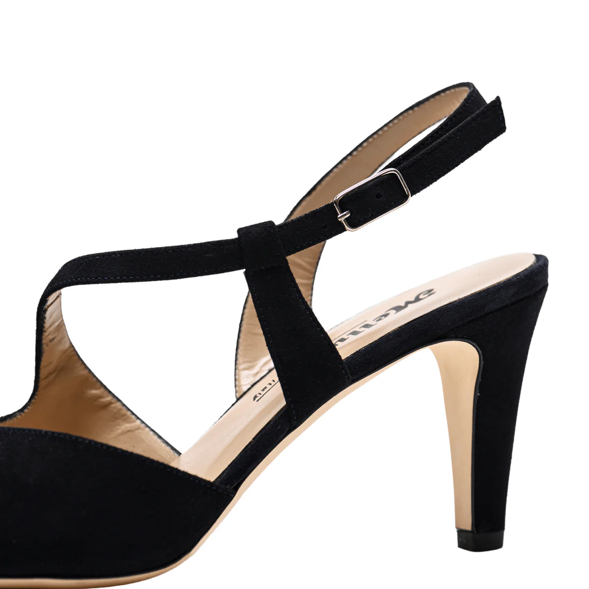 Chanel, modello chiuso in punta e aperto sul retro, con cinturino, che avvolge il collo del piede, regolabile. Pelle scamosciata nera, fondo in cuoio, con tacco a cono Altezza tacco: 7 cm Calzata: giusta