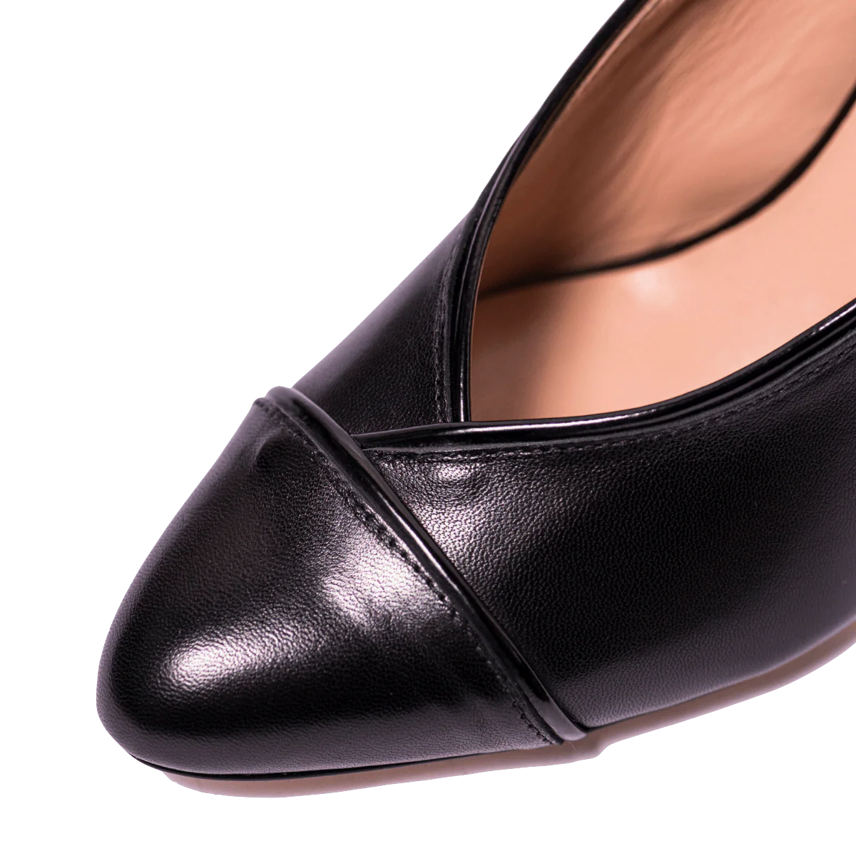 Modello “chanel”, chiuso in punta e aperto sul retro. Lavorazione artigianale italiana. Nappa morbida nera, con bordino in vernice, tono su tono, e cinturino regolabile. Foderati in pelle. Fondo in cuoio Tacco a cono di altezza 7 cm Calzata: giusta