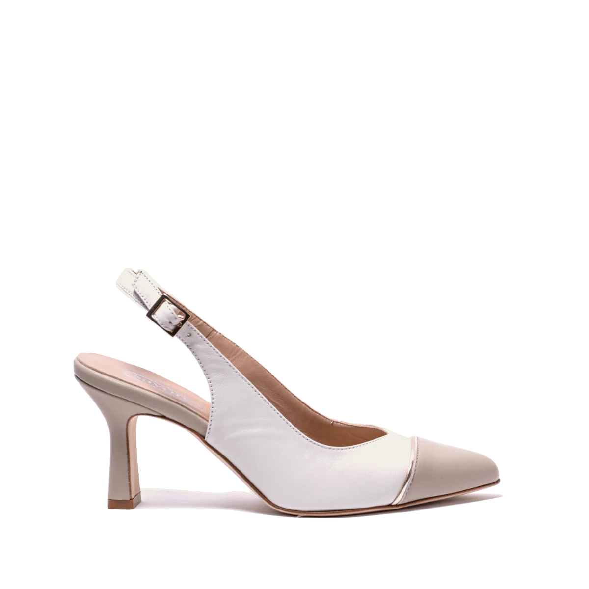 Modello “chanel”, chiuso in punta e aperto sul retro. Lavorazione artigianale italiana. Tomaia in nappa color crema, con puntale a contrasto color écru, e rifinitura in pelle dorata. Cinturino regolabile. Fodera interna in pelle. Fondo in cuoio con camoscio antiscivolo Tacco a rocchetto di altezza 7.5 cm e larghezza 2.5 cm Calzata: giusta