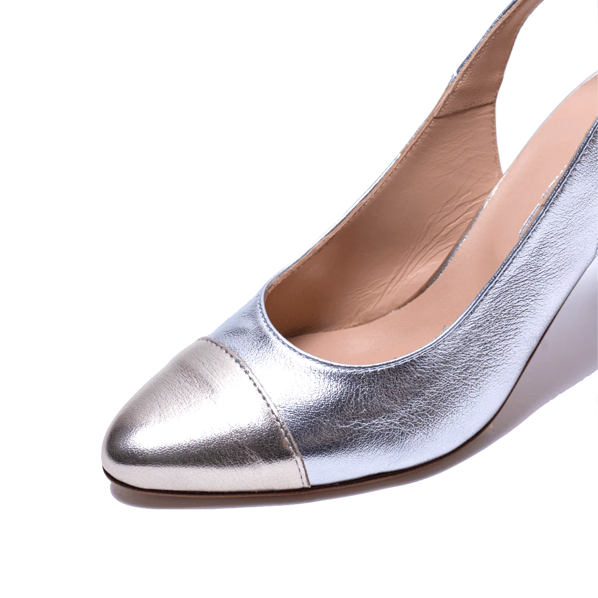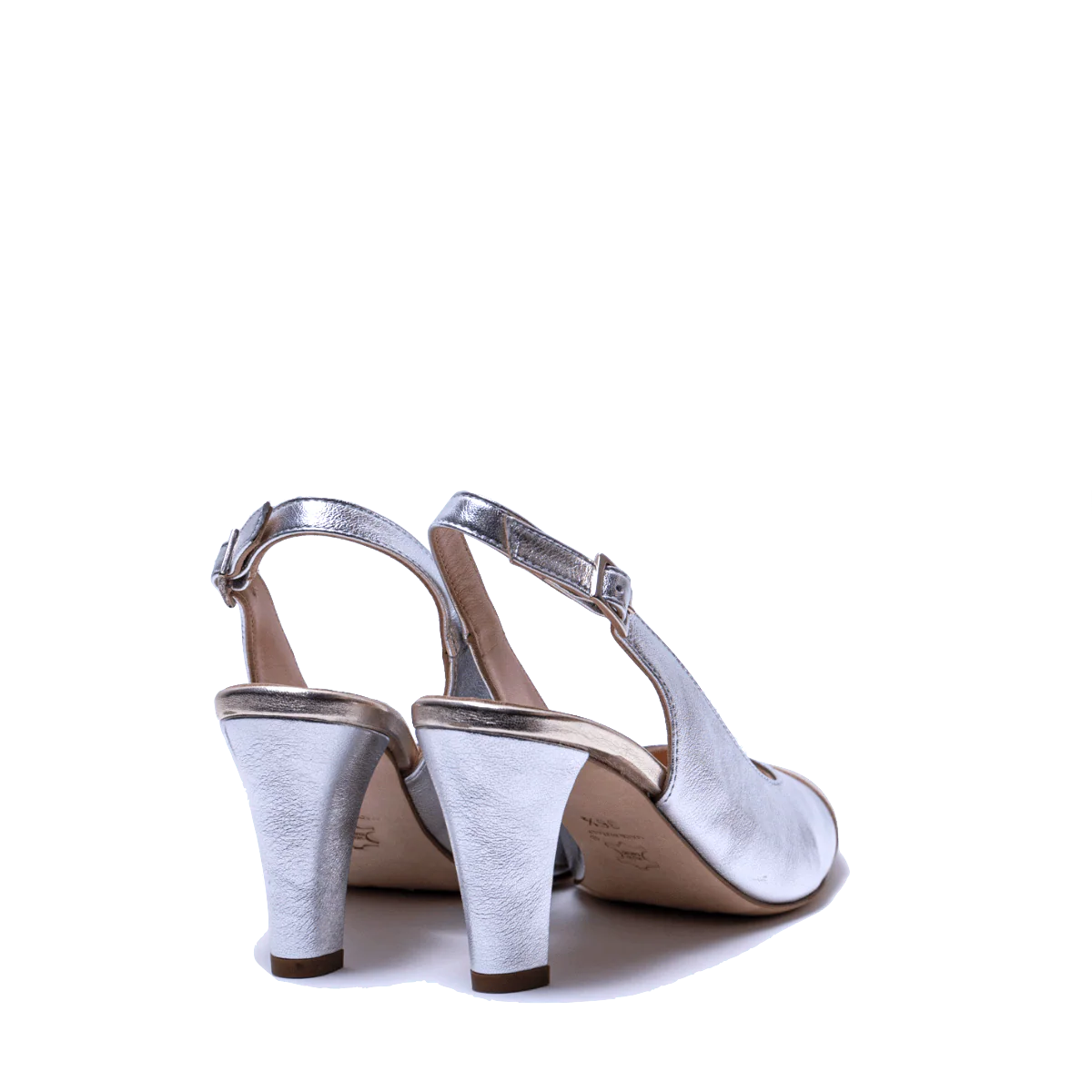 Modello “chanel”, chiuso in punta e aperto sul retro. Lavorazione artigianale italiana. Nappa morbida argento, con punta dorata, e cinturino regolabile. Fodera interna in pelle. Fondo in cuoio con camoscio antiscivolo