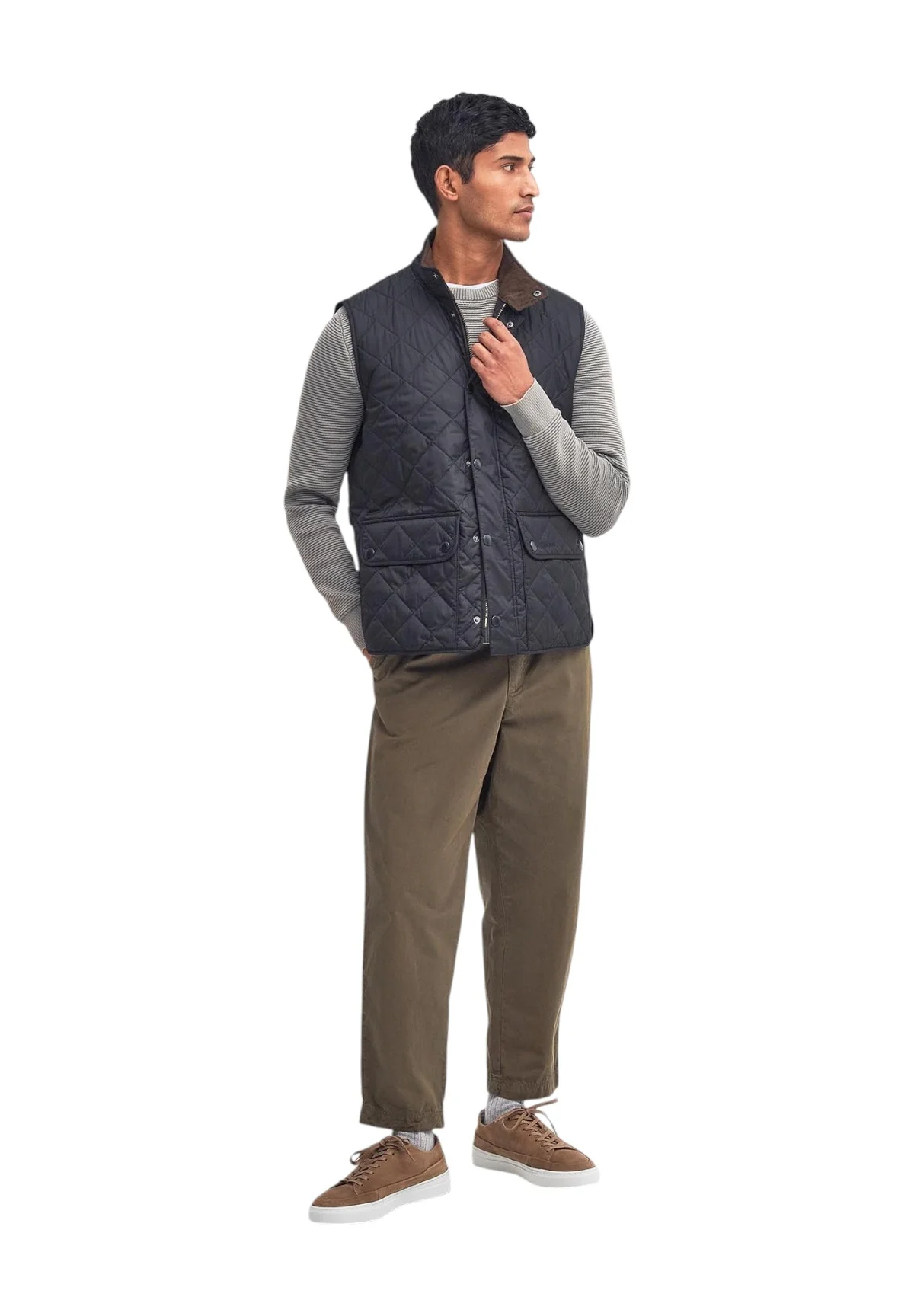 Per un look completo e raffinato, abbina il tuo Smanicato Gilet Barbour blu con una camicia in cotone bianco o camicia a quadri per un tocco piรน rustico. Completa l’outfit con un paio di jeans scuri e stivali in pelle Barbour per un aspetto casual ma elegante. Gli accessori, come una sciarpa leggera o un cappello, possono aggiungere personalitร al tuo stile.