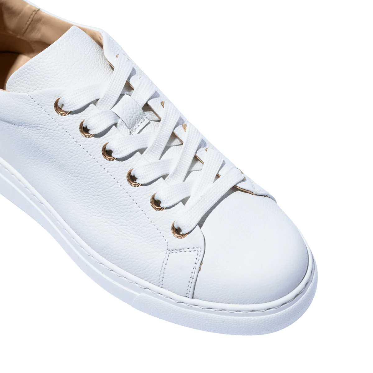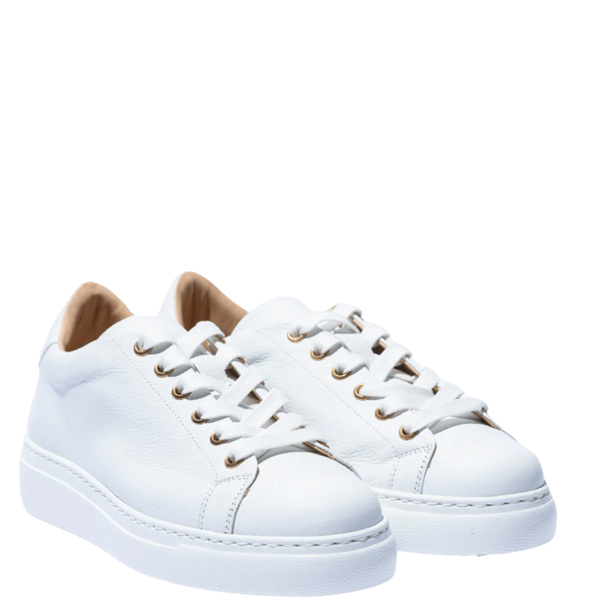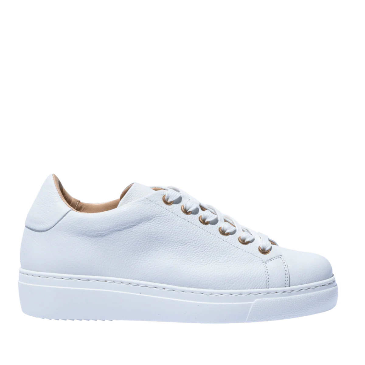 Tomaia in pelle molto morbida, leggermente martellata, bianca. Fodera pelle, plantare in pelle, estraibile. Suola in gomma bianca, leggera, di altezza 3 cm.