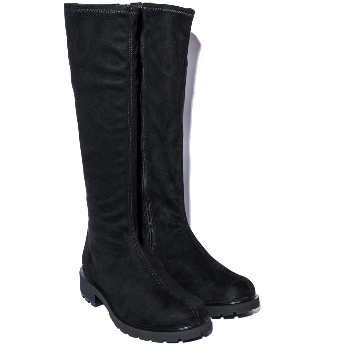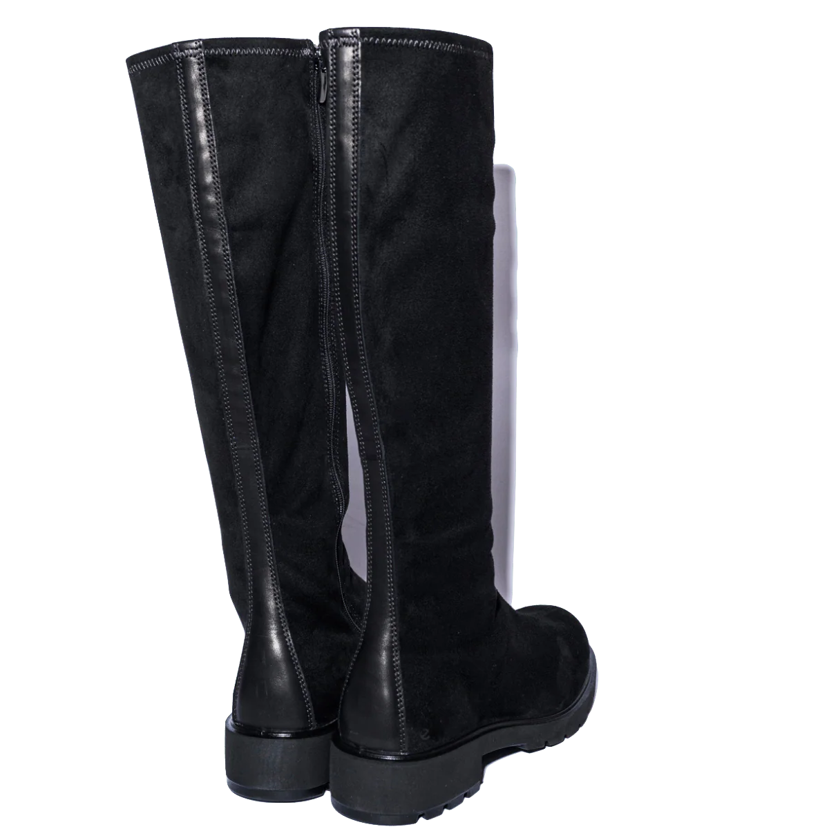 Stivali molto comodi, altezza ginocchio, in pelle nabuck elasticizzato nero, con rifinitura sul retro in pelle nera. Interno in tessuto elasticizzato, traspirante; cerniera sul lato interno. Tecnologia Ecco Fluidform, flessibile e anatomica: la scarpa si adatta perfettamente alla forma del piede. Suola in gomma “carro armato”, leggera e flessibile, con tacco di altezza 3.5 cm. Doppio plantare, estraibili, per una doppia calzata (Dual Fit). Ideali per camminare a lungo, mantenendo raffinatezza in un look casual