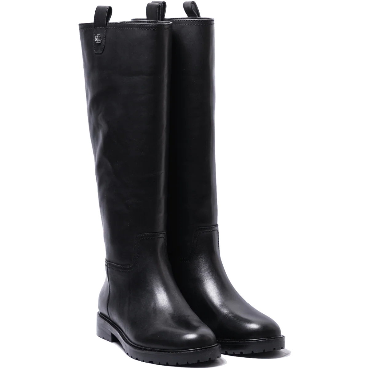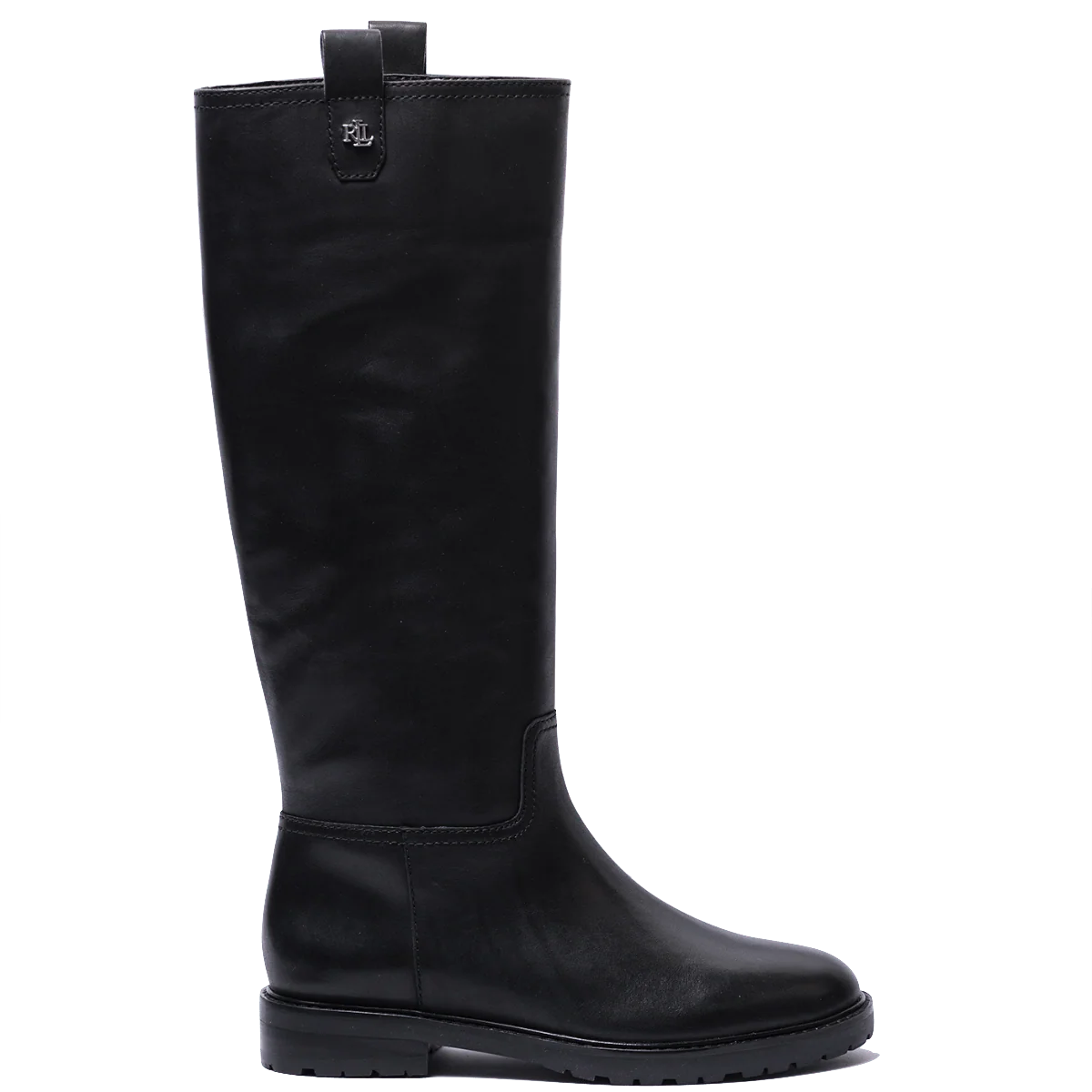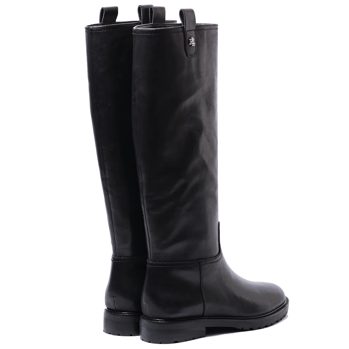 Stivali tubolari, dallo stile elegante equestre, in pelle nera. Interno foderato in pelle e soletta in pelle, imbottita. Punta arrotondata. Applicazioni in metallo sui lati esterni, che rimandano al logo di Polo Ralph Lauren. Altezza gambale: sotto il ginocchio. Fondo in gomma “carro armato” su base in cuoio e tacco di altezza 3 cm. Silhouette semplice, lineare ed elegante