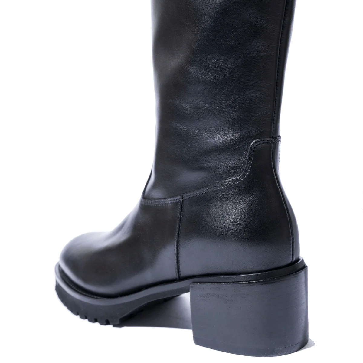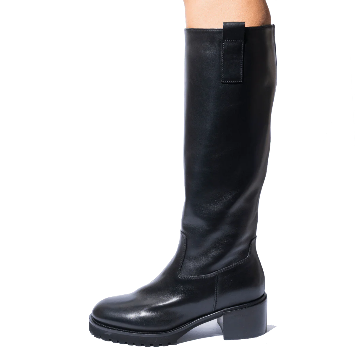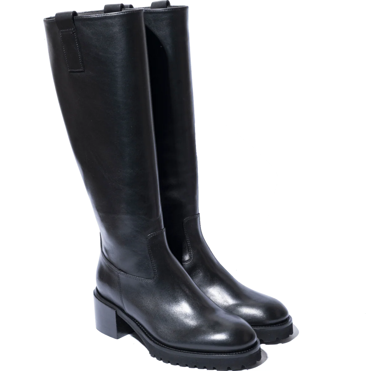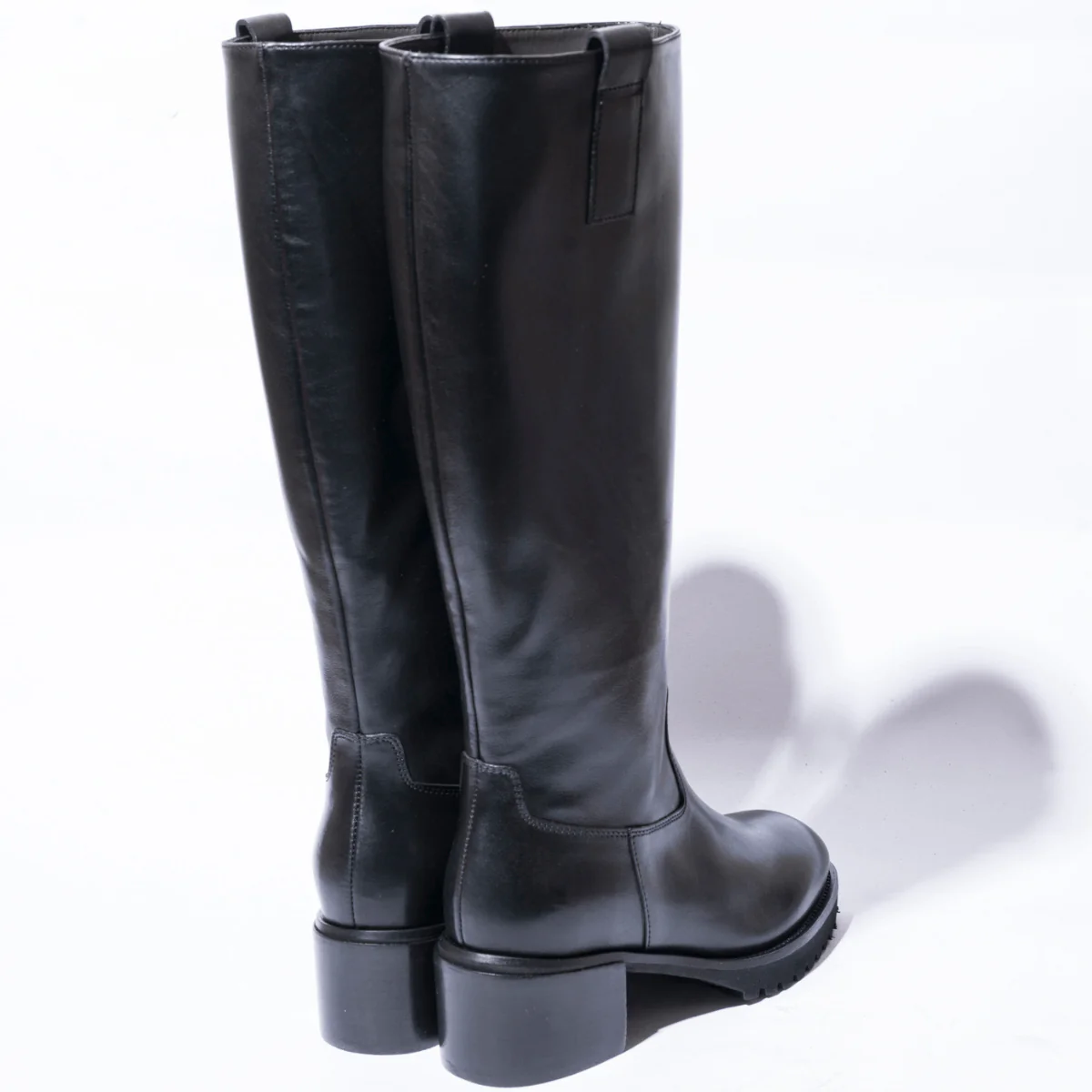 Stivali molto comodi, di origine marchigiana, dallo stile cavallerizzo, semplice e lineare. Tomaia in pelle morbida, nera, con asole laterali e tacco quadrato di altezza 5 cm. Interno foderato in pelle; cerniera sul lato interno, che facilita l’ingresso del piede. Fondo in gomma “carro armato”, flessibile; plantare in pelle. Realizzati con l’impiego di pellami e materiali pregiati
