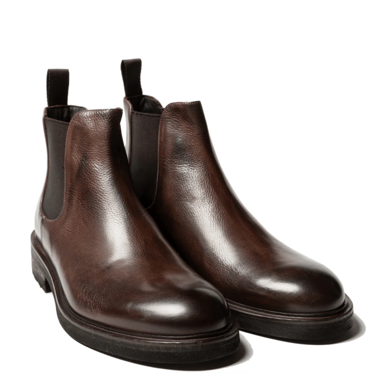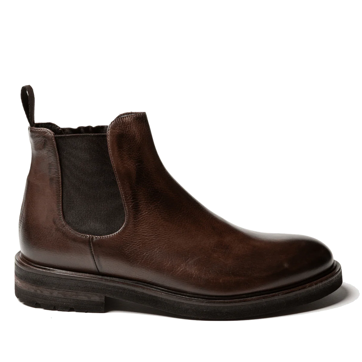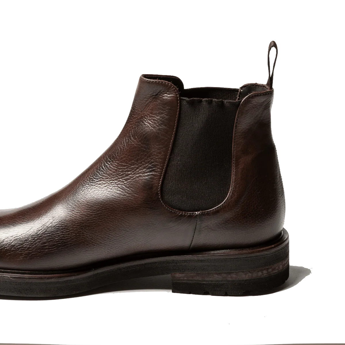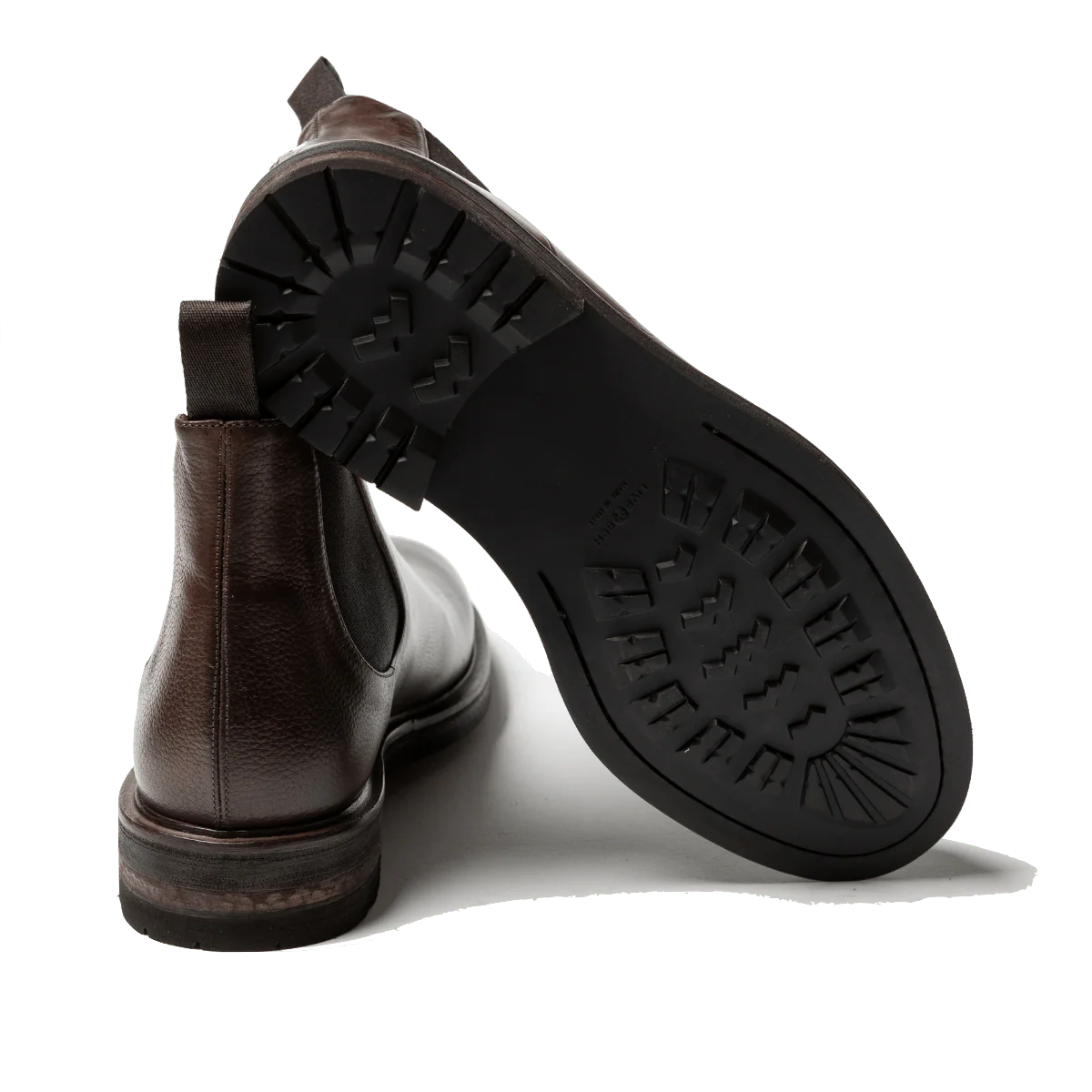 Stivaletti classici modello beatles o chelsea, con i due elastici laterali, in pelle bottalata marrone e fondo in gomma “carro armato” montato sul cuoio. Realizzati secondo la tradizione manifatturiera artigianale, radicata nel territorio campano
