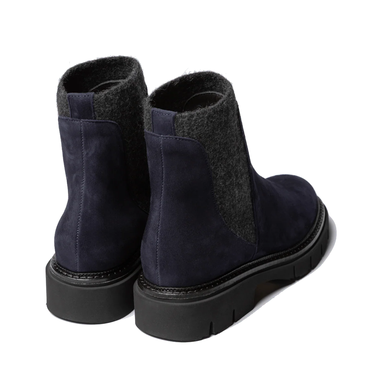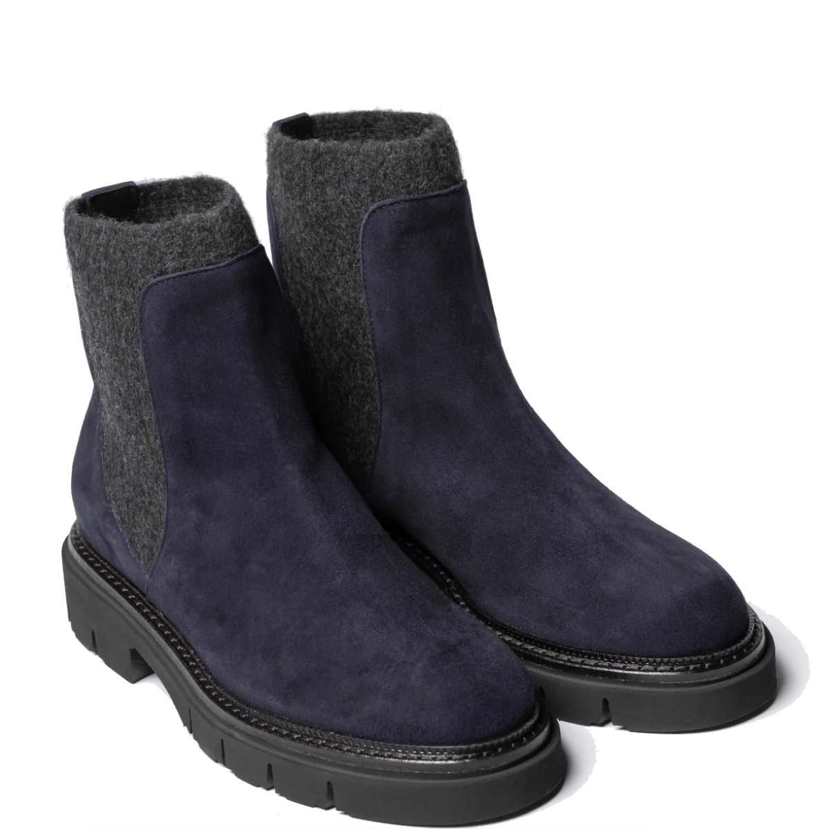 Stivaletti, del calzaturificio italiano Luca Grossi, che opera con i materiali piรน pregiati, provenienti dal distretto conciario della Toscana. Tomaia in pelle scamosciata, robusta, blu con elastici laterali in lana cotta, che avvolgono la caviglia, colore grigio scuro. Sottopiede in pelle, leggermente imbottito. Fondo in gomma spessa millerighe