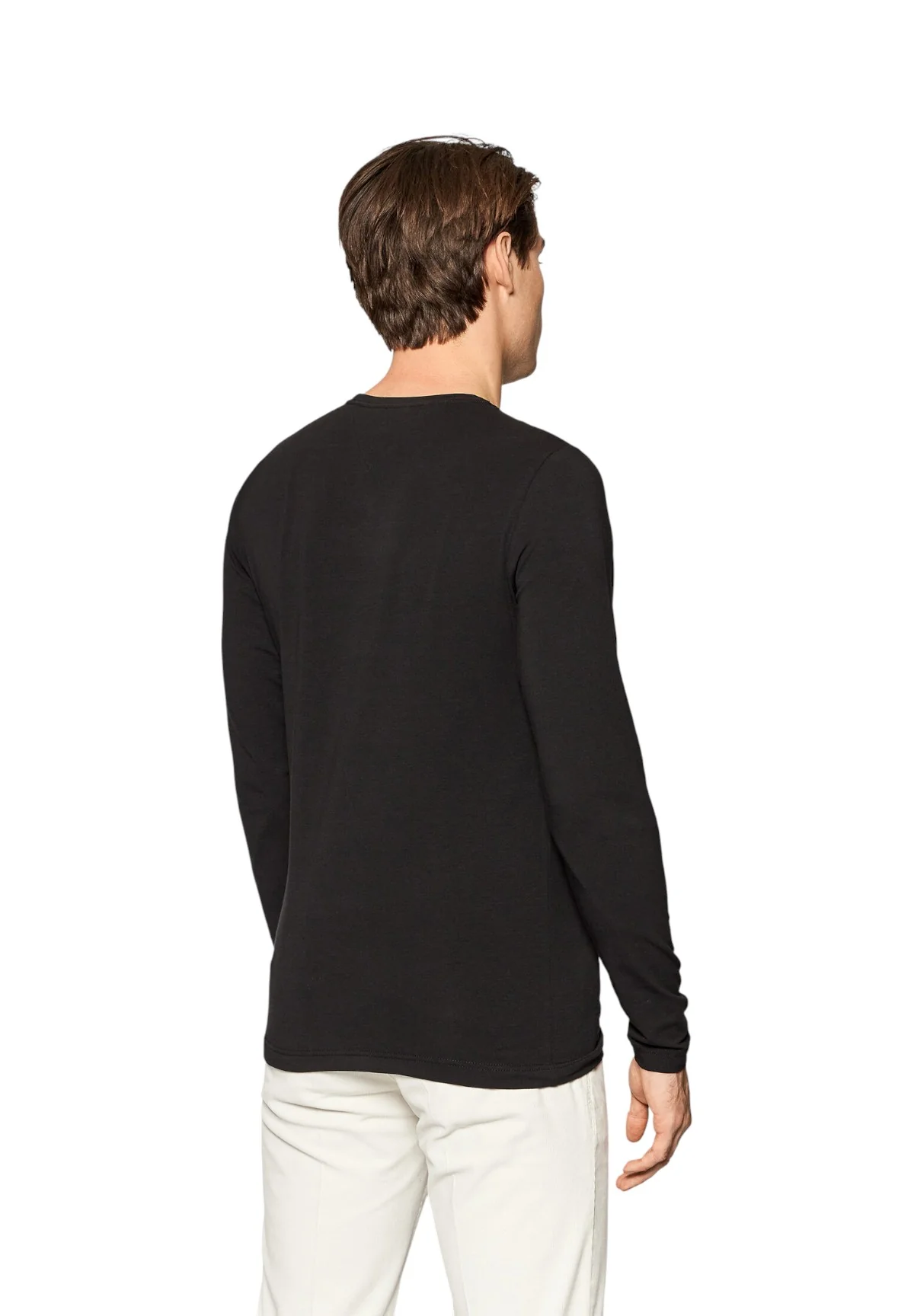 La T-shirt nera a maniche lunghe si abbina perfettamente a jeans slim fit o a pantaloni chino per un look casual urbano. Completa l’outfit con una giacca sportiva nei colori neutri e un paio di sneakers per un tocco finale. Gli accessori come un orologio minimalista o un cappello elegante possono valorizzare ulteriormente lo stile.