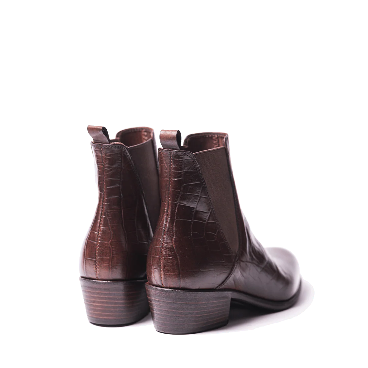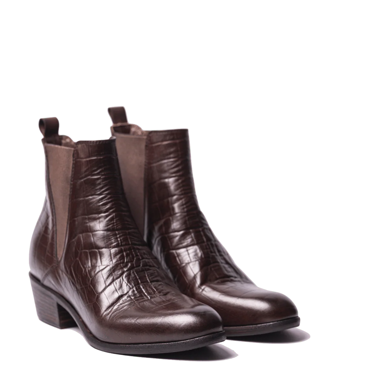 Tronchetti, dallo stile “Camperos”, della ditta napoletana, in pelle morbida, stampa cocco, marrone ed elastici laterali. Fondo in cuoio molto robusto con tacco squadrato