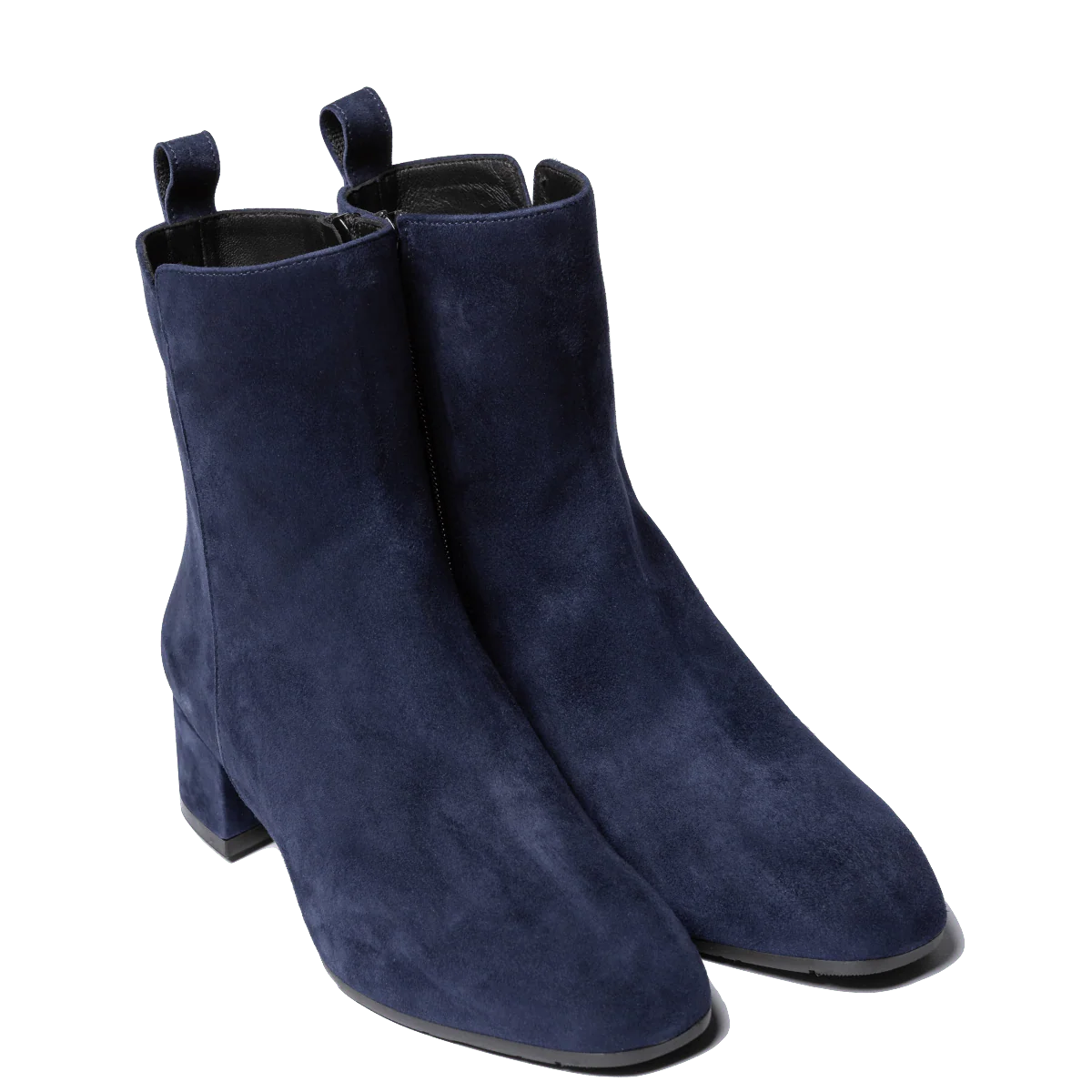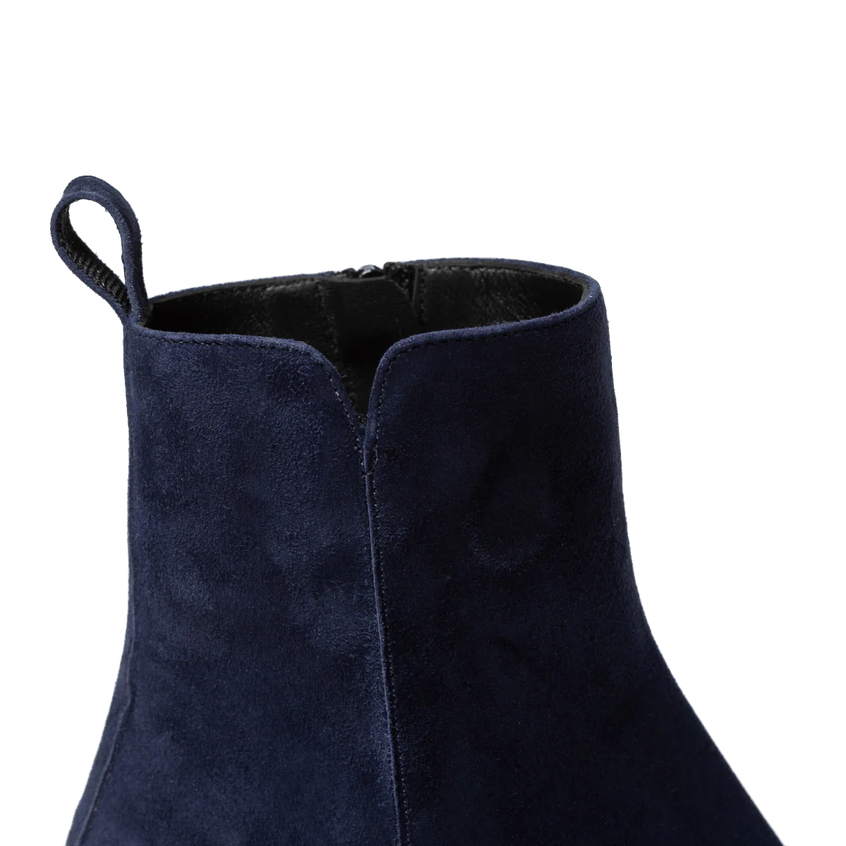 Tronchetti, dalla punta leggermente squadrata, realizzati dallo storico calzaturificio campano. Pelle scamosciata blu, cerniera sul lato interno, altezza sopra la caviglia. Fondo in gomma sottile con tacco di 3.5 cm