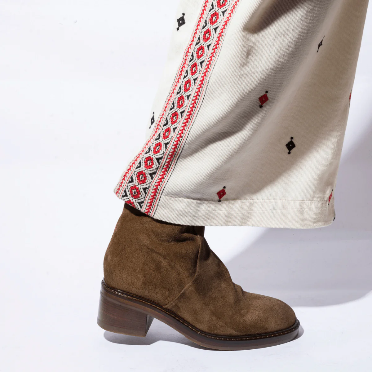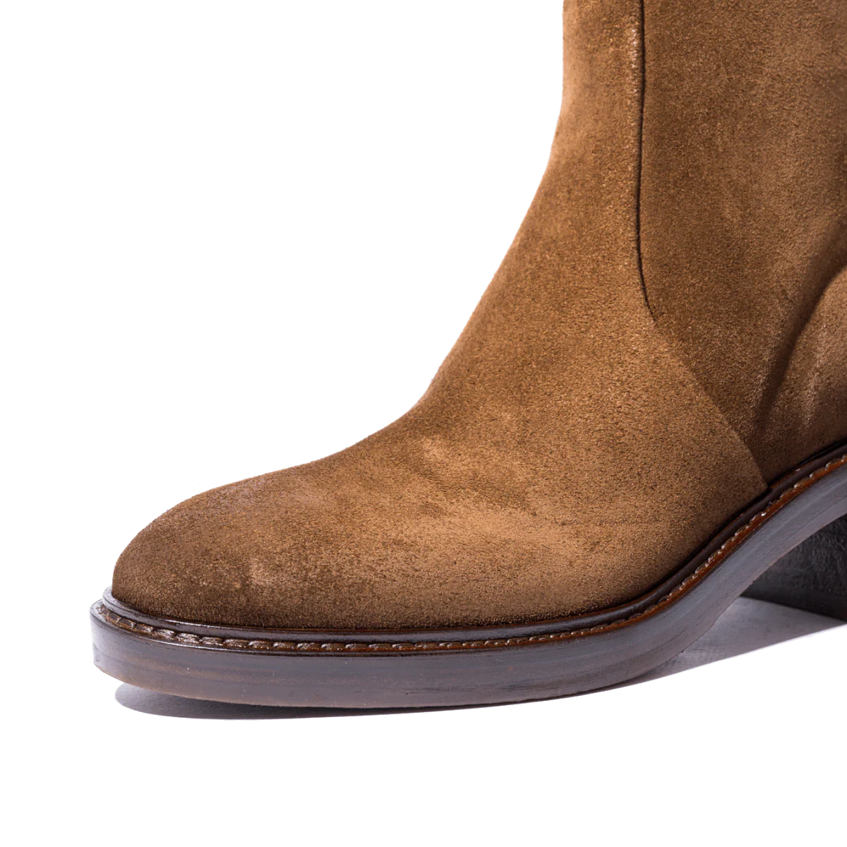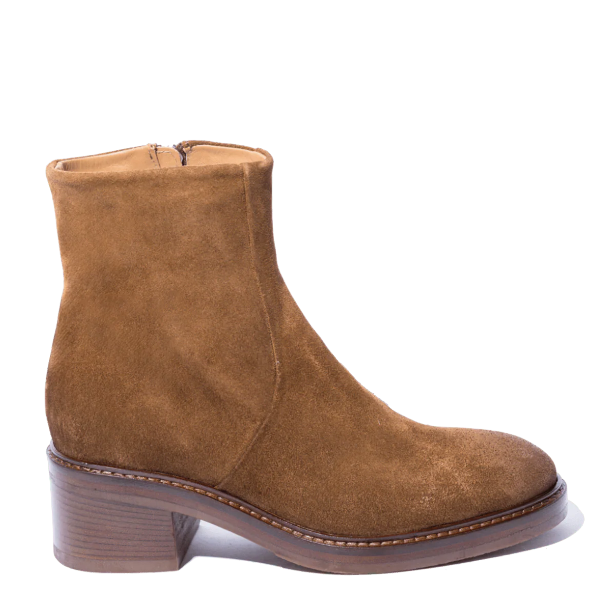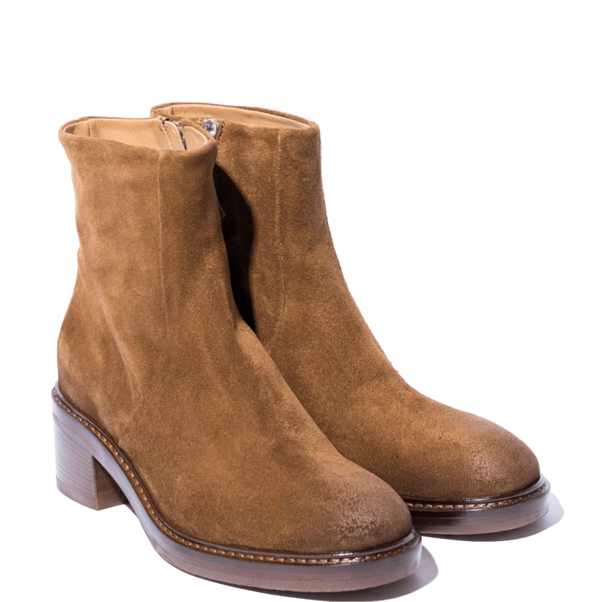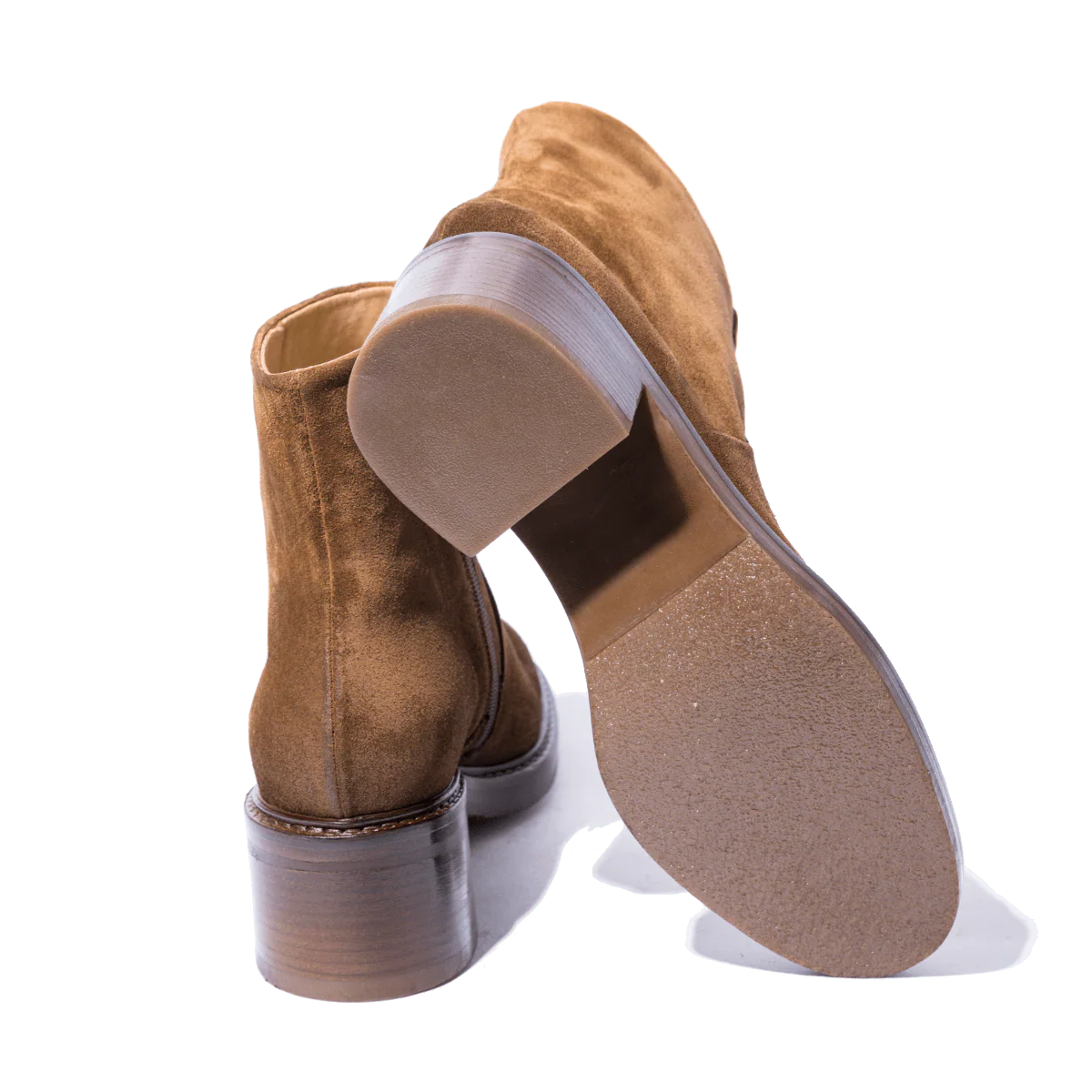 Tronchetti comodi, di origine marchigiana. In pelle scamosciata, leggermente ingrassata, color miele, con tacco grosso di altezza 5 cm. Interno foderato in pelle; cerniera sul lato interno, che facilita l’ingresso del piede. Fondo in gomma; plantare in pelle leggermente imbottito. Realizzati con l’impiego di pellami e materiali pregiati.