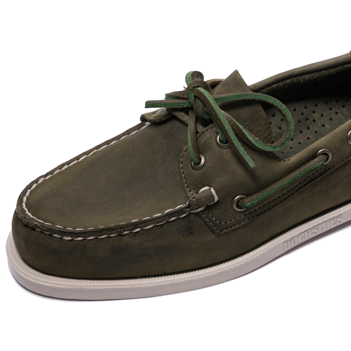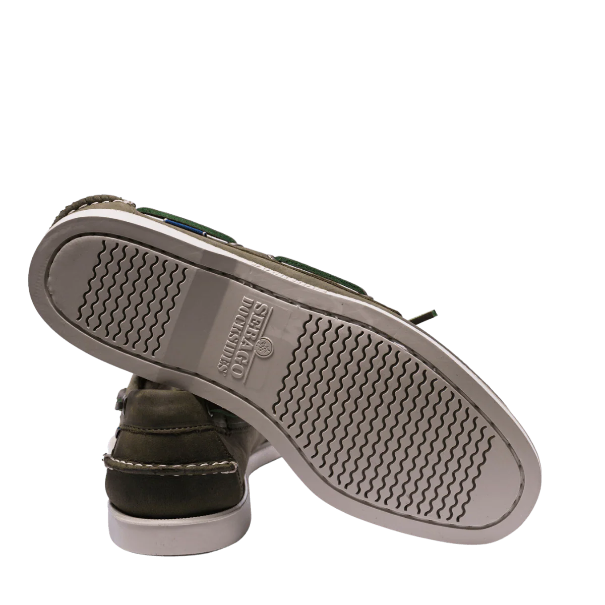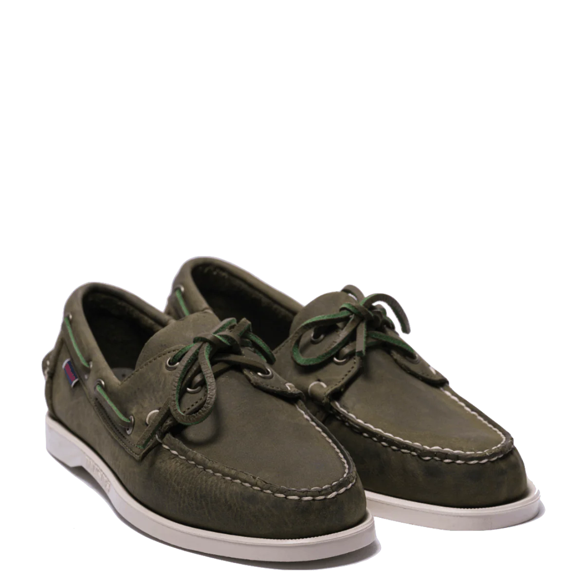 Scarpe da barca, icona del marchio Sebago. Il nome “Portland” riprende uno dei piรน grandi porti marittimi del New England, e sede del famoso Yachting Club omonimo. Cucite a mano, soletta in pelle, sistema di allacciatura a 360ยฐ in cuoio e suola in gomma bianca con striata antiscivolo. Pelle resistente, verde militare Calzata: giusta