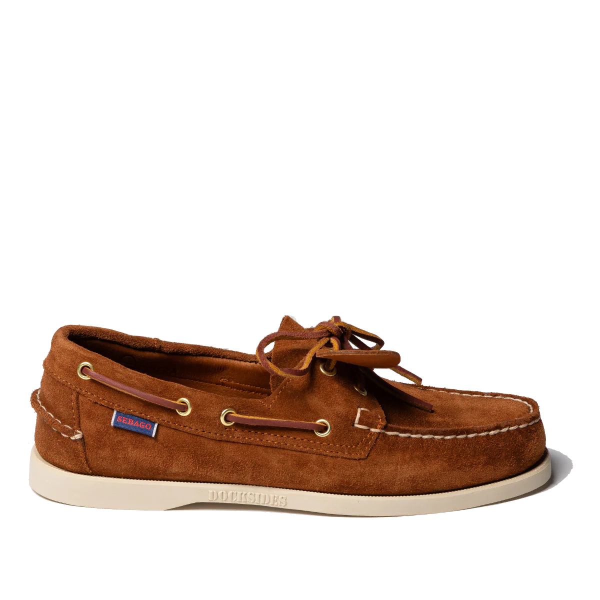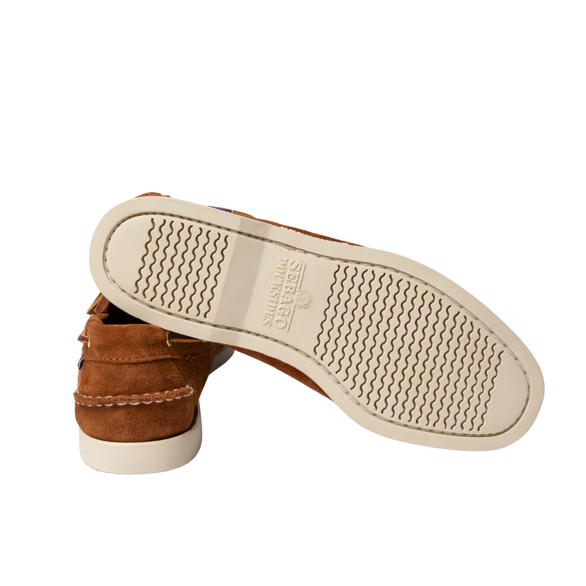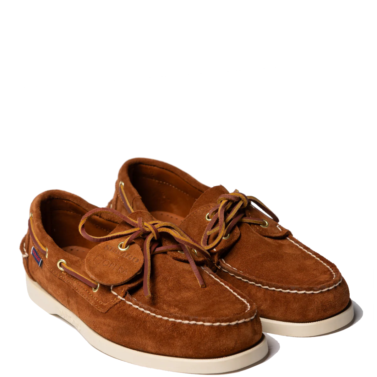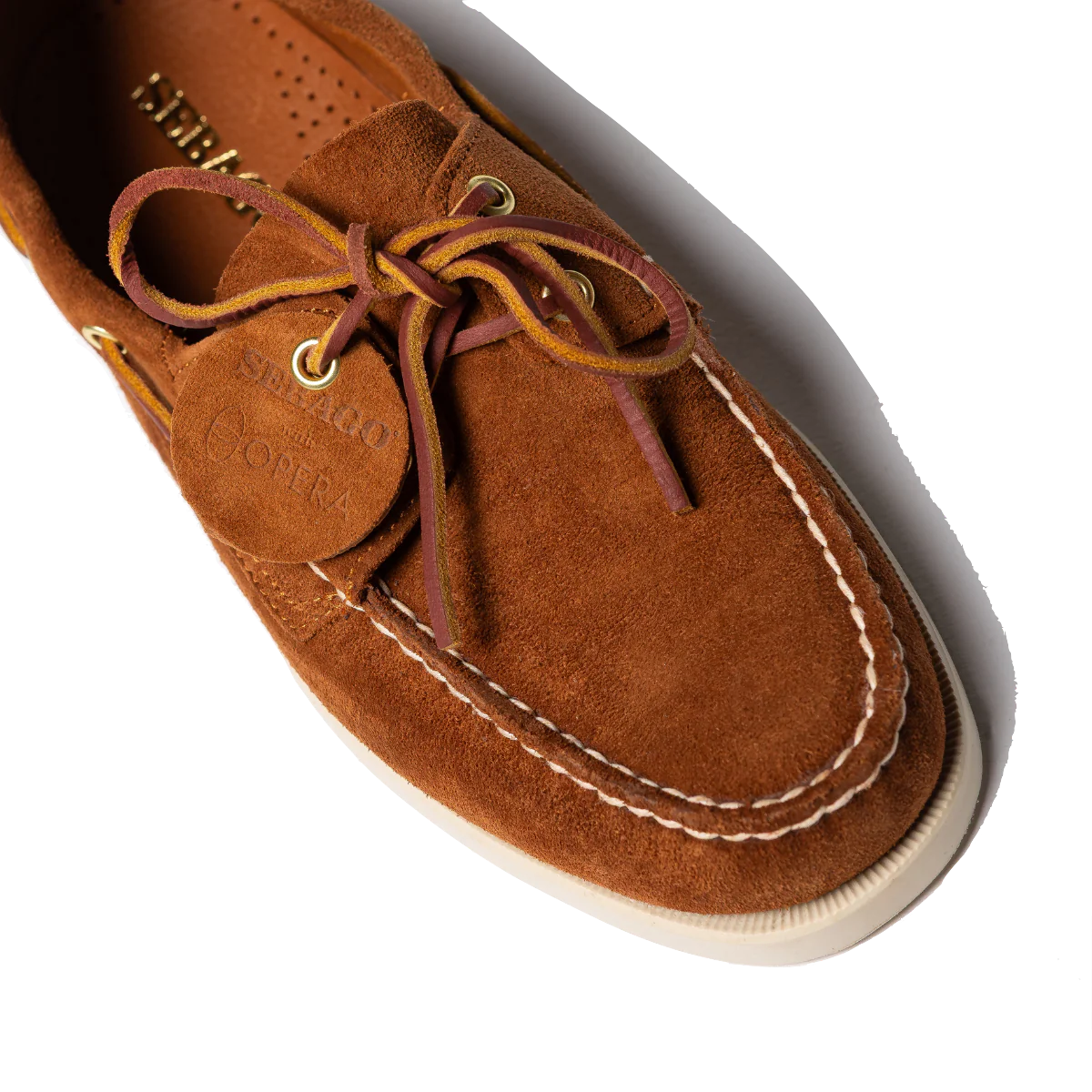 Scarpe da barca, nate dalla collaborazione tra Sebago e Opera per l’Artisan Collection: una reinterpretazione in edizione limitata dellโiconica Portland in pelle Ox Reversed. Tomaia in pelle scamosciata italiana, molto morbida, marrone tabacco. Cuciture realizzate a mano, interno sfoderato; soletta in pelle. Sistema di allacciatura a 360ยฐ in cuoio e suola in gomma bianca con striata antiscivolo