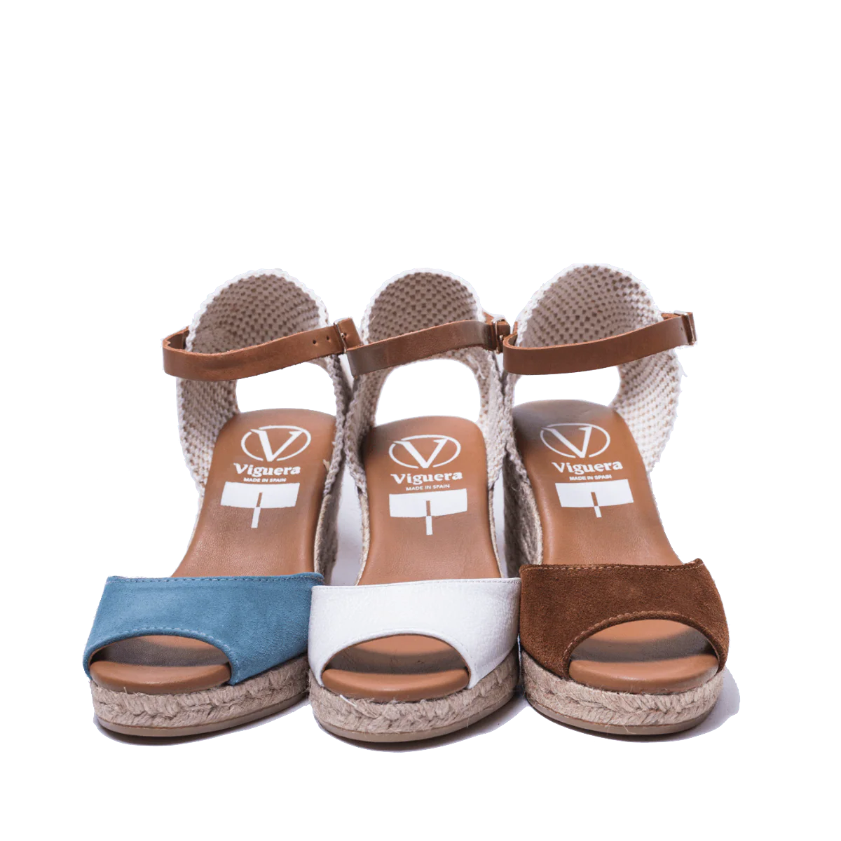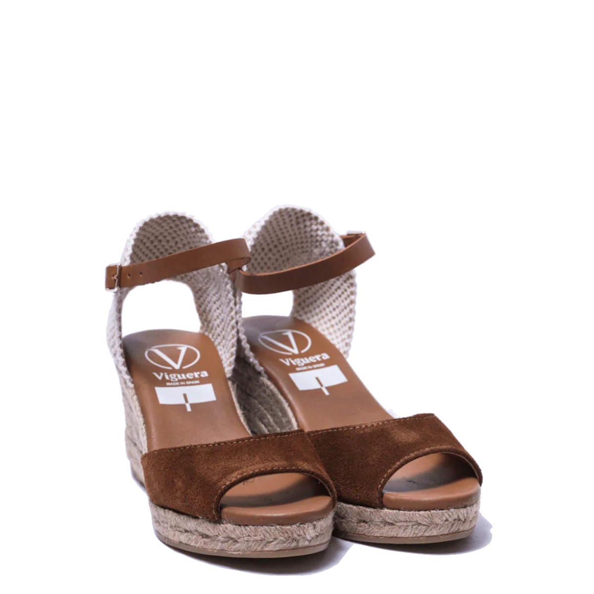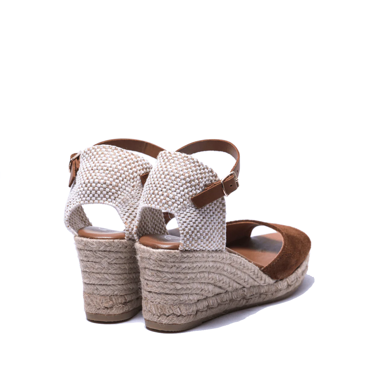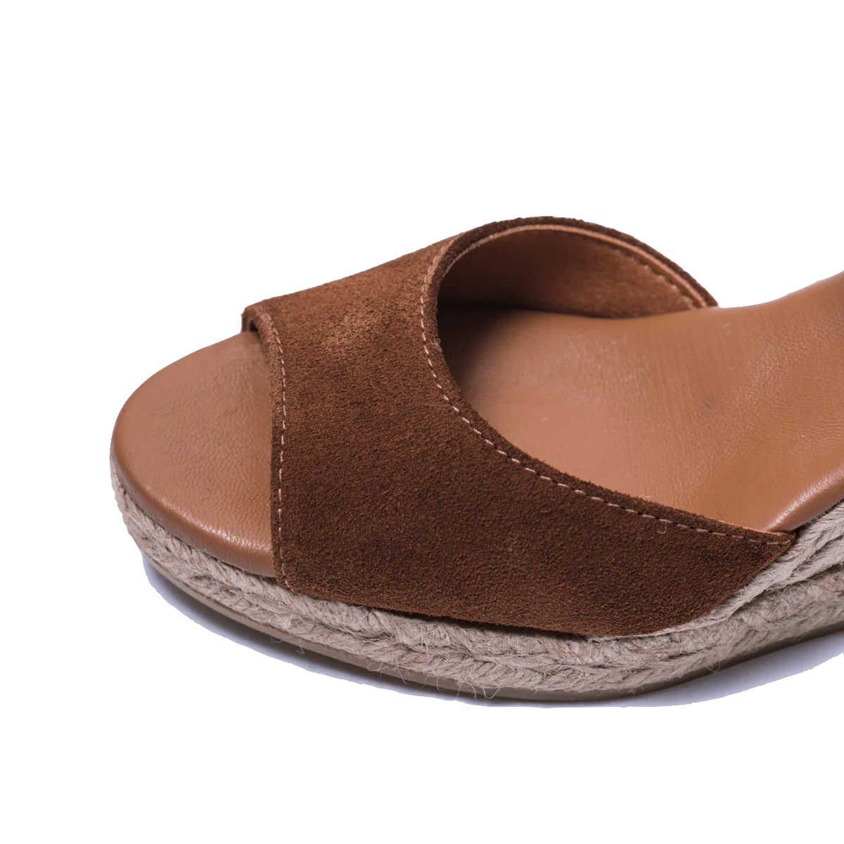 Zeppe in corda, 100% spagnole, con tomaia in pelle scamosciata marrone, fodera in pelle e sottopiede imbottito. Apertura in punta. Retro in tessuto morbido e cinturino alla caviglia, regolabile, in pelle