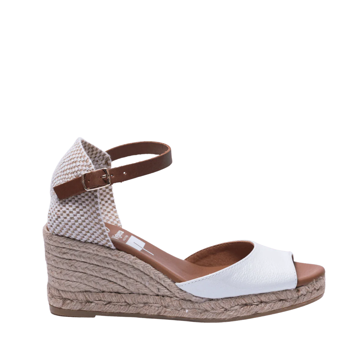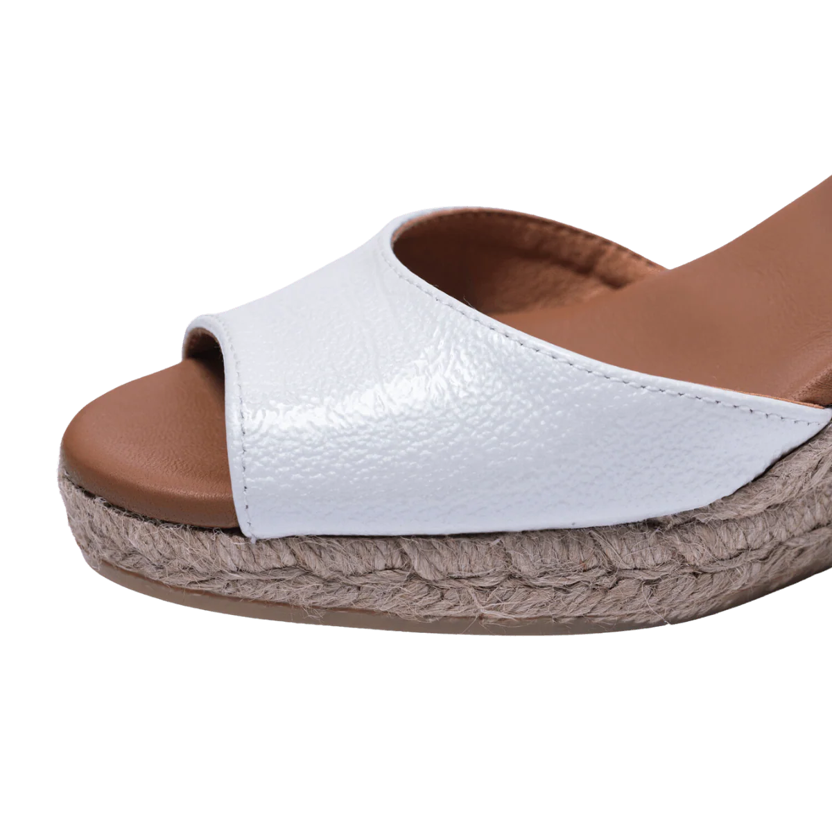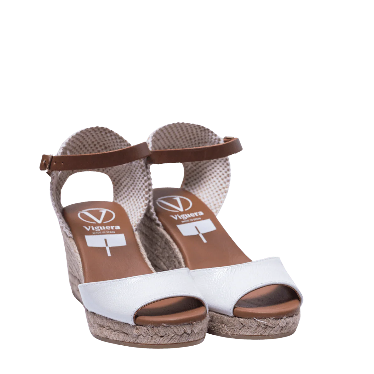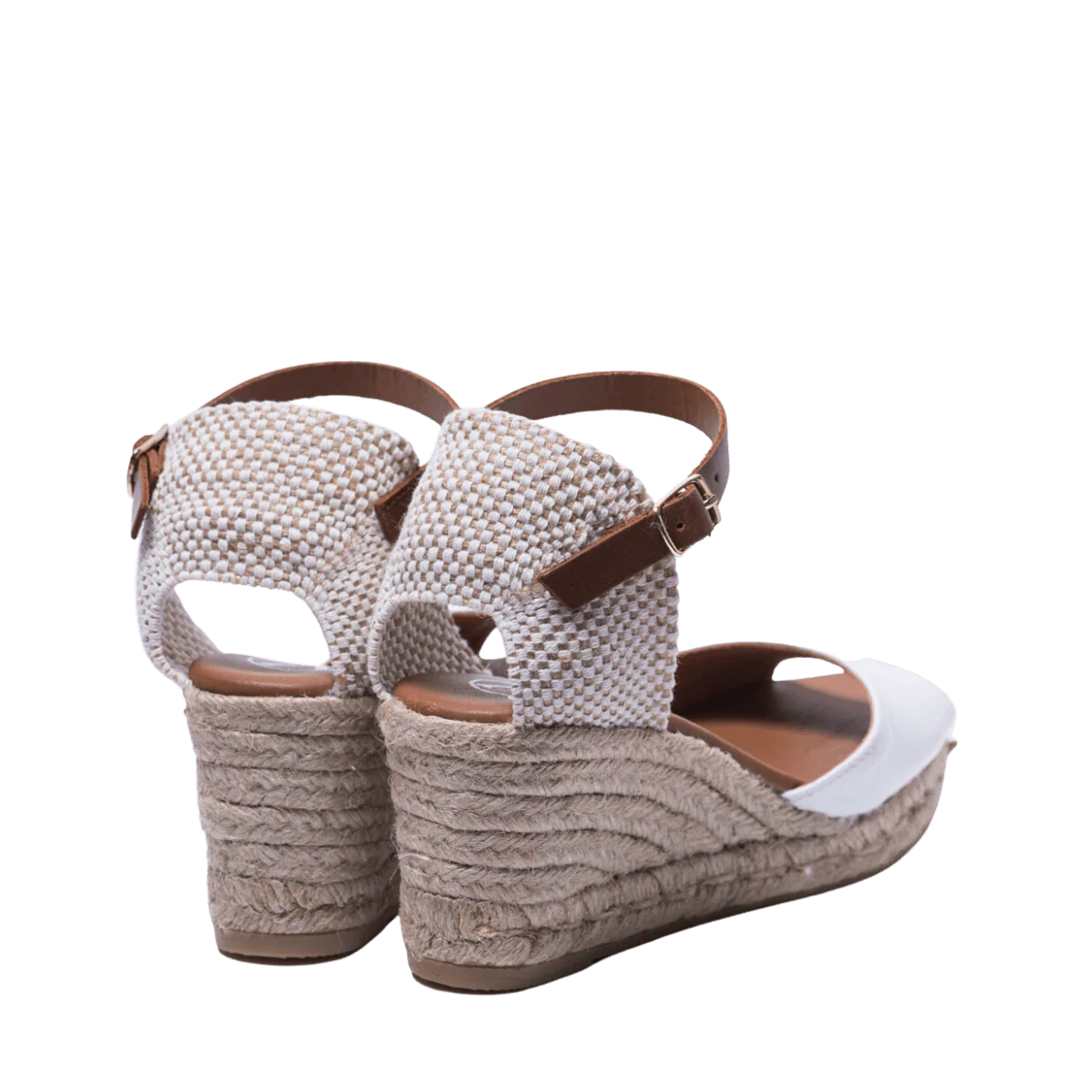 Zeppe in corda, 100% spagnole, con tomaia in pelle bianca, fodera in pelle e sottopiede imbottito. Apertura in punta. Retro in tessuto morbido e cinturino alla caviglia, regolabile, in pelle